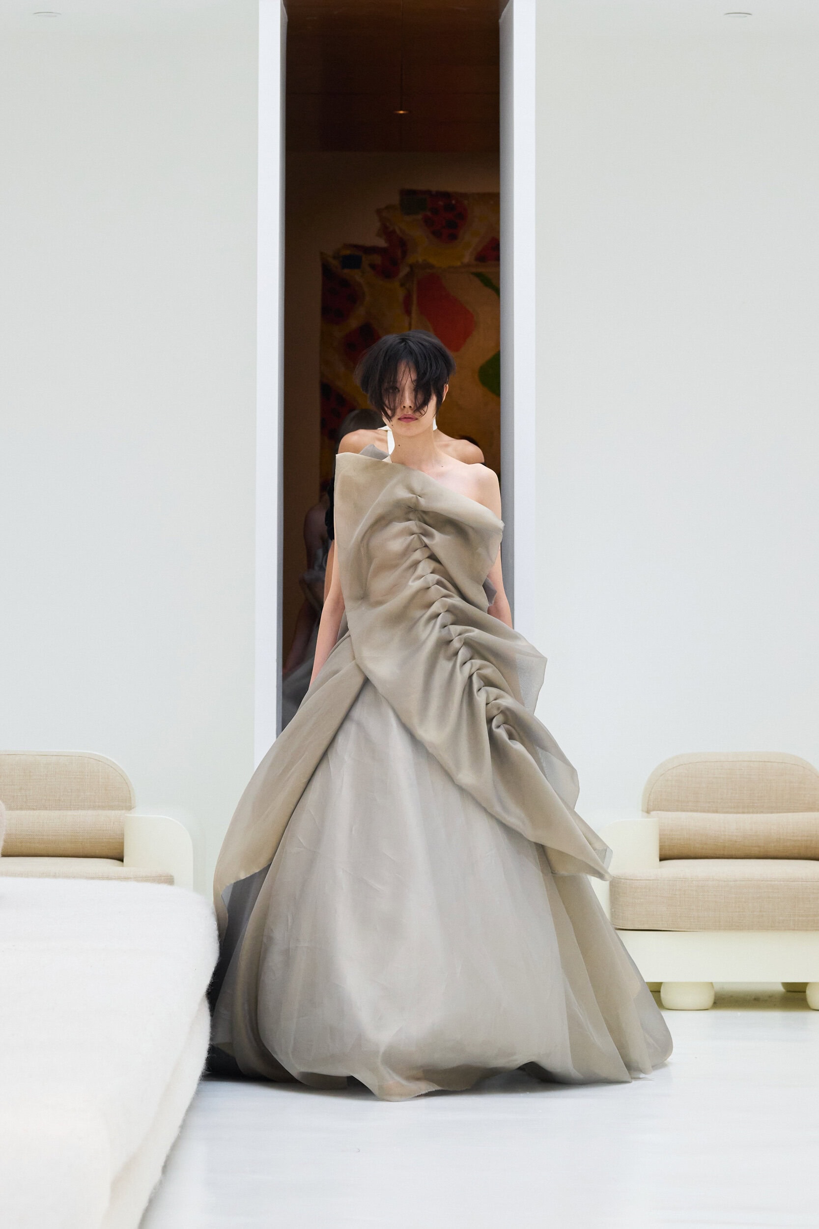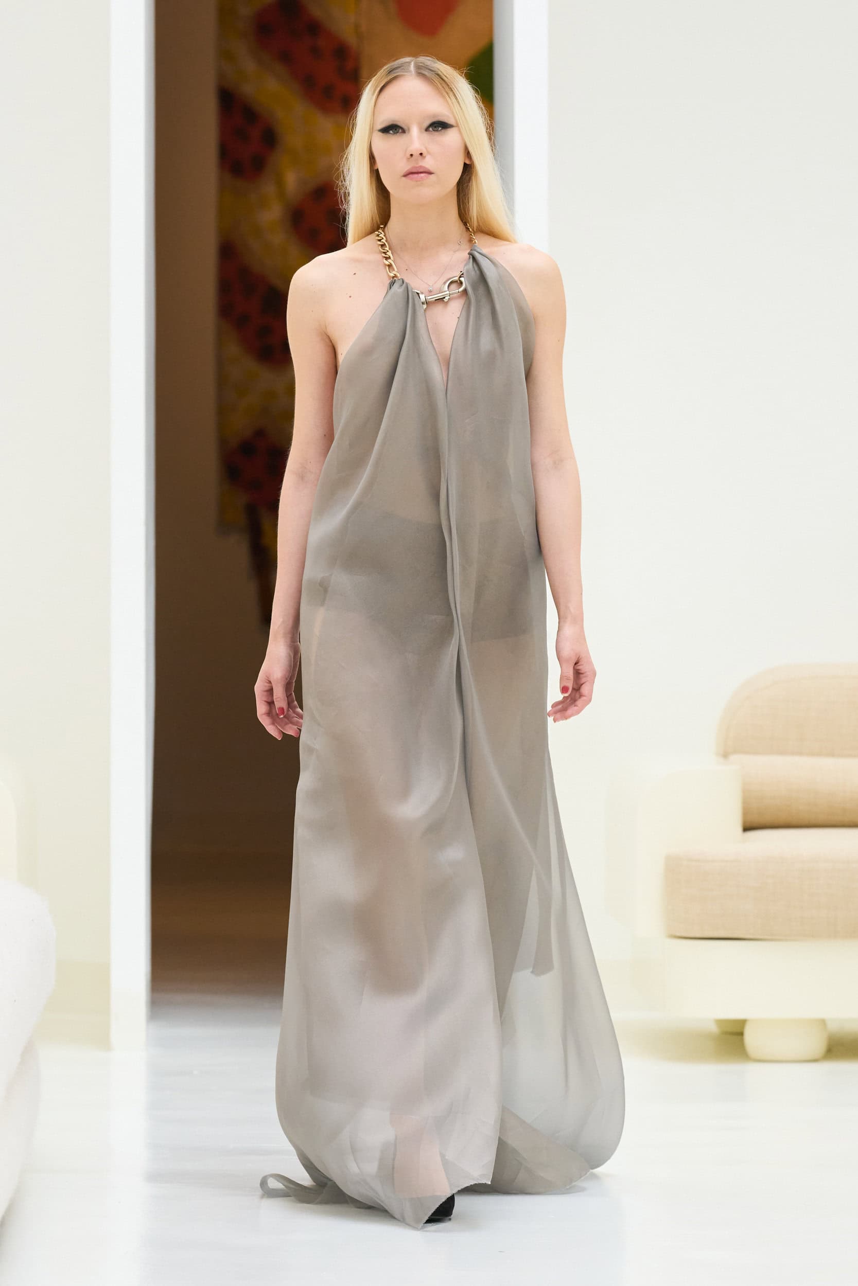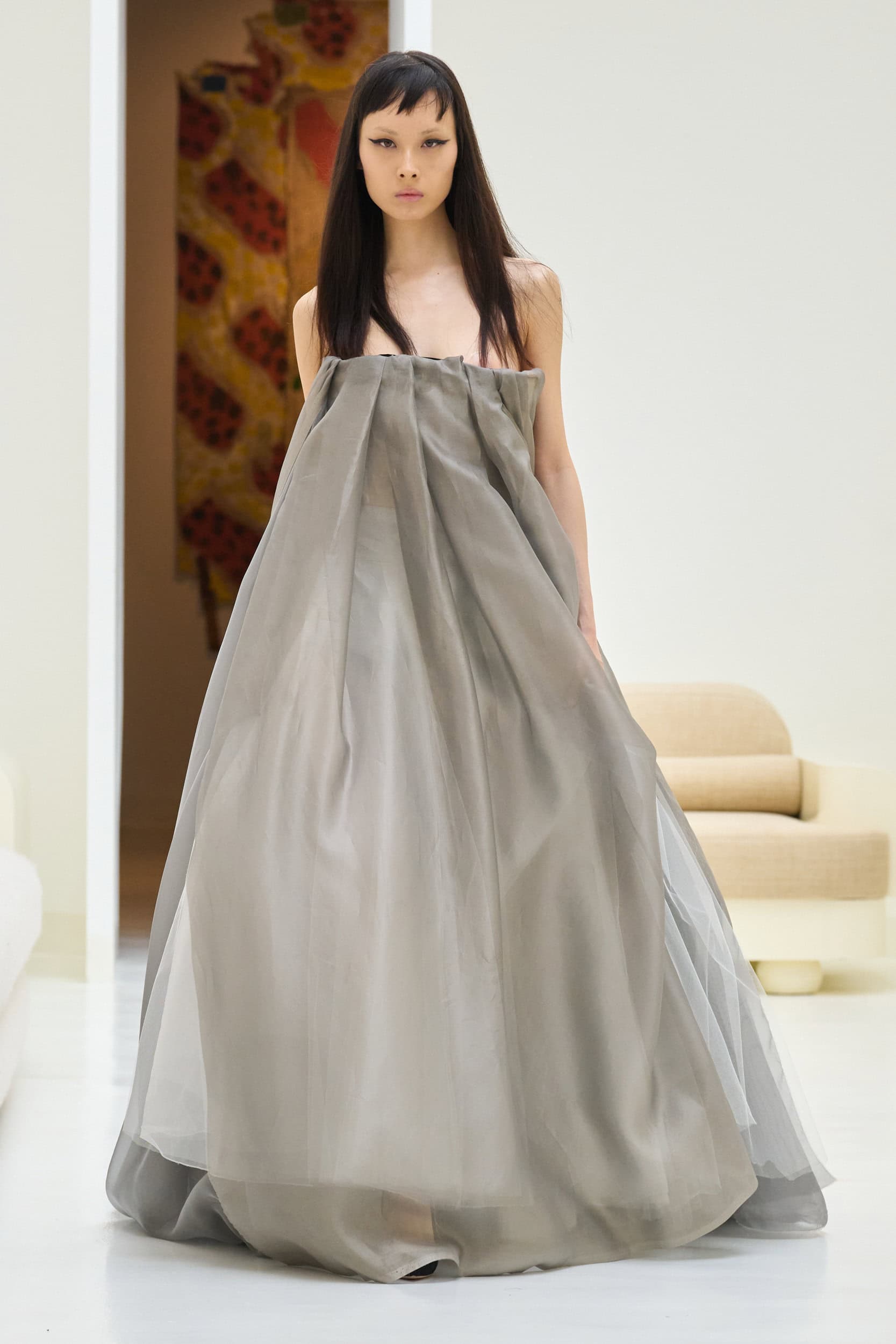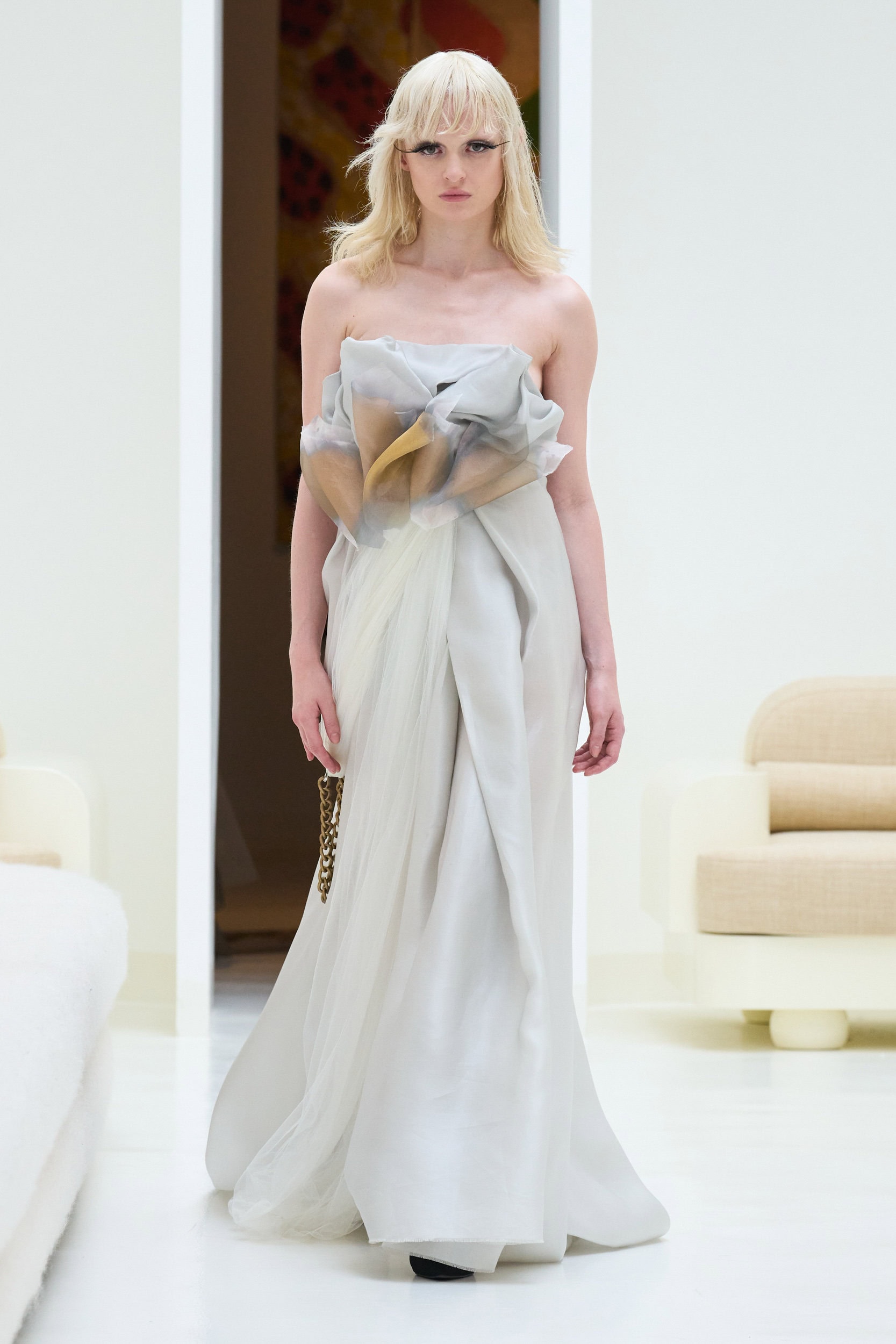 Staying true to house codes, Crociani featured undone gowns with raw hems, visible stitching, and upcycled jewelry, incorporating more layers for added volume this season.