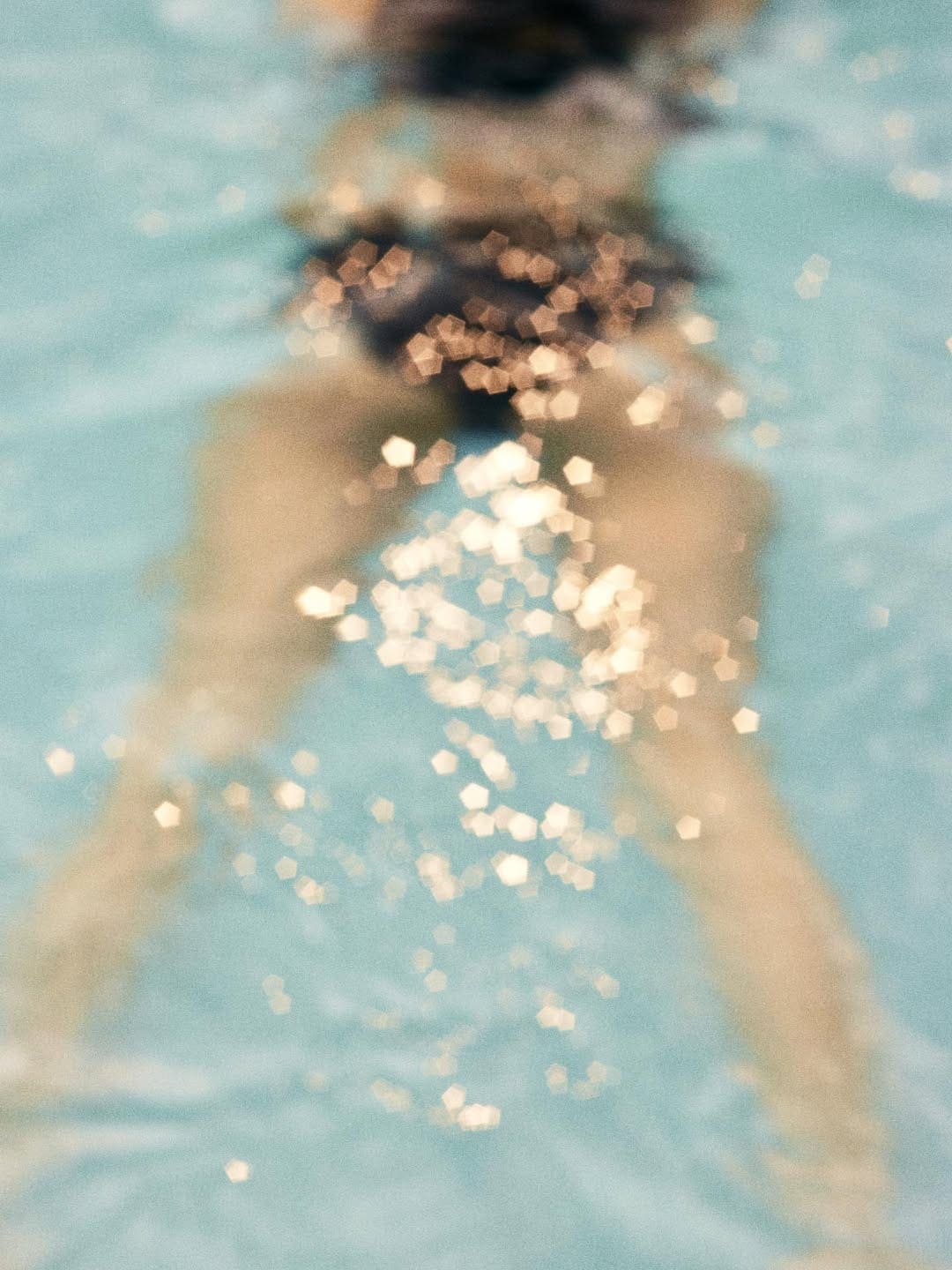 The visual language centers on a figure submerged in water, captured in a haze of refracted sunlight and granular sparkle. The image resists clarity: limbs blur into the surrounding blue, while points of light scatter across the surface like sequins in motion. It’s a study in distortion, where the familiar codes of fashion photography—pose, silhouette, detail—are submerged beneath texture and mood. What emerges instead is a feeling of weightlessness, a quiet surrender to the environment.