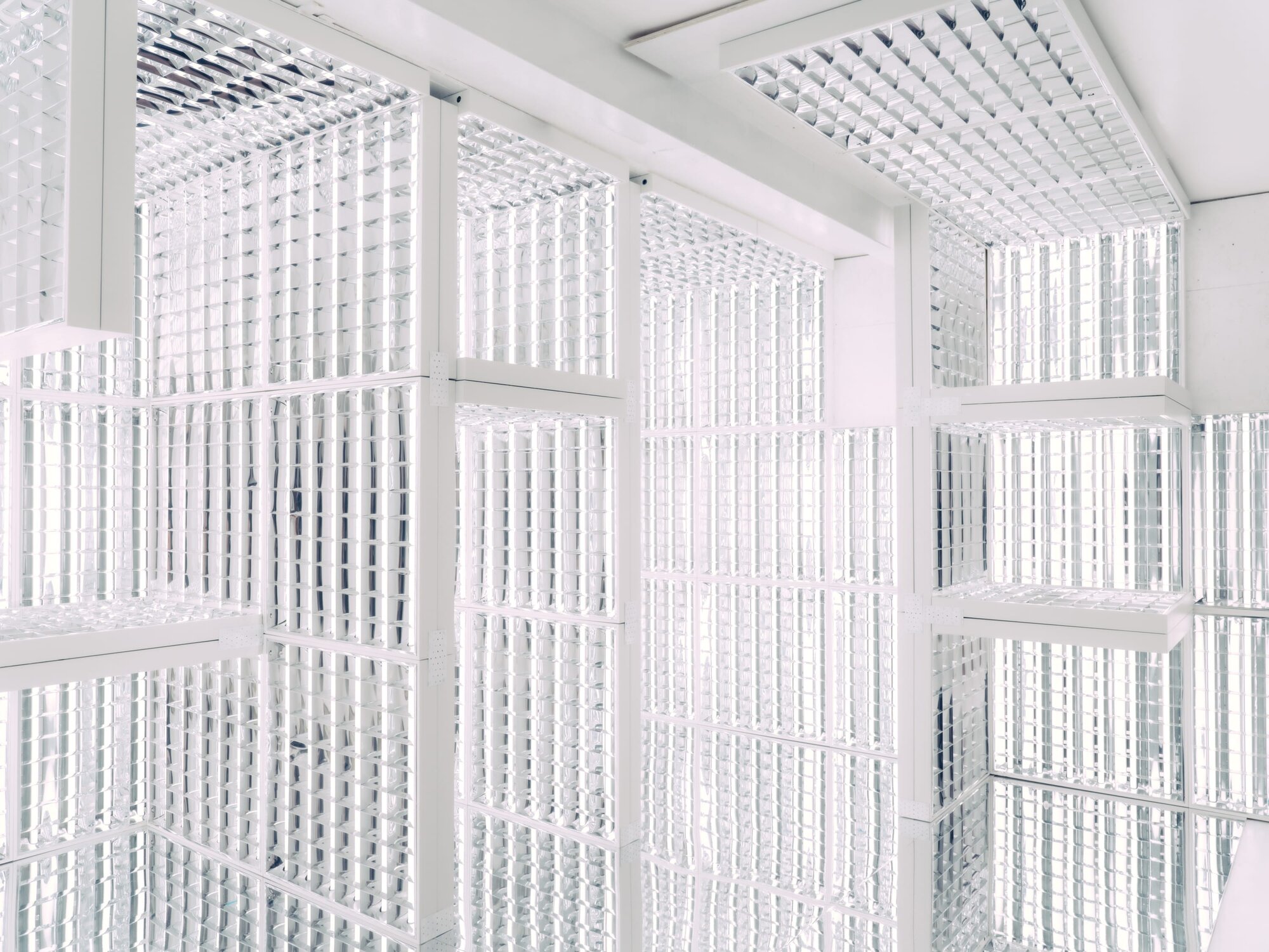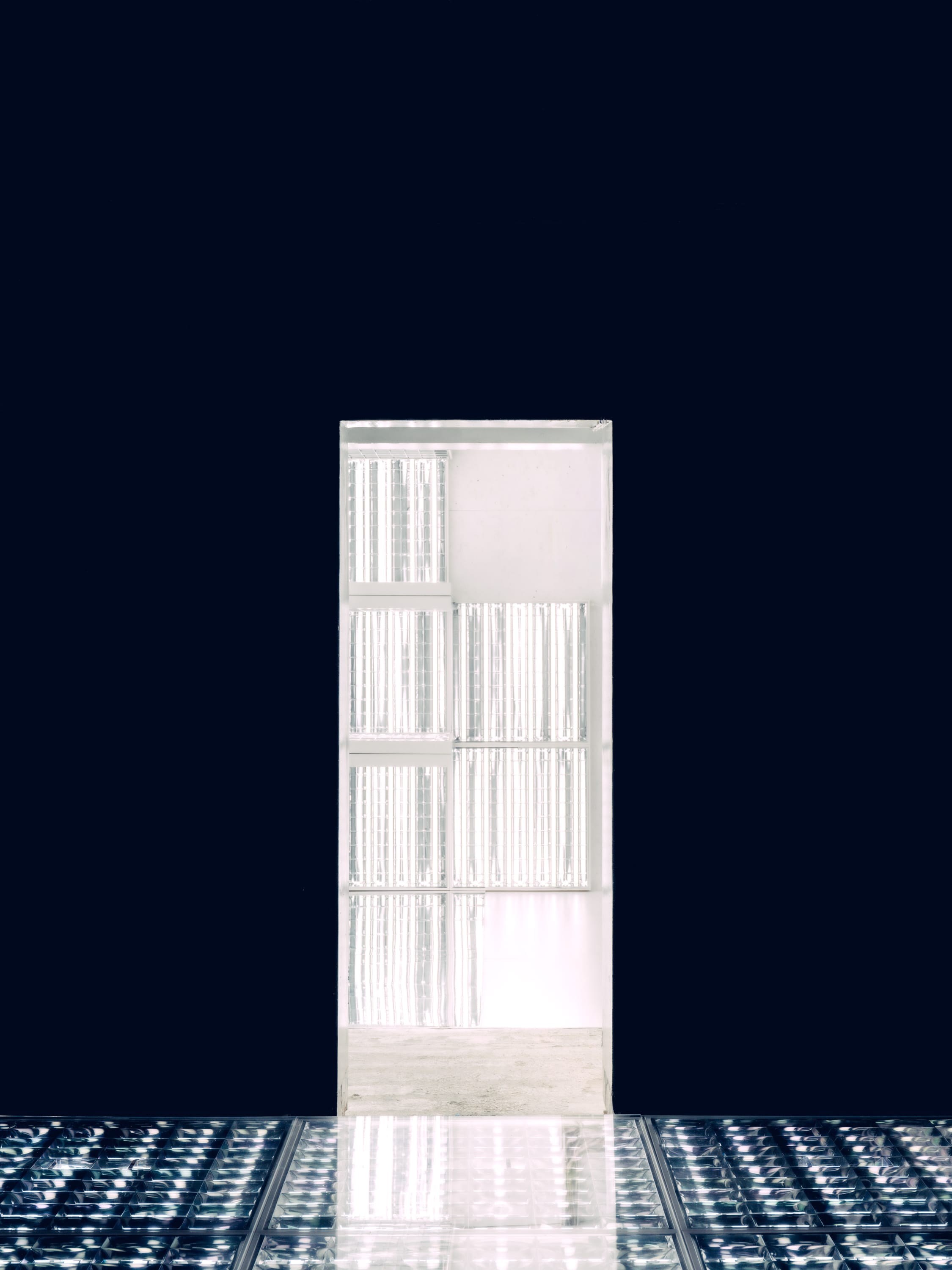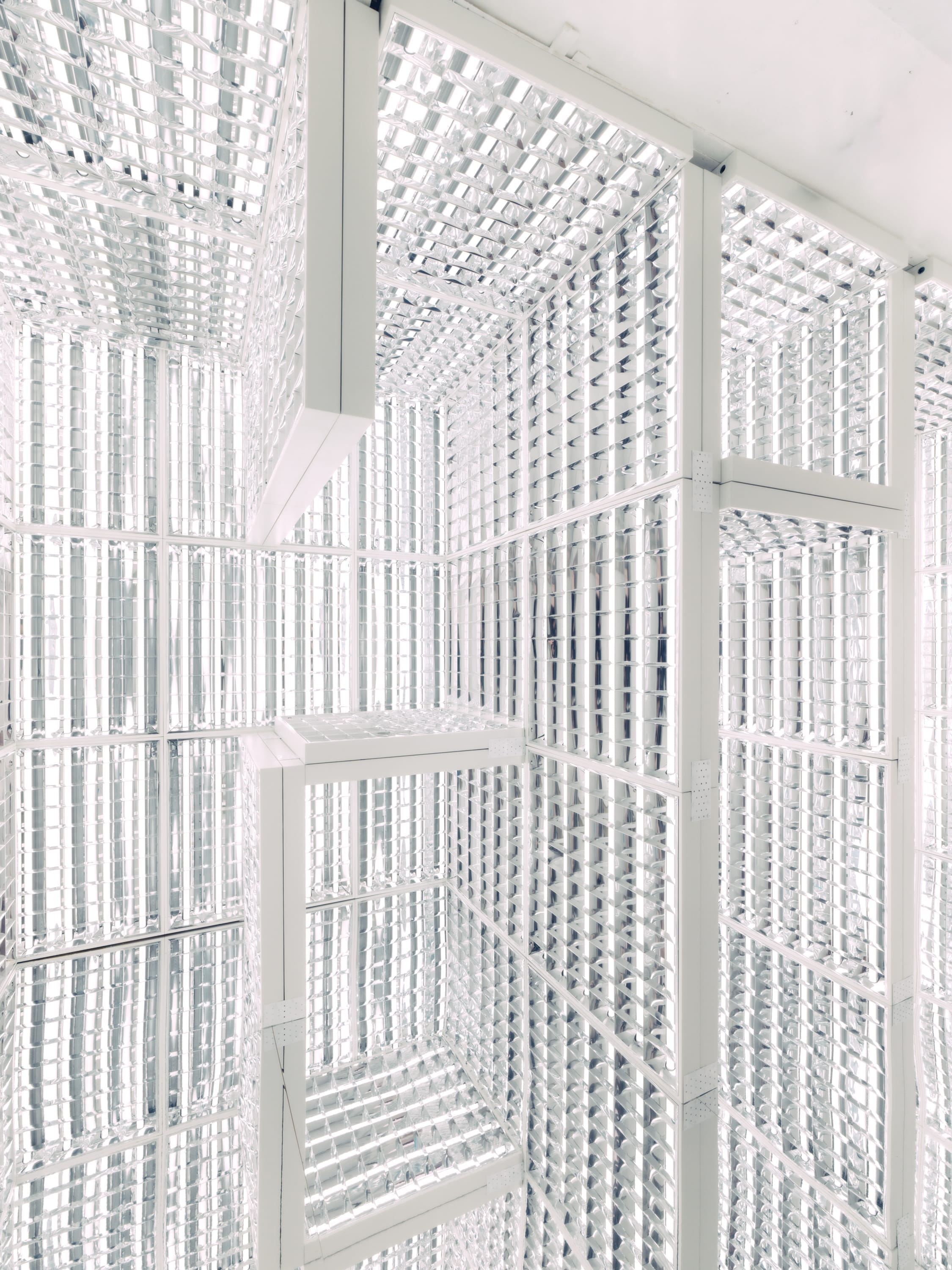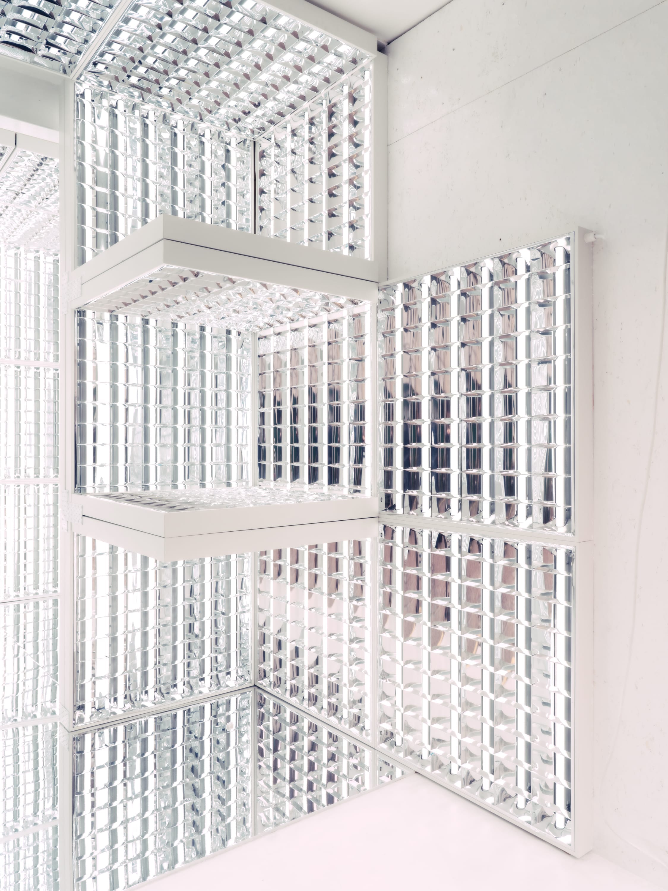 As we talk, the room begins to light up; a grid of LEDs pulses softly to life. Reflections multiply across panels, shifting from violet to white. The structure — his first independent installation — feels cinematic and intimate, an echo of the atmospheres he once created for others.