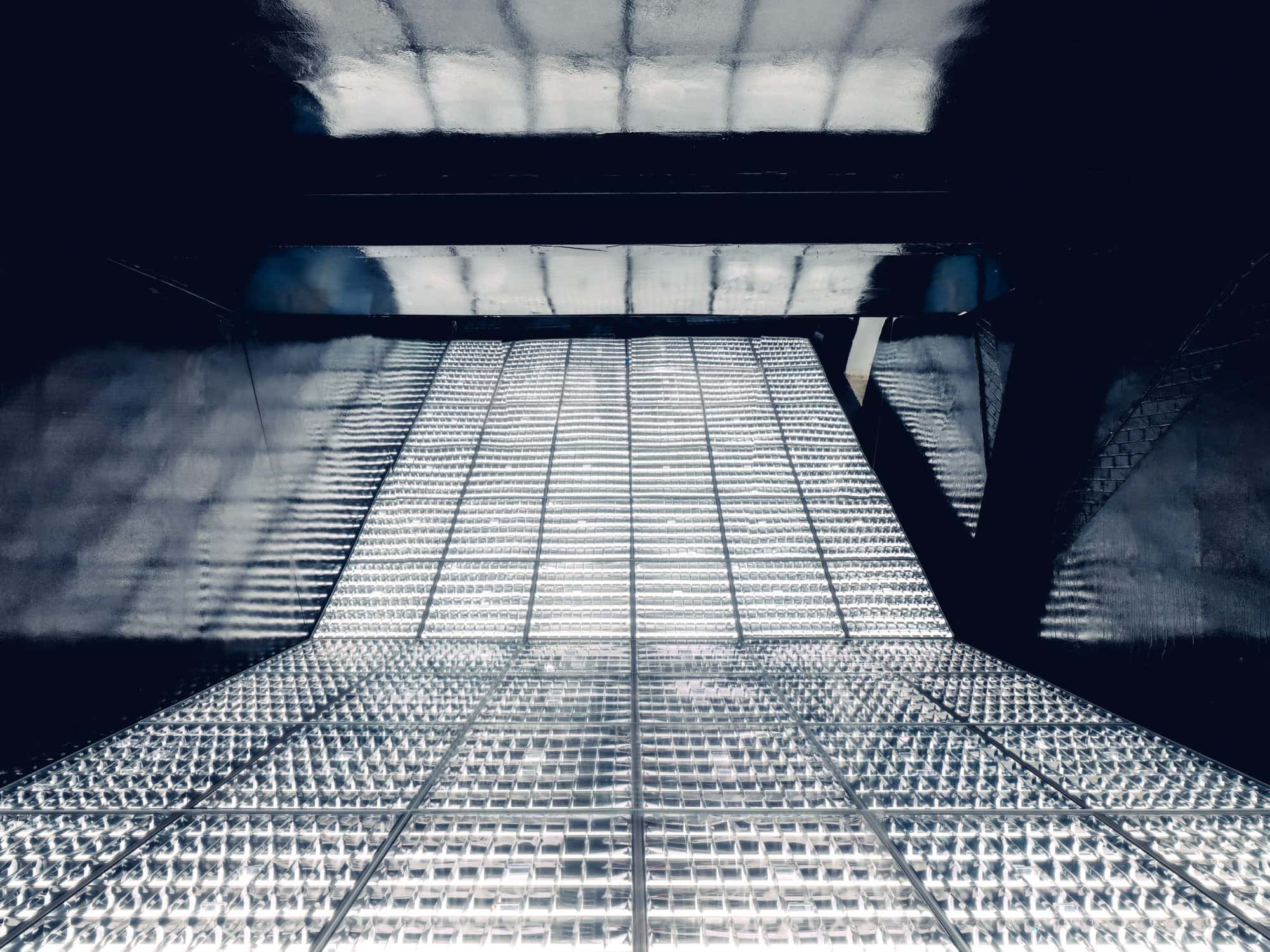 As the installation around him flickers into full light, the effect is hypnotic — a quiet constellation of reflection and refraction, a runway for no one but the viewer.