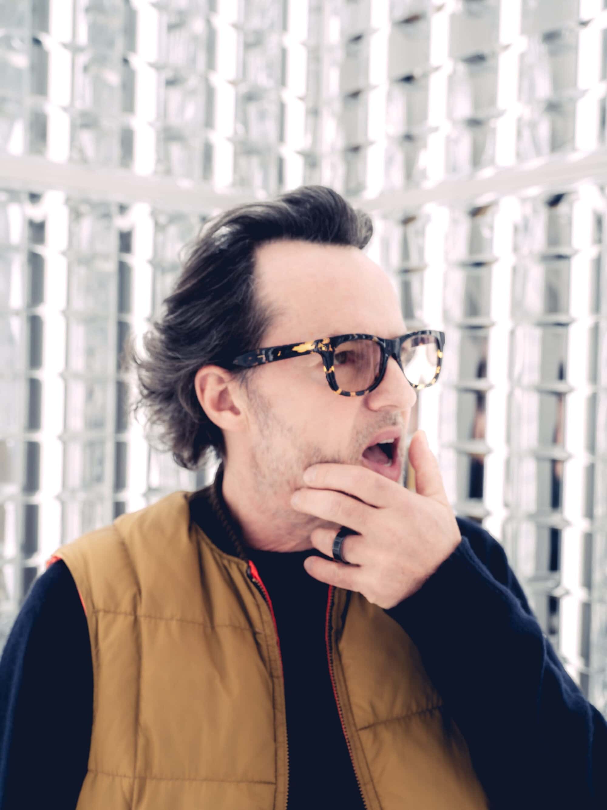 “I’ve spent my life designing frames for others,” he says, looking out toward the mirrored walls. “Now the frame is the subject.”