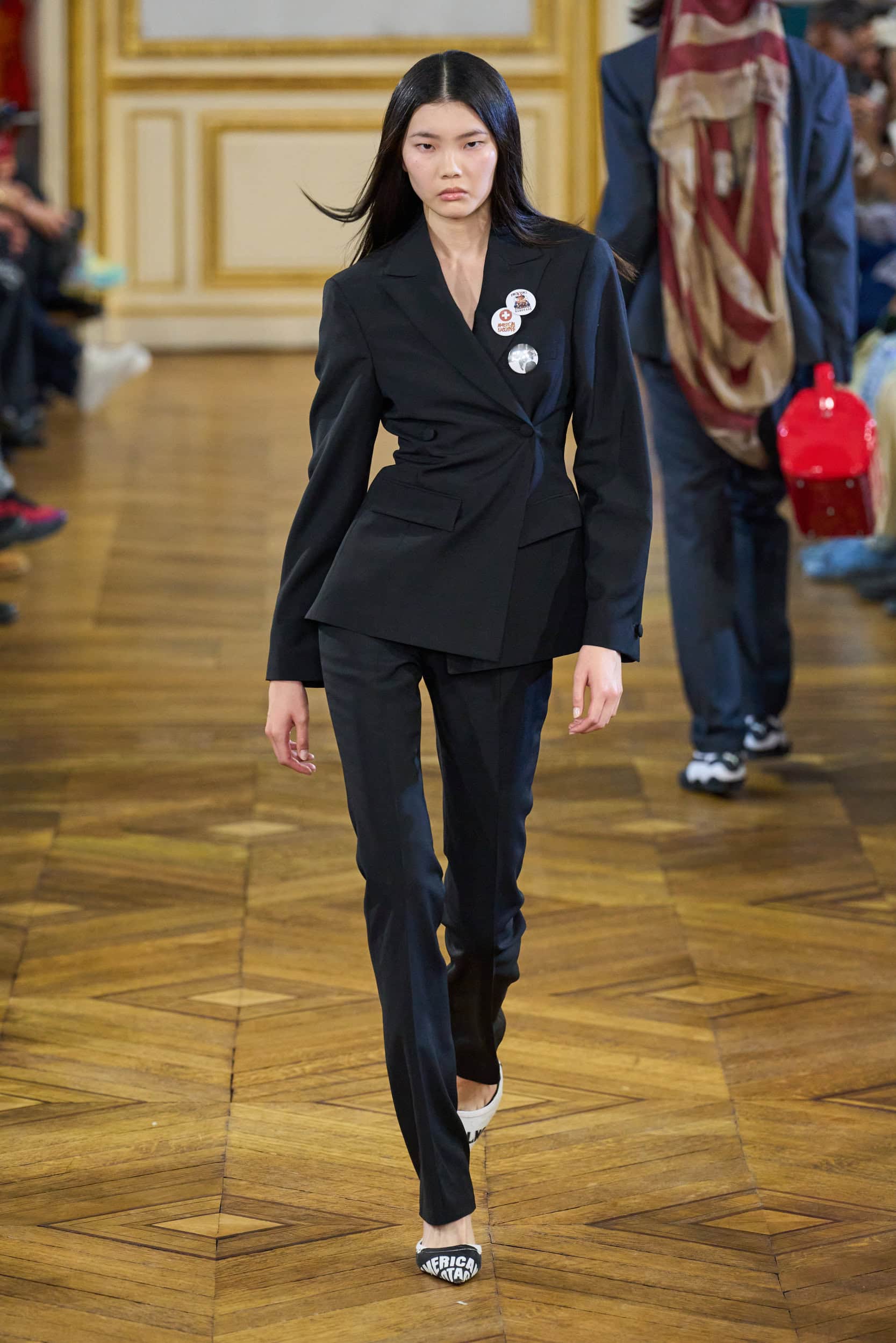 Rocky’s collection featured unconventional designs, such as backless business suits and layered hip-hop style outfits with multiple waistbands. The rapper described the collection as “political satire,” inspired by poverty, mass incarceration, and capitalism.