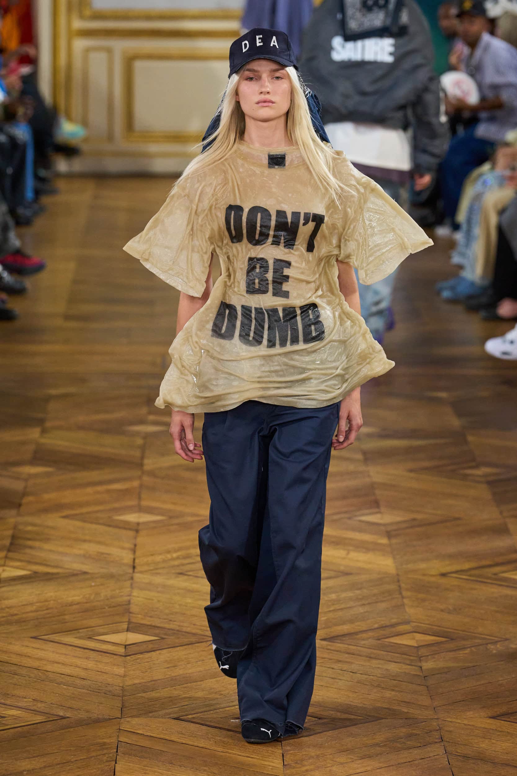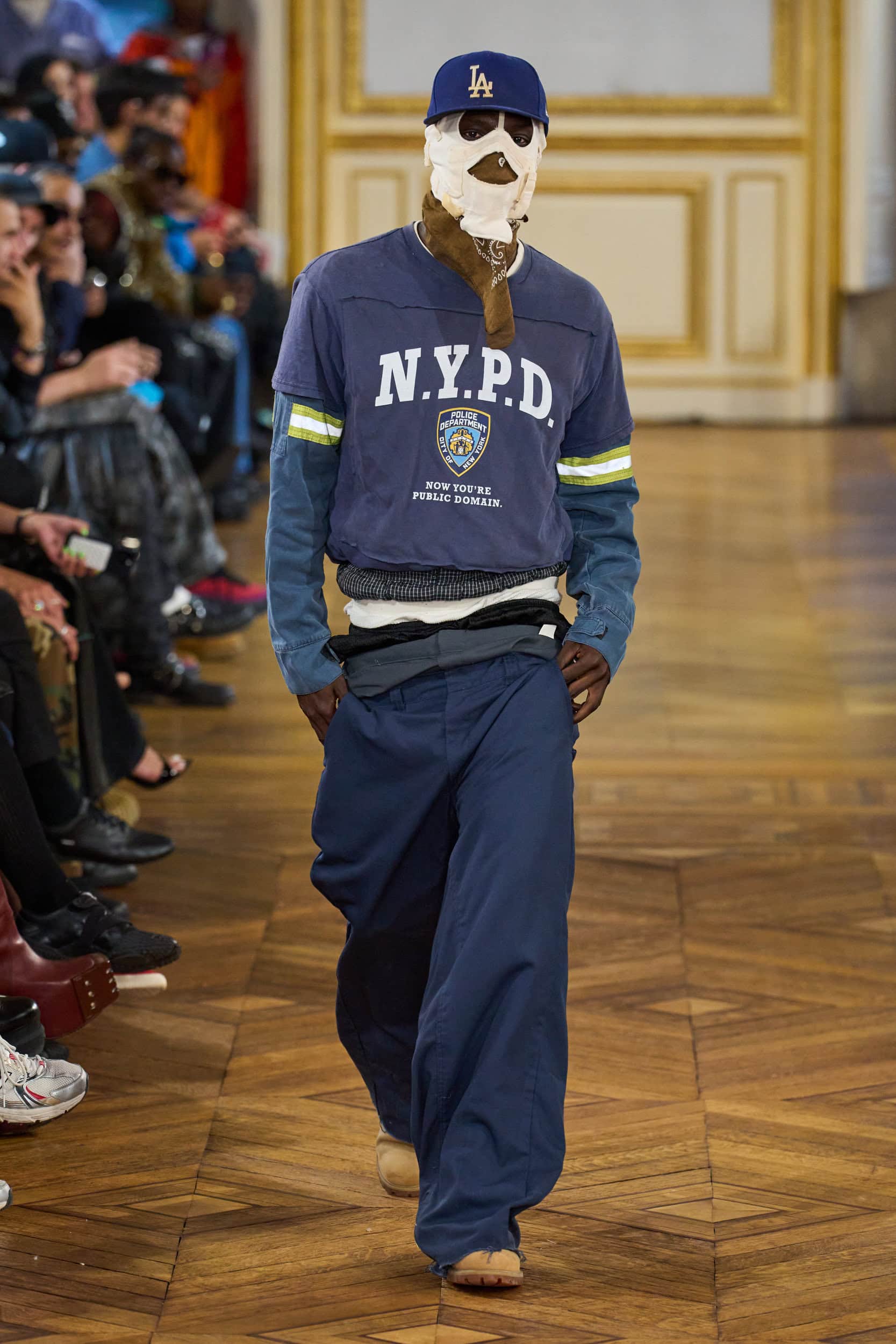 The collection also incorporated upcycled and repurposed items like NYPD sweatshirts and DEA baseball caps. Merchandise featuring the brand’s name and collaborations from Alpine Cars, Puma, Ray-Ban, and Shopify were available for purchase.