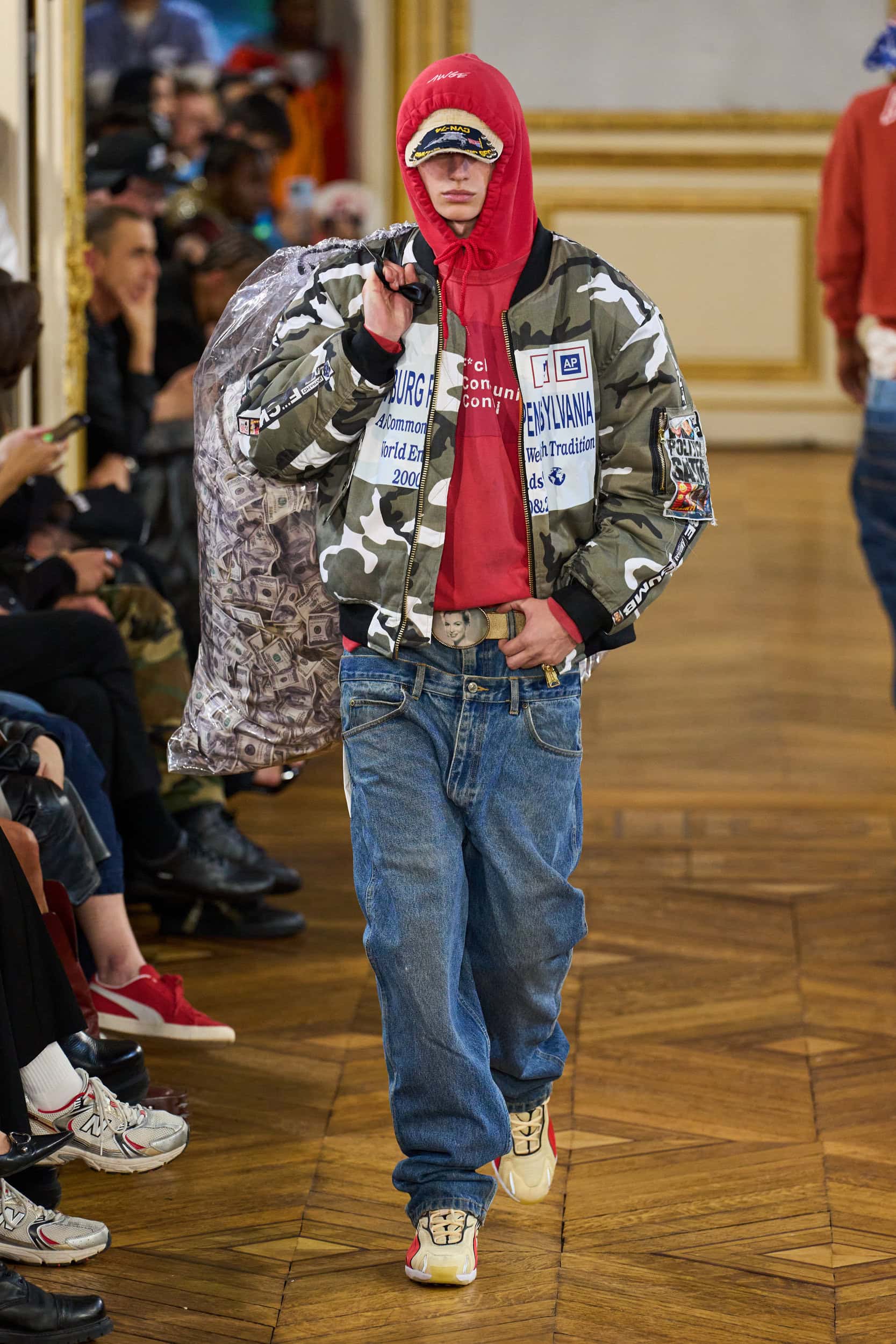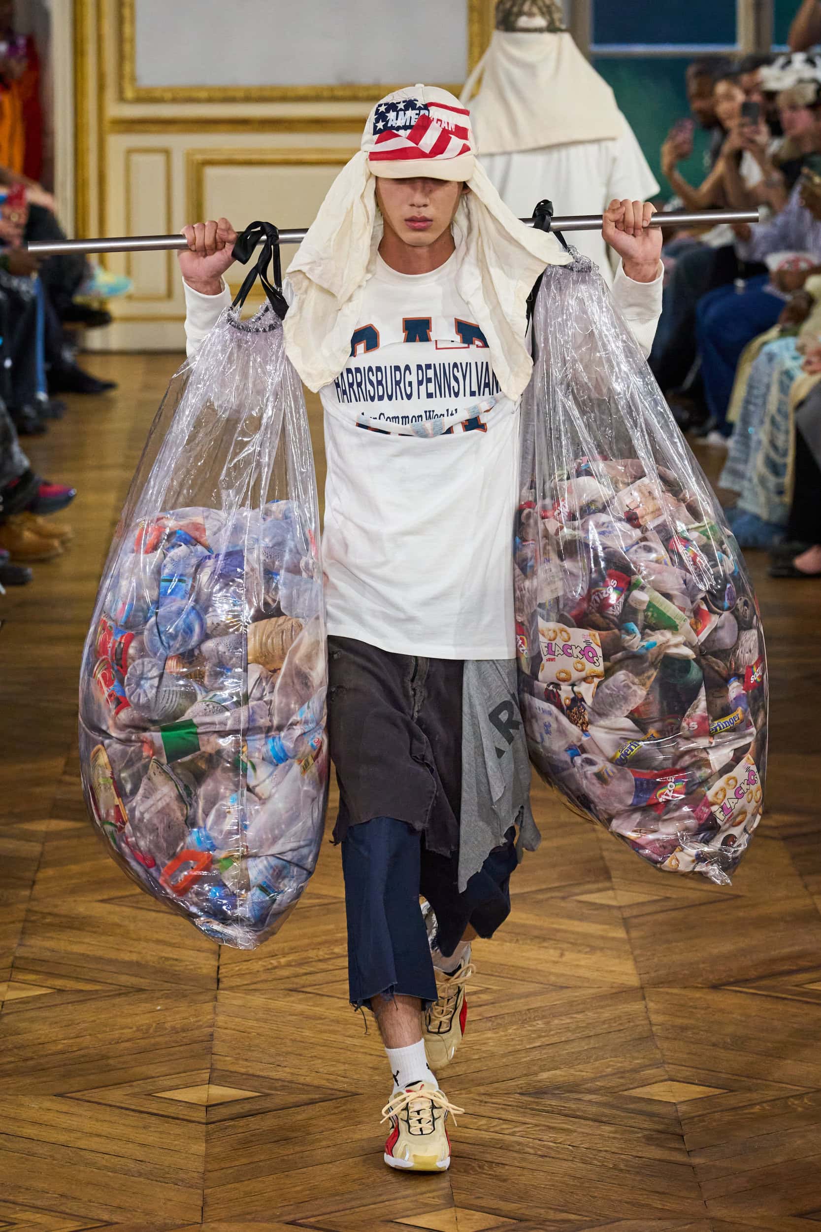 Notable looks included models carrying garbage bags full of money and outfits embellished with references to American symbols like the flag and Uncle Sam. Rocky drew inspiration from personal experiences, including growing up in a homeless shelter.