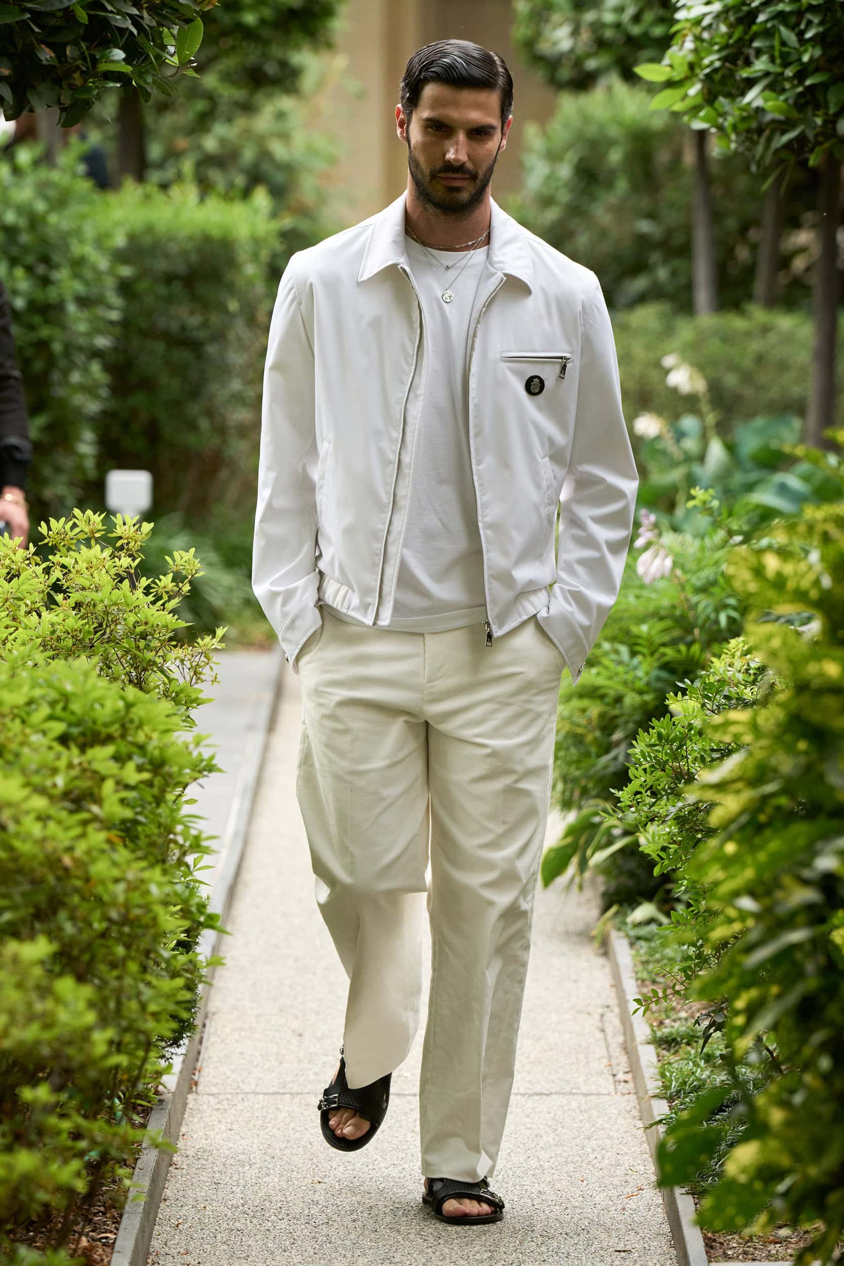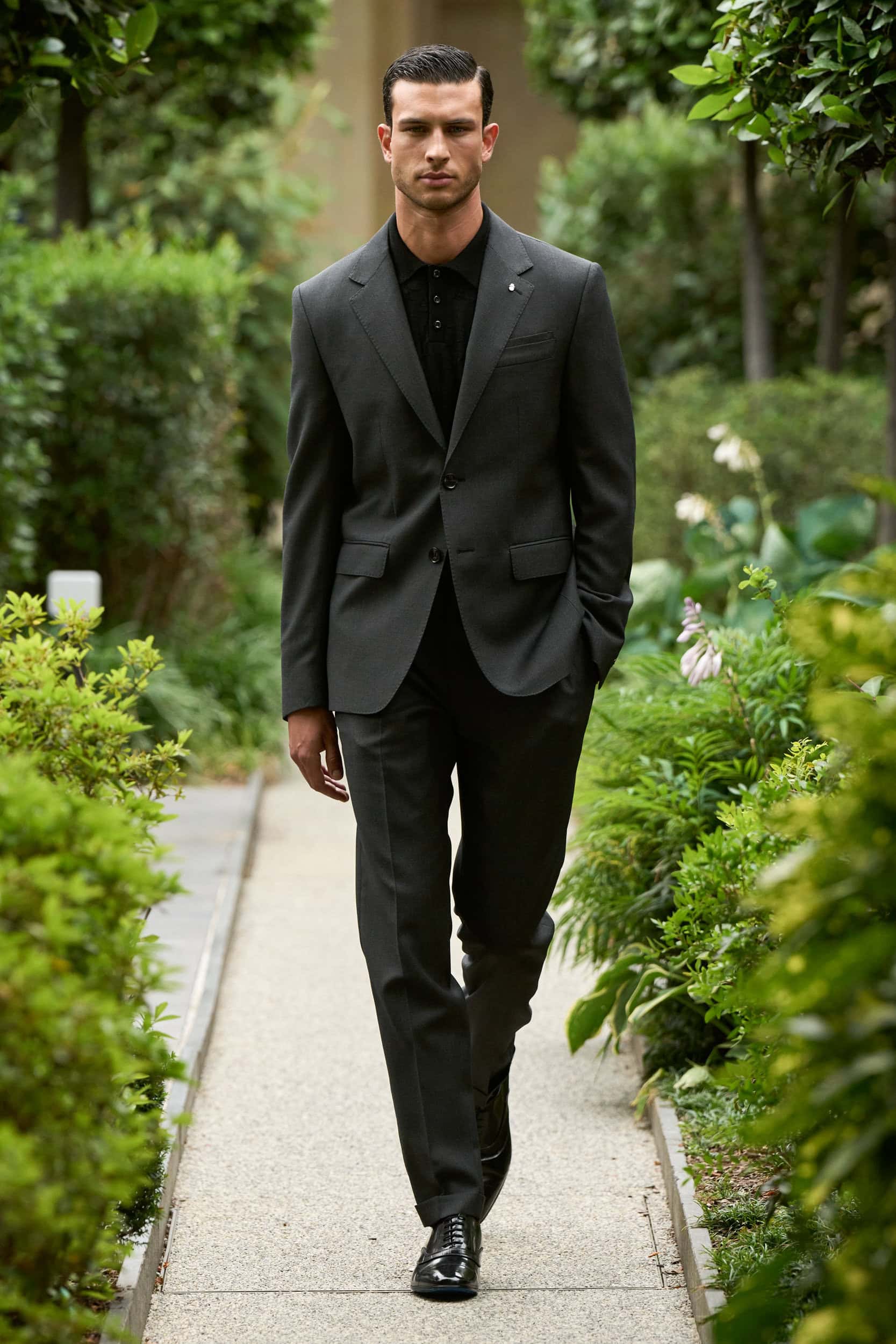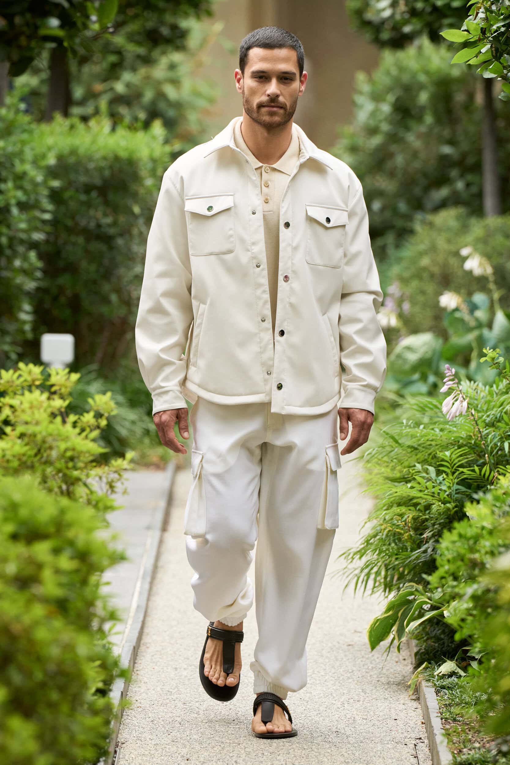 In his buttoned-up vision of masculinity, there will be space for ease next spring in slightly more casual looks with appealing flared tailored pants paired with tonal bomber jackets and a workwear suit comprising cargo pants and an overshirt, both crafted from tailoring textiles.