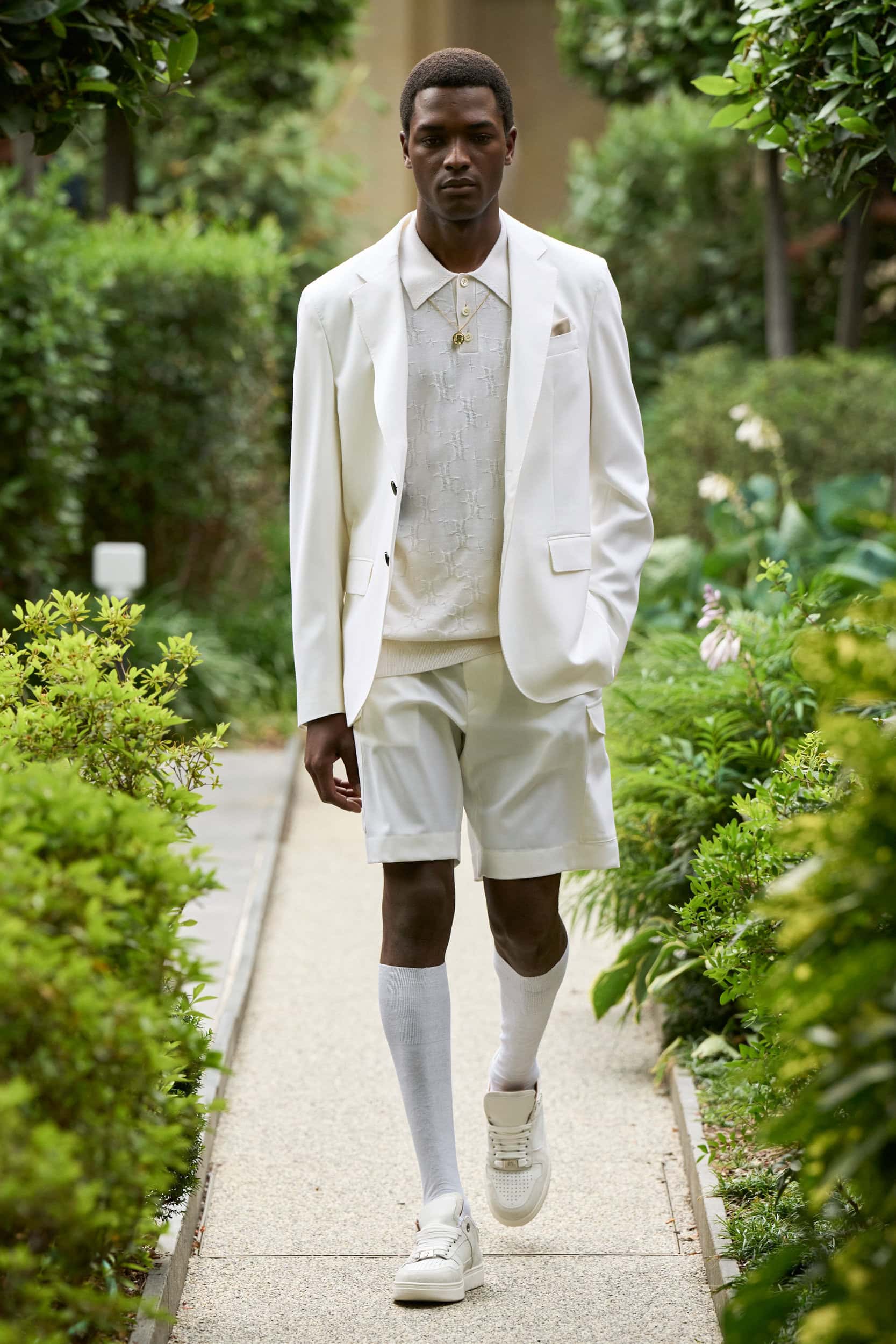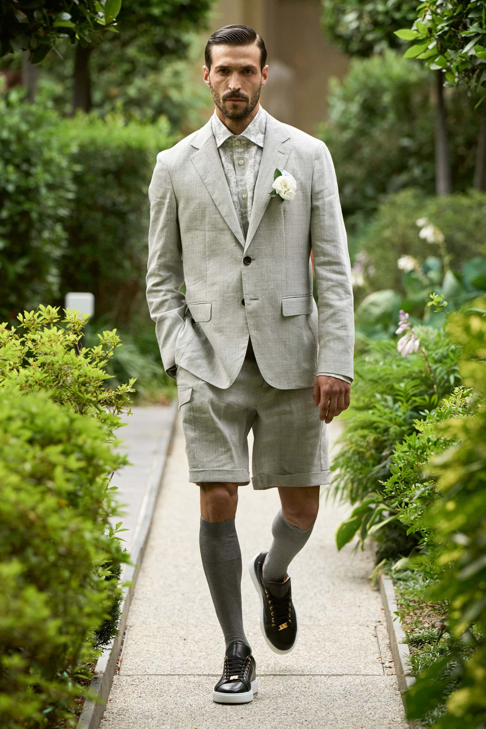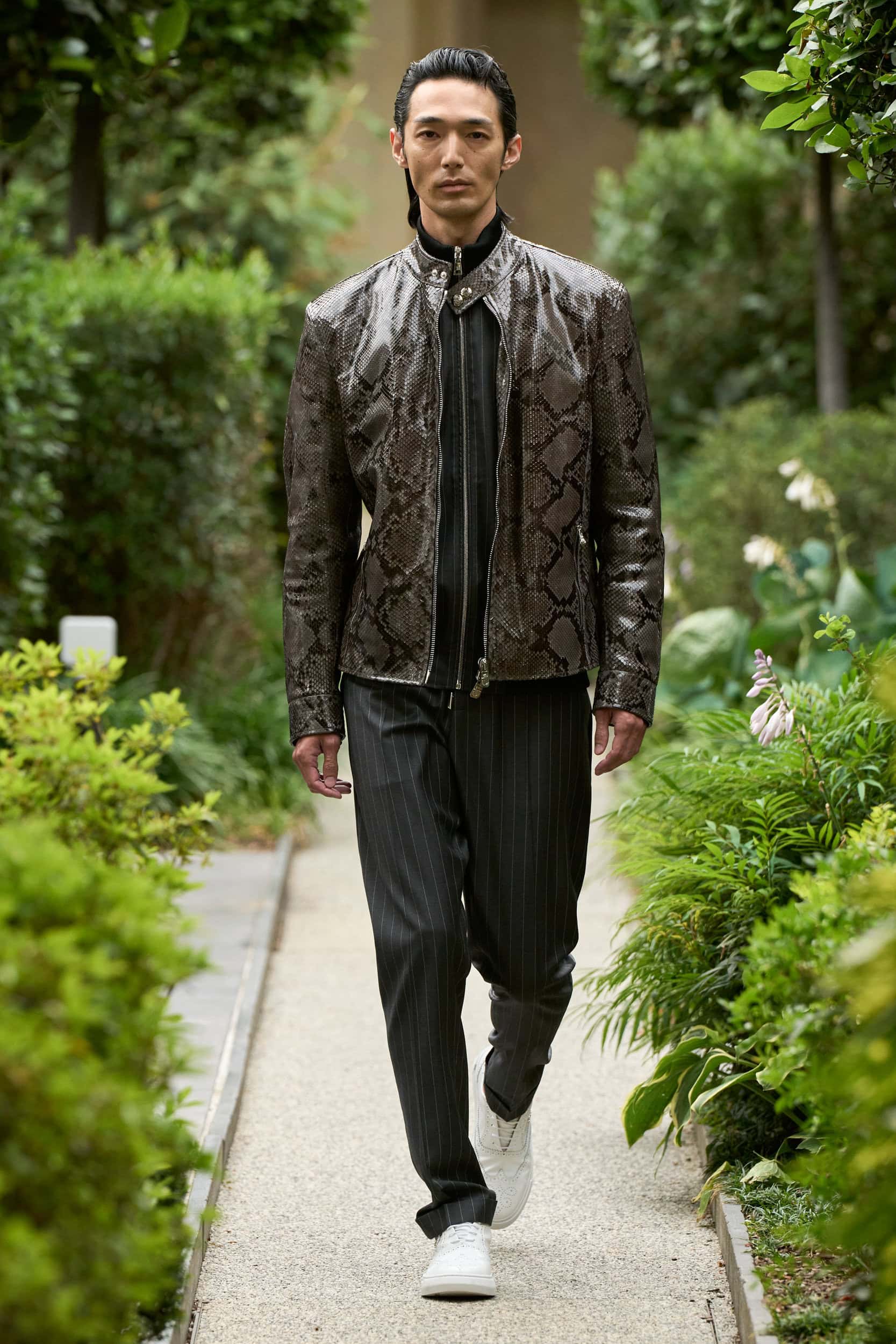 In his buttoned-up vision of masculinity, there will be space for ease next spring in slightly more casual looks with appealing flared tailored pants paired with tonal bomber jackets and a workwear suit comprising cargo pants and an overshirt, both crafted from tailoring textiles.