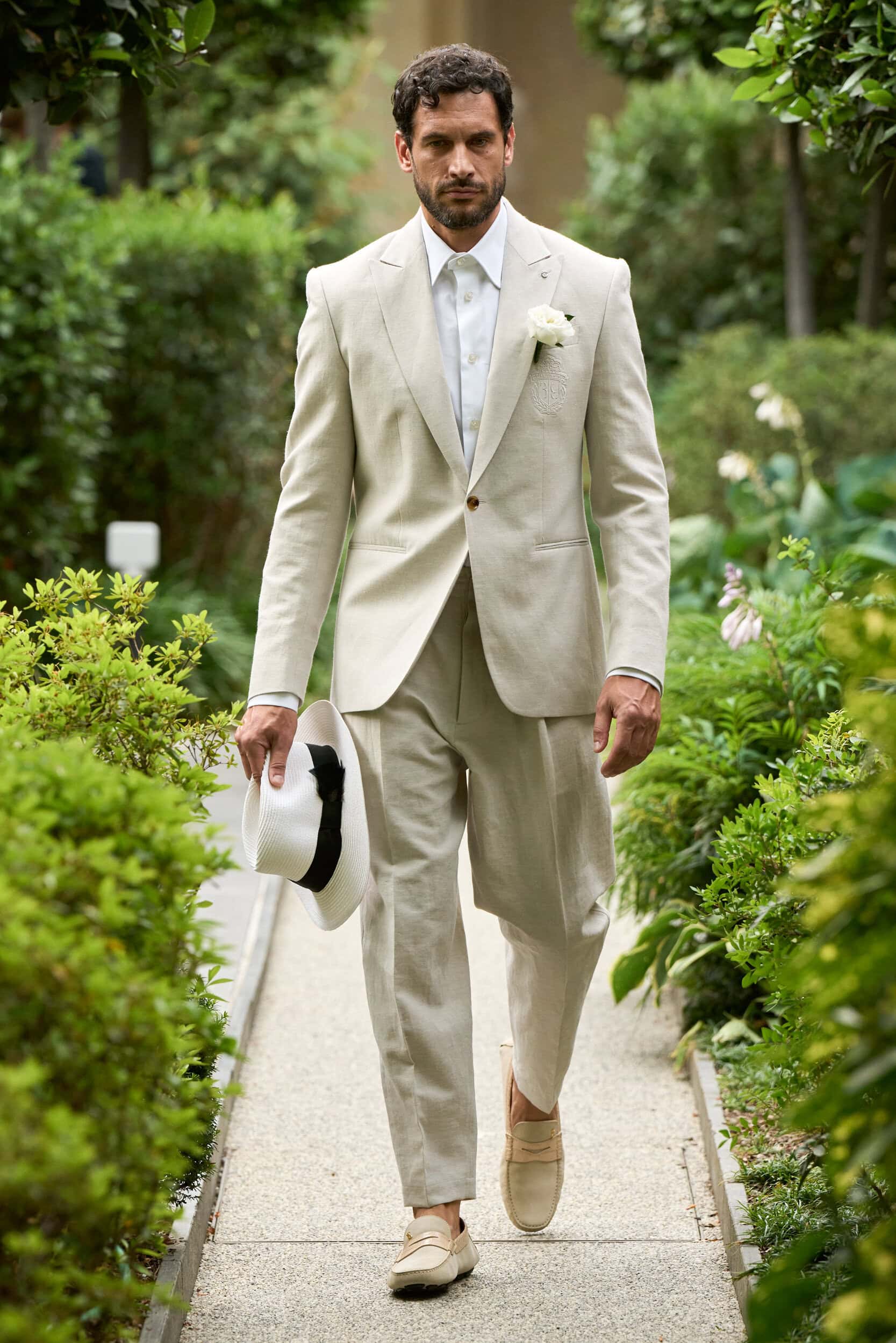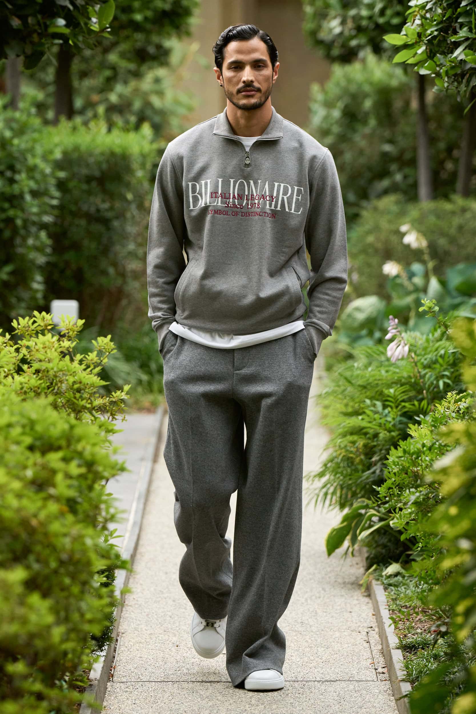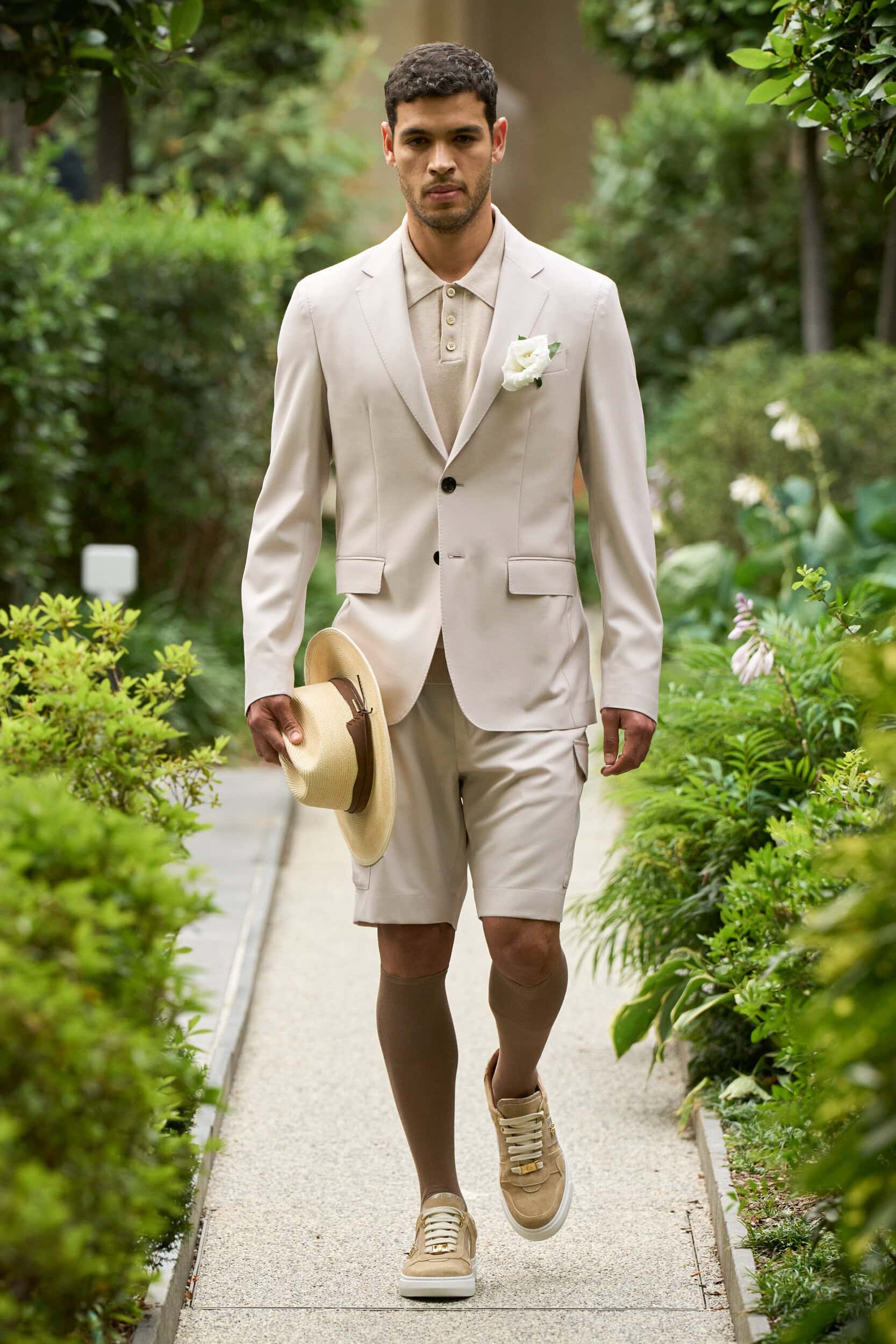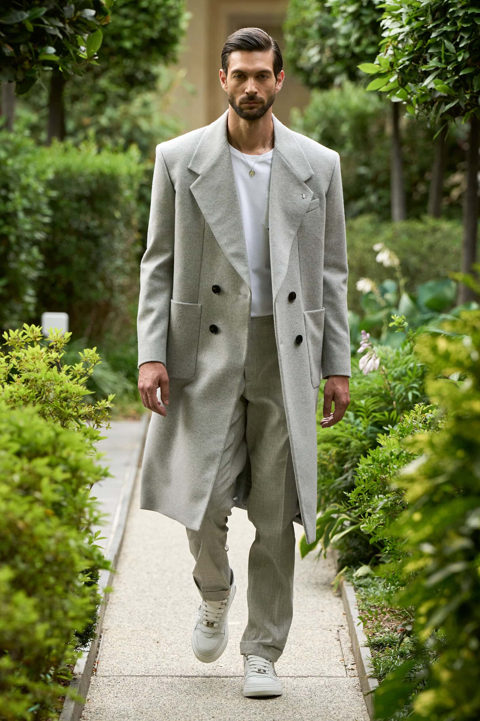 The train of tonal neutrals paraded on the runway — beige, summer white, gray, and the occasional chocolate brown and charcoal — let fabrics and silhouettes talk. Plein should get credit for fueling the Billionaire fashion statement with enhanced and upscale sartorial constructions in the handsomely cut topcoats and neat single-breasted short suits worn with polo shirts.