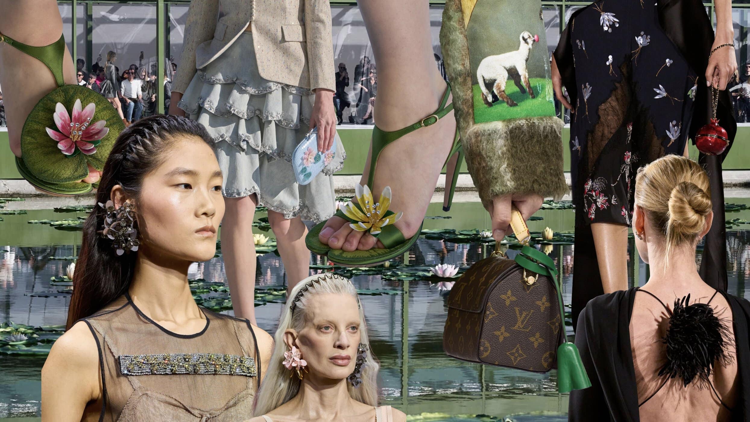 At Dior, the idea was most fully realized. Set against a Monet-inspired backdrop, lily pad heels and a sculptural frog bag introduced a surreal charm, turning accessories into extensions of the collection’s world. Chanel offered a more refined interpretation, from jeweled floral brooches to a striking pomegranate-shaped bag—playful in form, but grounded in the house’s elegance.