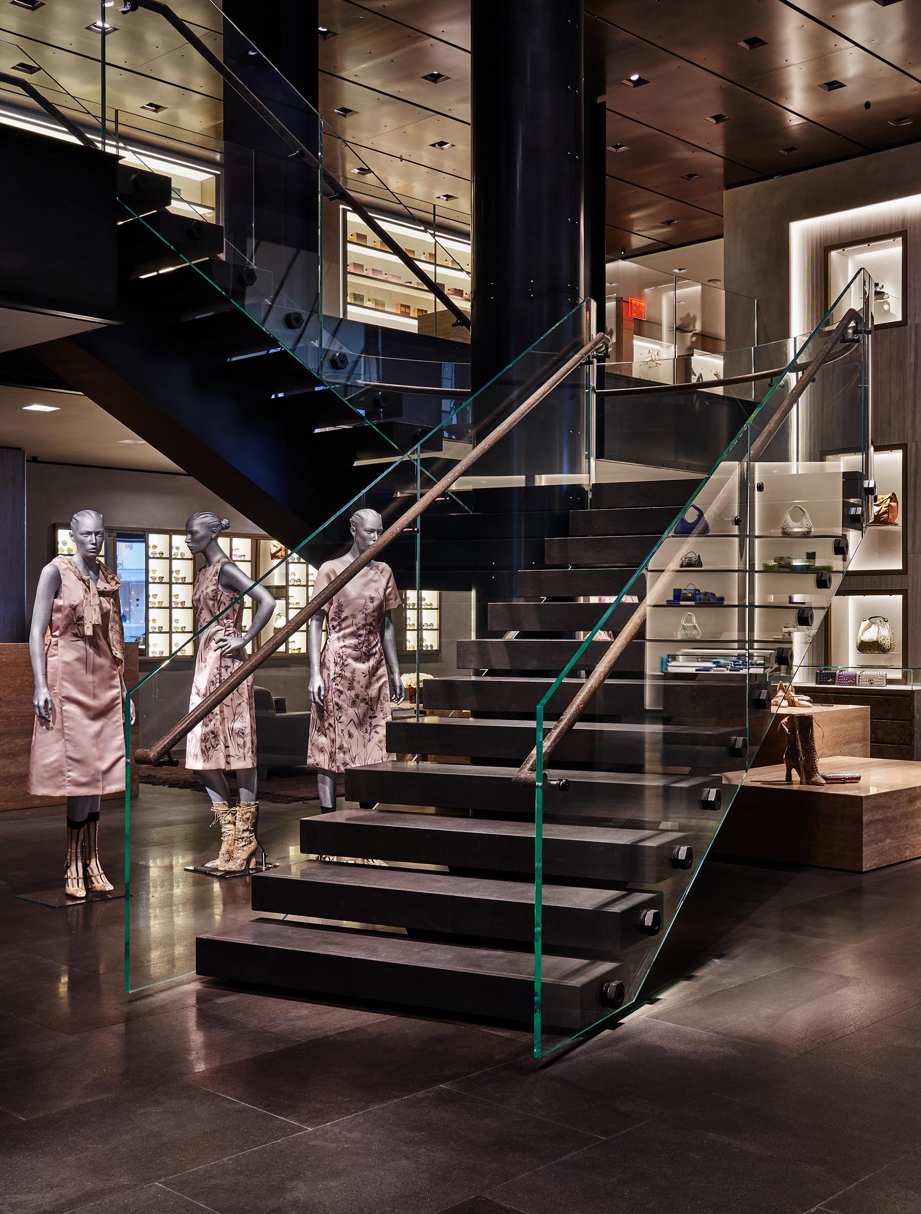 The space was blueprinted on three 19th-century townhouses. Their historic brownstone facades effect a grand and imposing presence, while a hyper-contemporary interior embodies the New York cool that the label has recently appropriated. In fact, with predominantly glass and concrete design elements, the store’s interior incorporates essential motifs from the city’s landscape. The space’s focal point is a grand glass-and-concrete staircase connecting the store’s five floors.