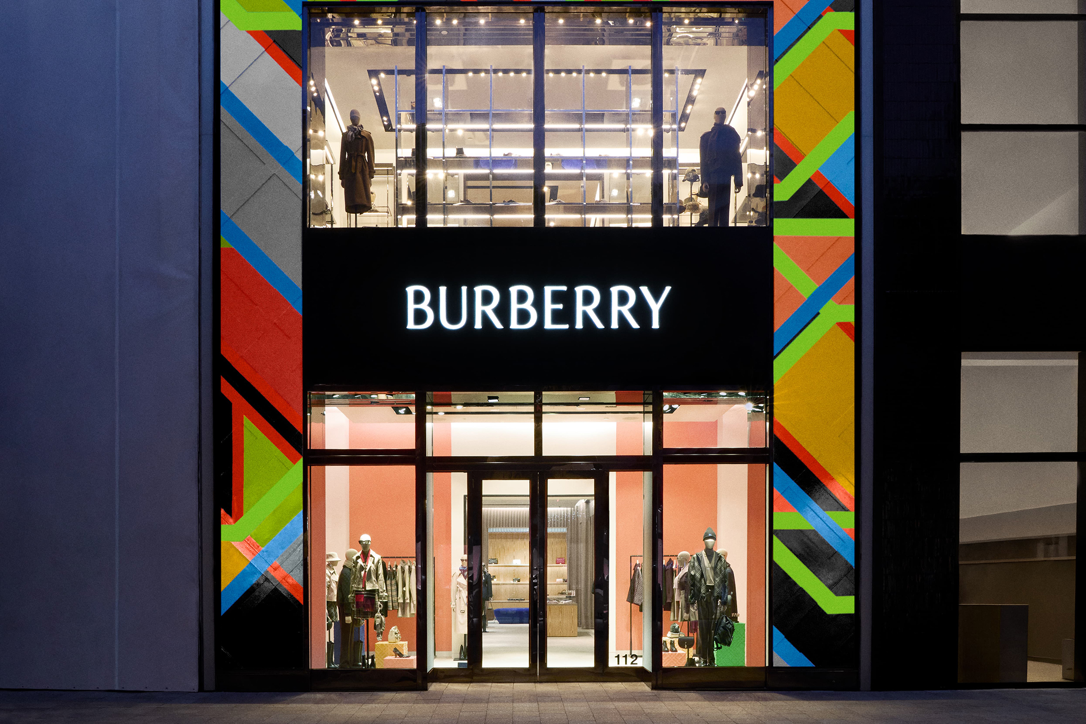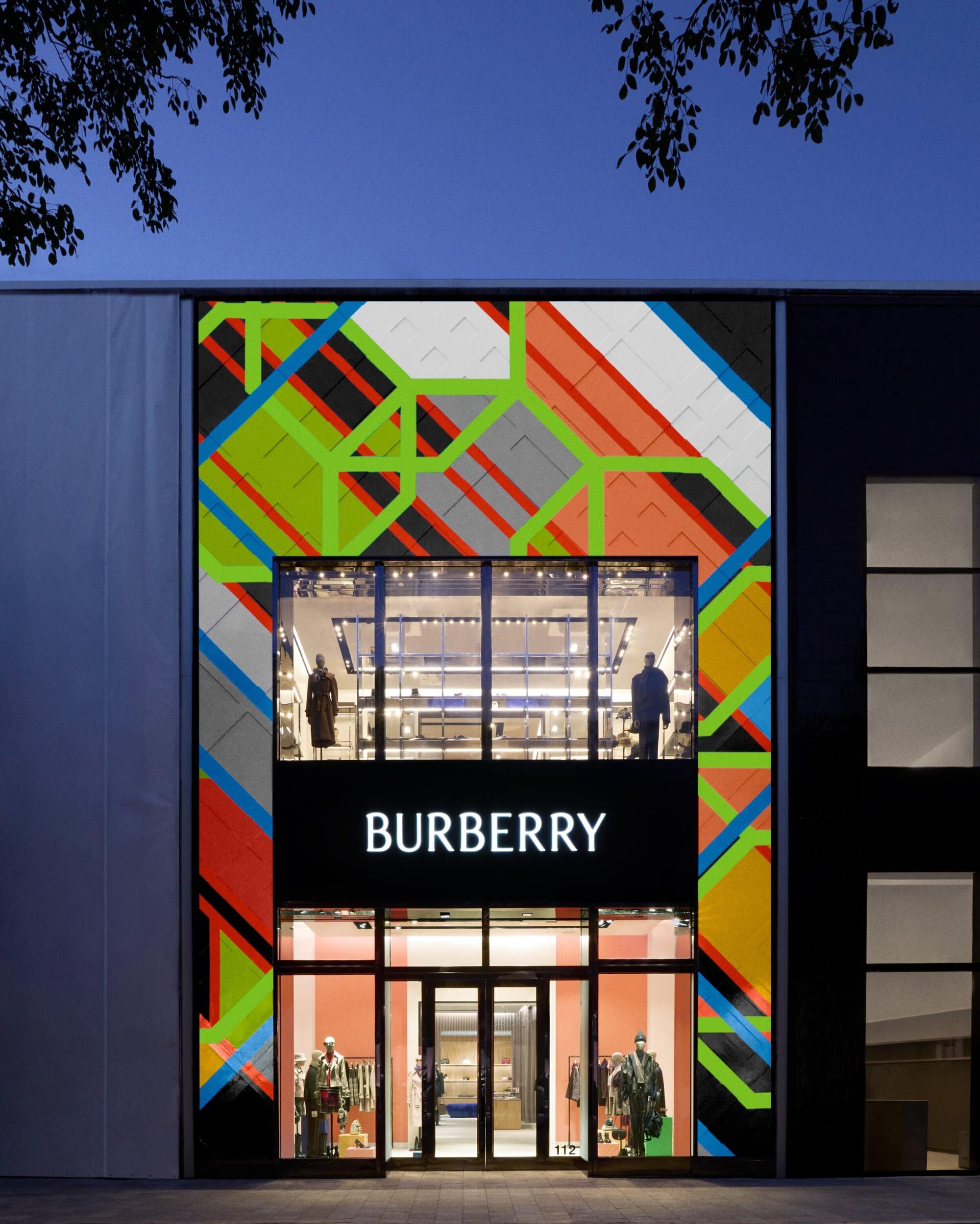 For this collaboration, Morris reimagines her 2004 work Department of Water and Power [Los Angeles], originally named after the city’s notorious municipal building. Now spanning an impressive 31 x 27 feet across the façade, the piece becomes a vivid architectural skin for Burberry’s Miami outpost. Its layered geometry — a dynamic array of saturated colors — is superimposed over the Burberry Check, forming what the house describes as “a playful and humorous subversion” of its most recognizable motif. Positioned within the Design District’s landscape of galleries, luxury boutiques, and modernist influences, the installation radiates both precision and irreverence.