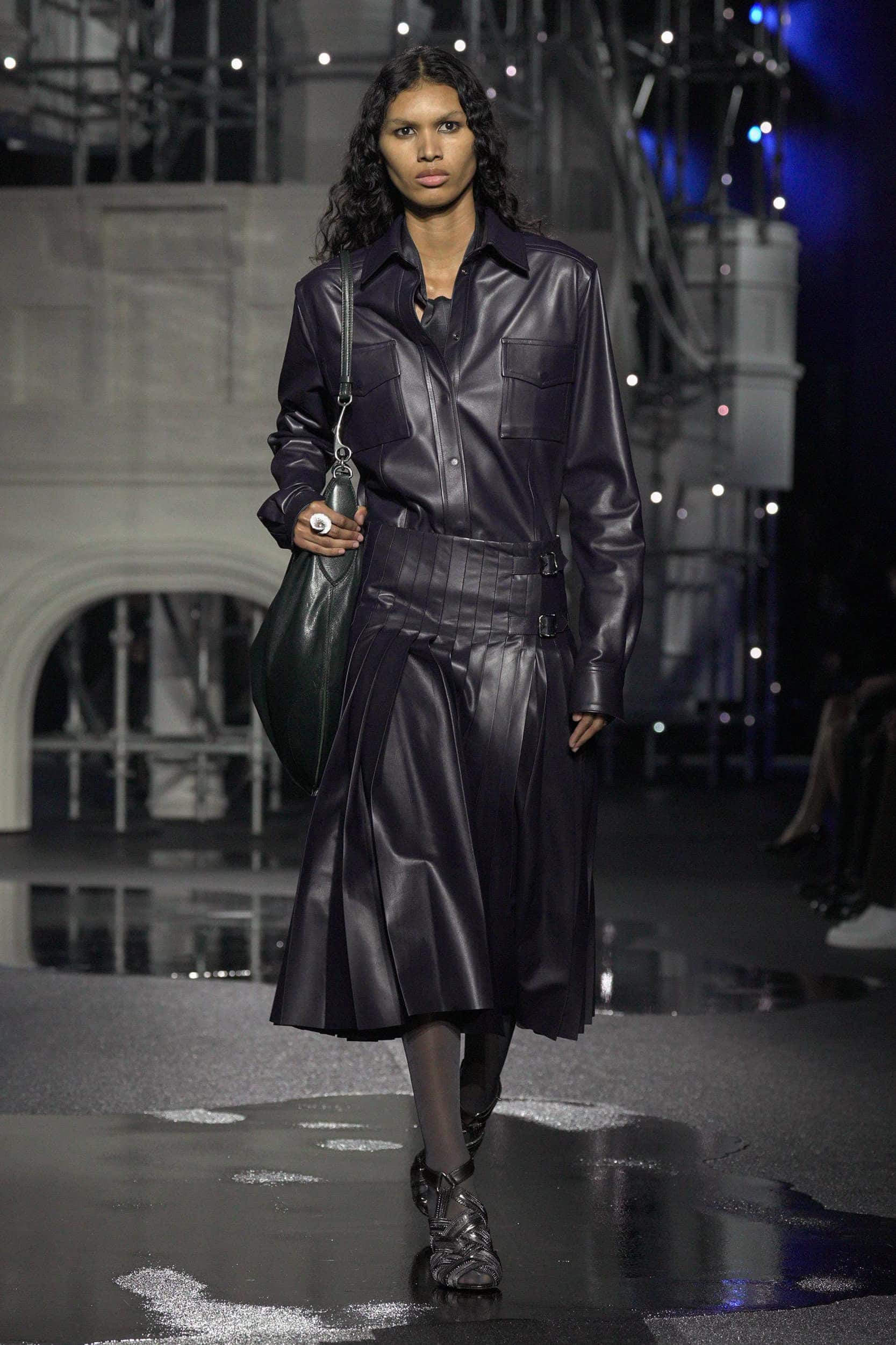 On the final day of London fashion week Burberry, and its Chief Creative Officer Daniel Lee, marked 170 years of its British heritage by turning its gaze on the city that shaped it. Against a theatrical set featuring a twinkling replica of Tower Bridge and a rain-slicked runway that mirrored the capital’s perpetually grey skies, Lee reframed the house’s outerwear legacy through an after-dark lens. With appearances from longtime Burberry muse Edie Campbell and Romeo Beckham among a diverse cast, the collection pulsed with the contrasts that define London’s cultural make-up. Here Lee was influenced by the spark that is lit when heritage, youth, the unpolished and the prim and proper collide.