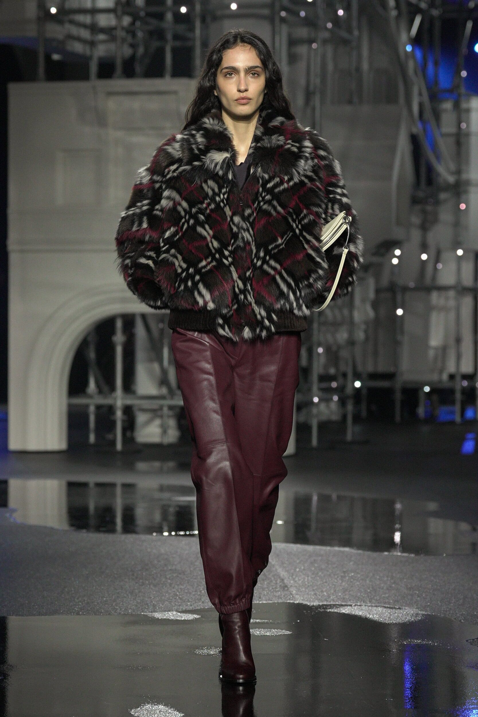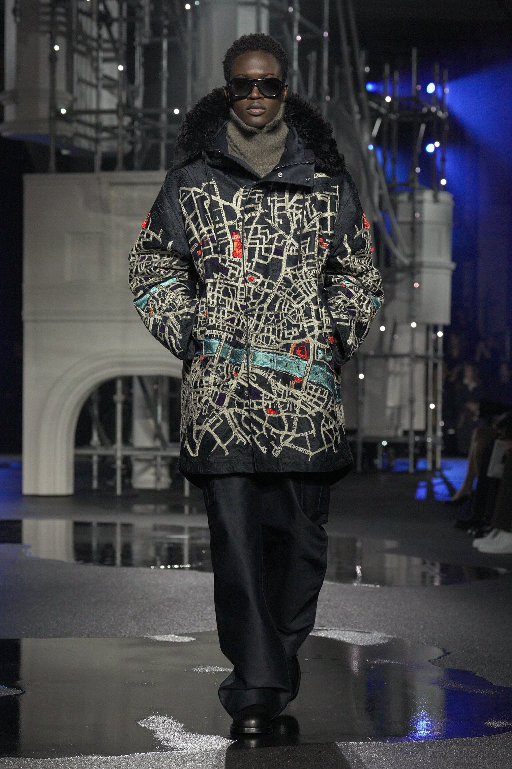 For fall, outerwear was reframed though the concept of ‘Glitched Classics’ according to today’s notes. With the collection exuding an elevated elegance silhouettes were stripped back, particularly in menswear which was pivoted into an eveningwear proposition, going beyond mere functionality. Bombers were rendered in fur-patterned checks or heavy satin, parkas over-printed with a map of the city, trench coats in London fog-coloured leather, and winter white shearlings and double-breasted funnel-neck coats that would only be suitable for the aforementioned chauffeur service. This was all styled back with an creative take on the babushka in leather.
