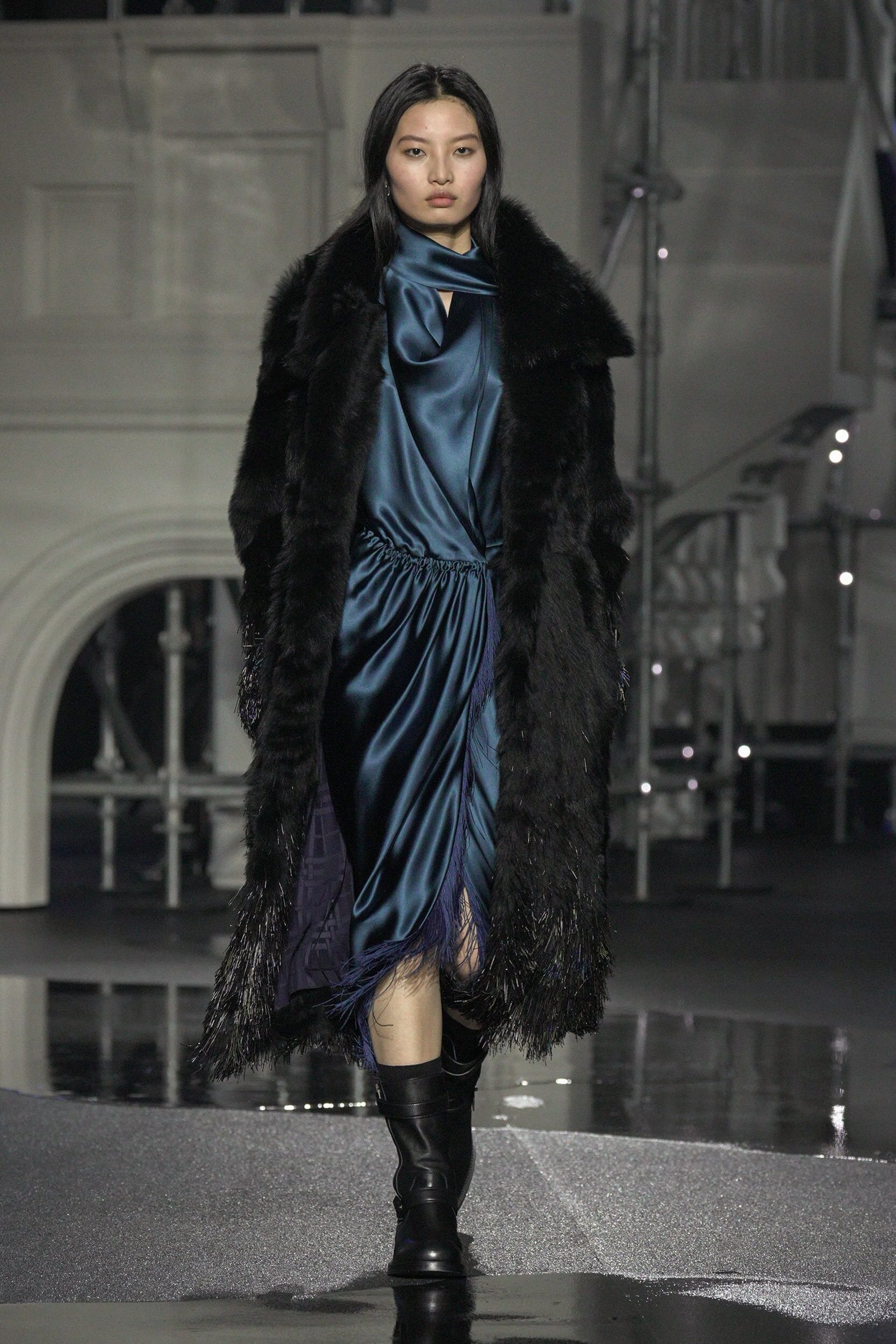 On the womenswear side, there was the desire to create trench coats cut into easeful shapes, so as to enable them to be thrown on at the end of the night. Likening this to ‘trenches worn like accessories,’ this reflected how Londoners get dressed, unbothered by formalities or strict dress codes. An element of dishevelment can always set apart a native from the city. Refining his Burberry woman down to a chicer, sexier version of herself for fall, trench coats were decorated with ruffled collars, checks became jacquards, long fur coats were finished with beaded fringing, and cascading bugle-beads mimicking rainfall trimmed trousers, while satin dresses were cut on the bias to give its wearer the fluidity to float from one event to the next.