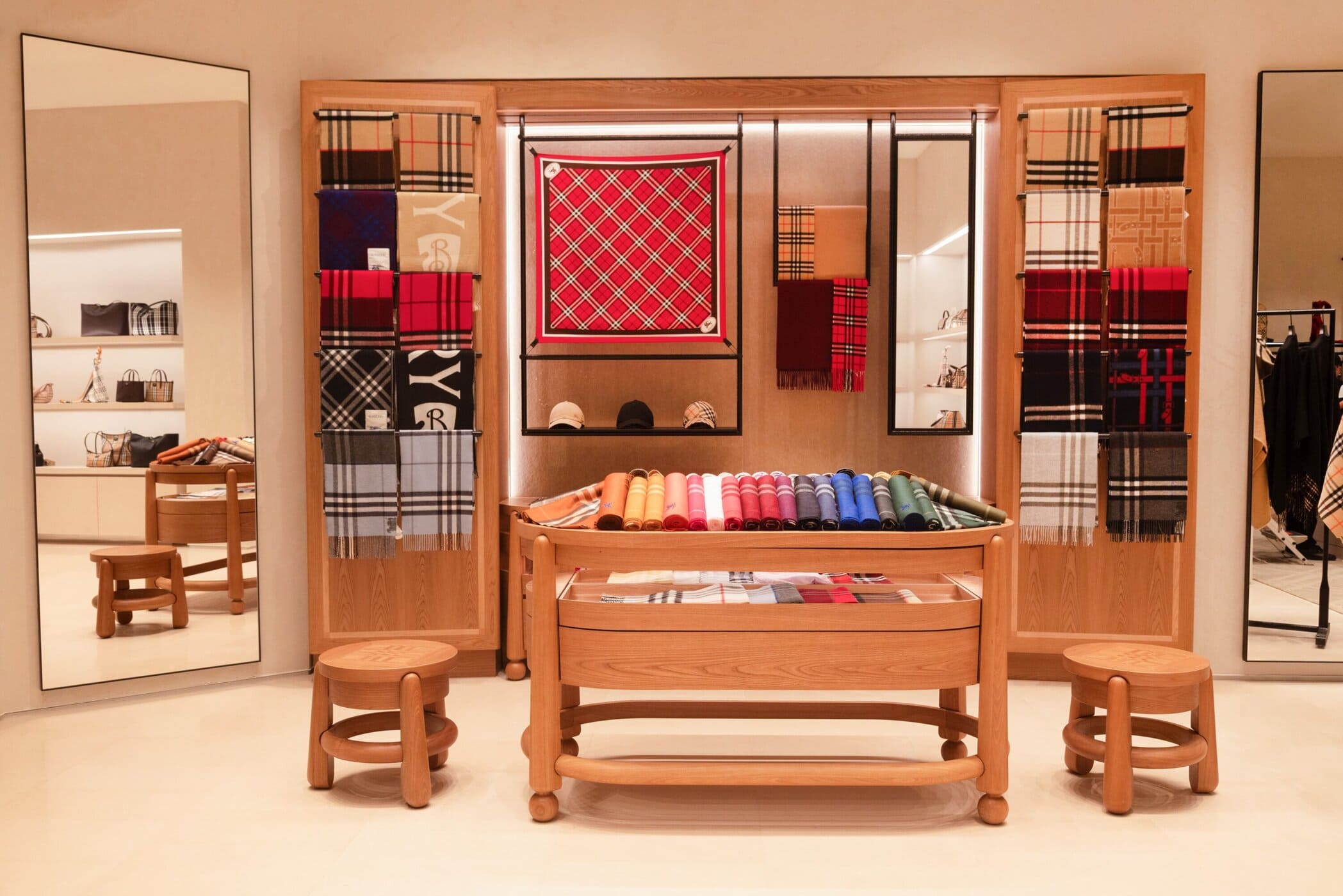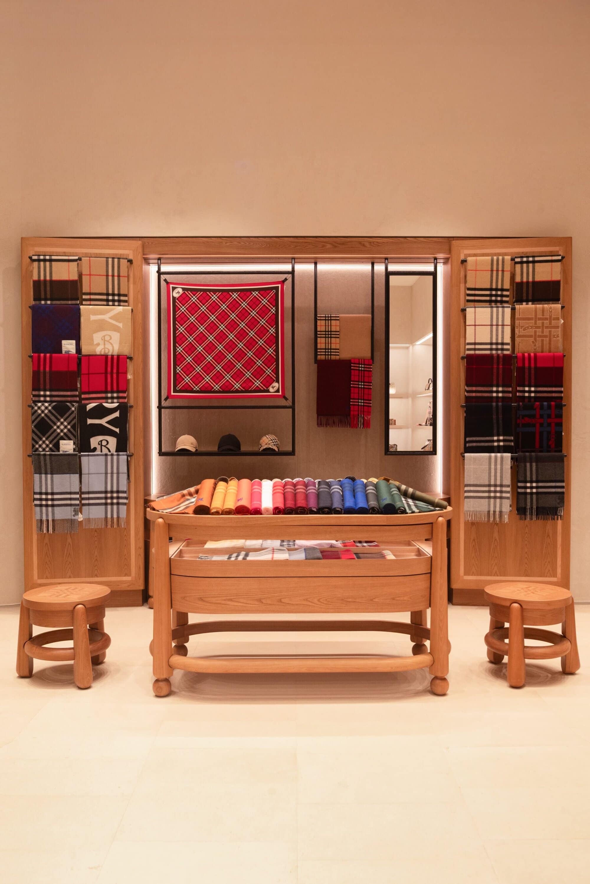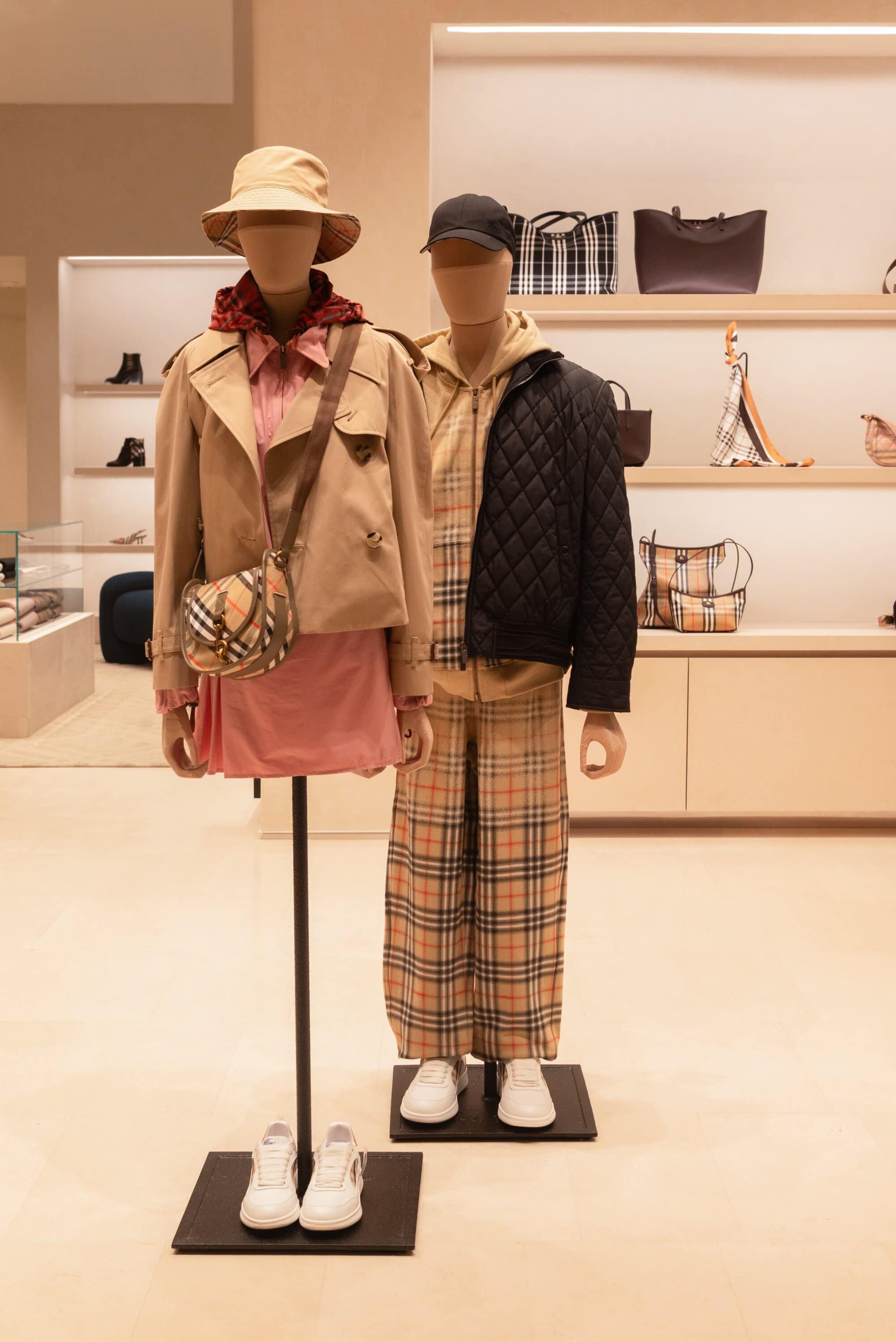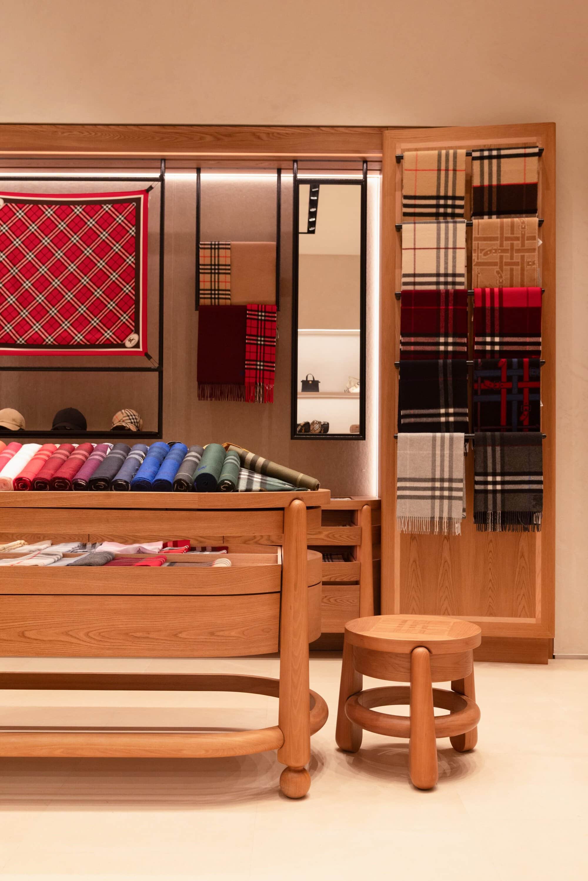 Scarves take center stage through the brand’s newly introduced Scarf Bar, a dedicated area showcasing Burberry’s soft accessories within bespoke furniture. From cashmere to silk twill, the curated selection highlights the depth of the house’s textile expertise across a rich range of colors, patterns, and textures. Completing the offering is a full assortment of womenswear, menswear, bags, and shoes, including summer-ready Check swimwear and accessories inspired by Burberry’s equestrian heritage, such as the Highlands and Horseshoe bags—positioning the Monterrey store as a complete expression of the brand today.
