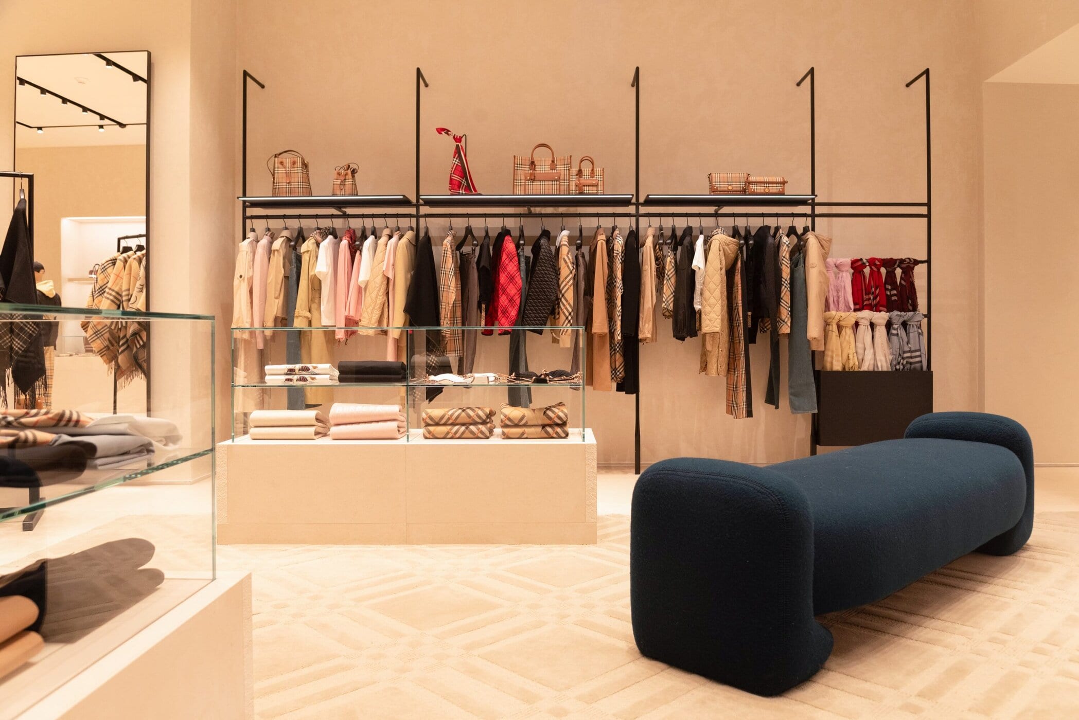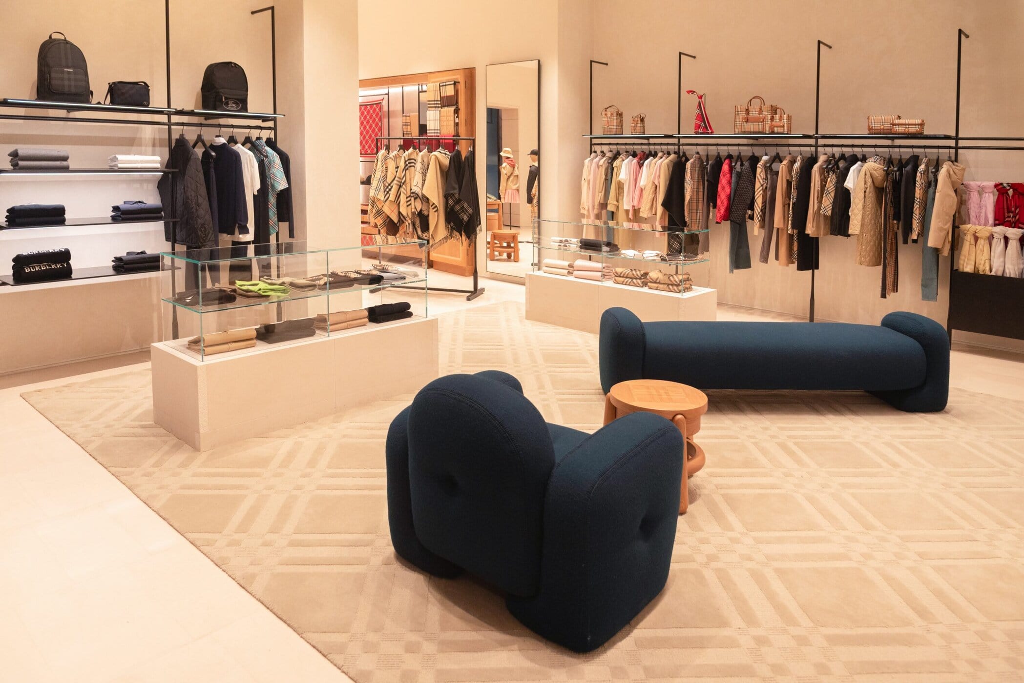 Inspired by the streets of London, the store’s interior pairs natural stone reminiscent of British limestone with cast-iron detailing that echoes the city’s historic railings. Stone display counters are softened by wool rugs embossed with the iconic Burberry Check, creating a dialogue between structure and comfort. The result is an environment that feels quietly confident, where heritage cues are present without feeling referential or heavy-handed.