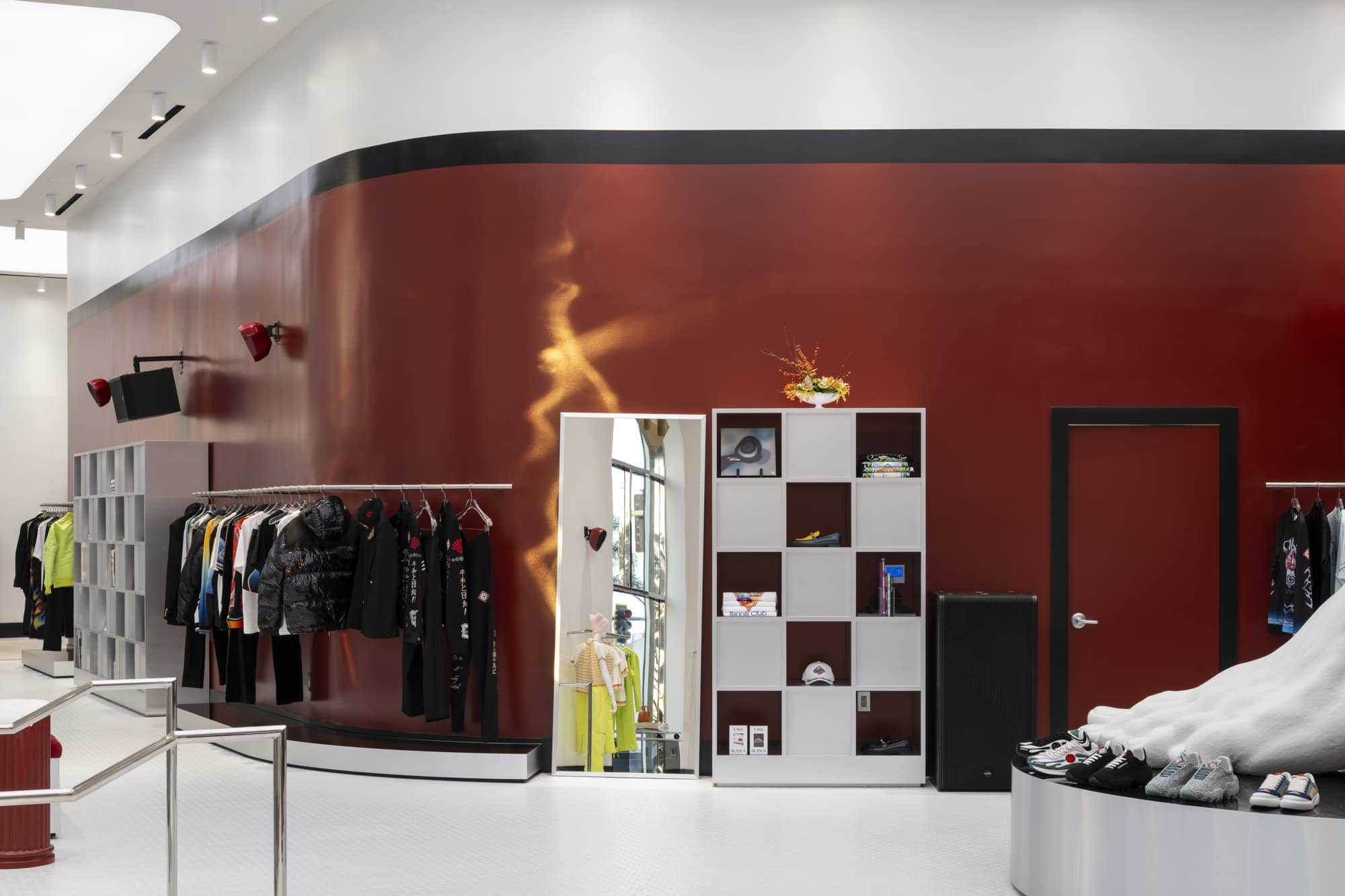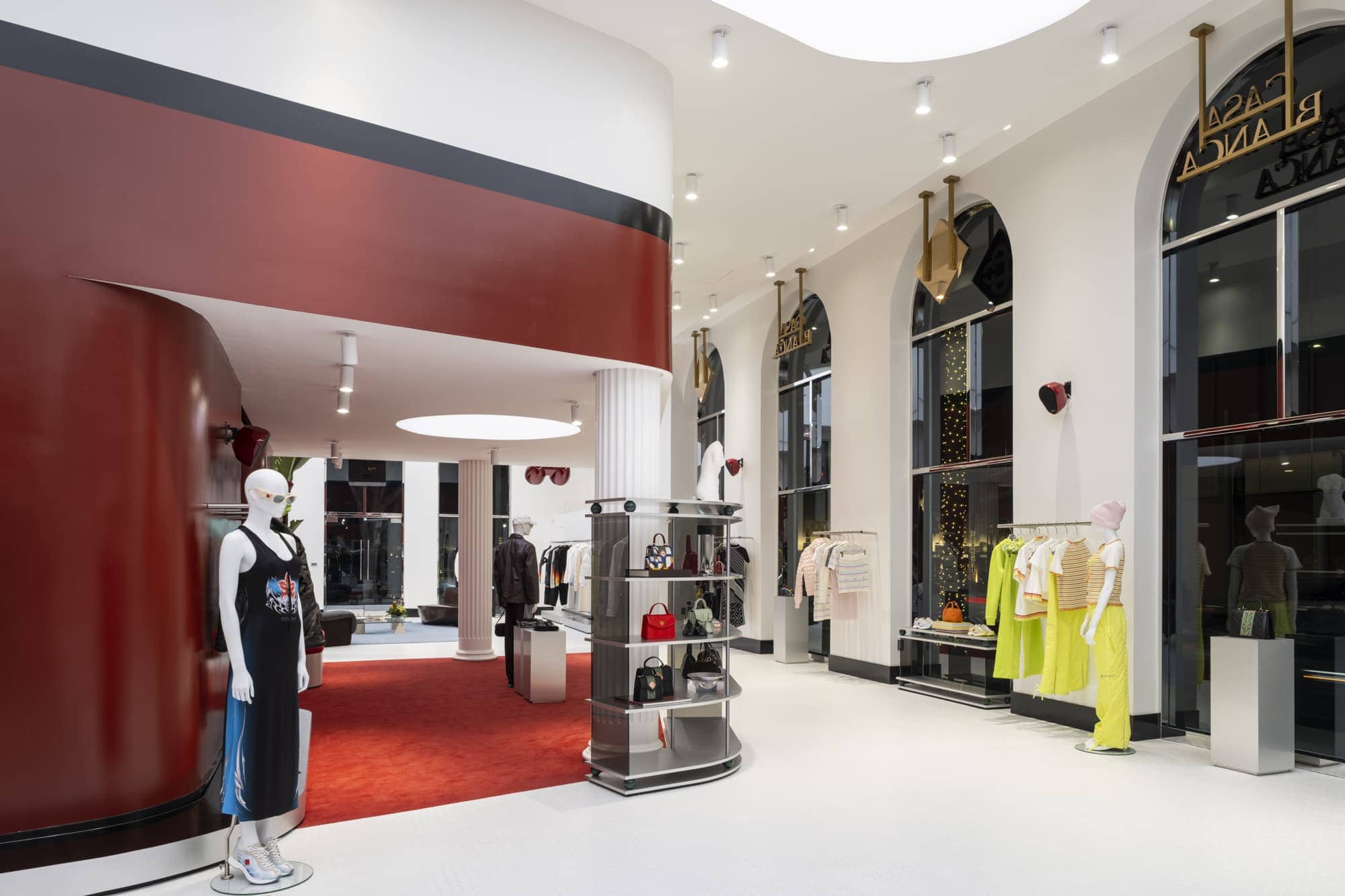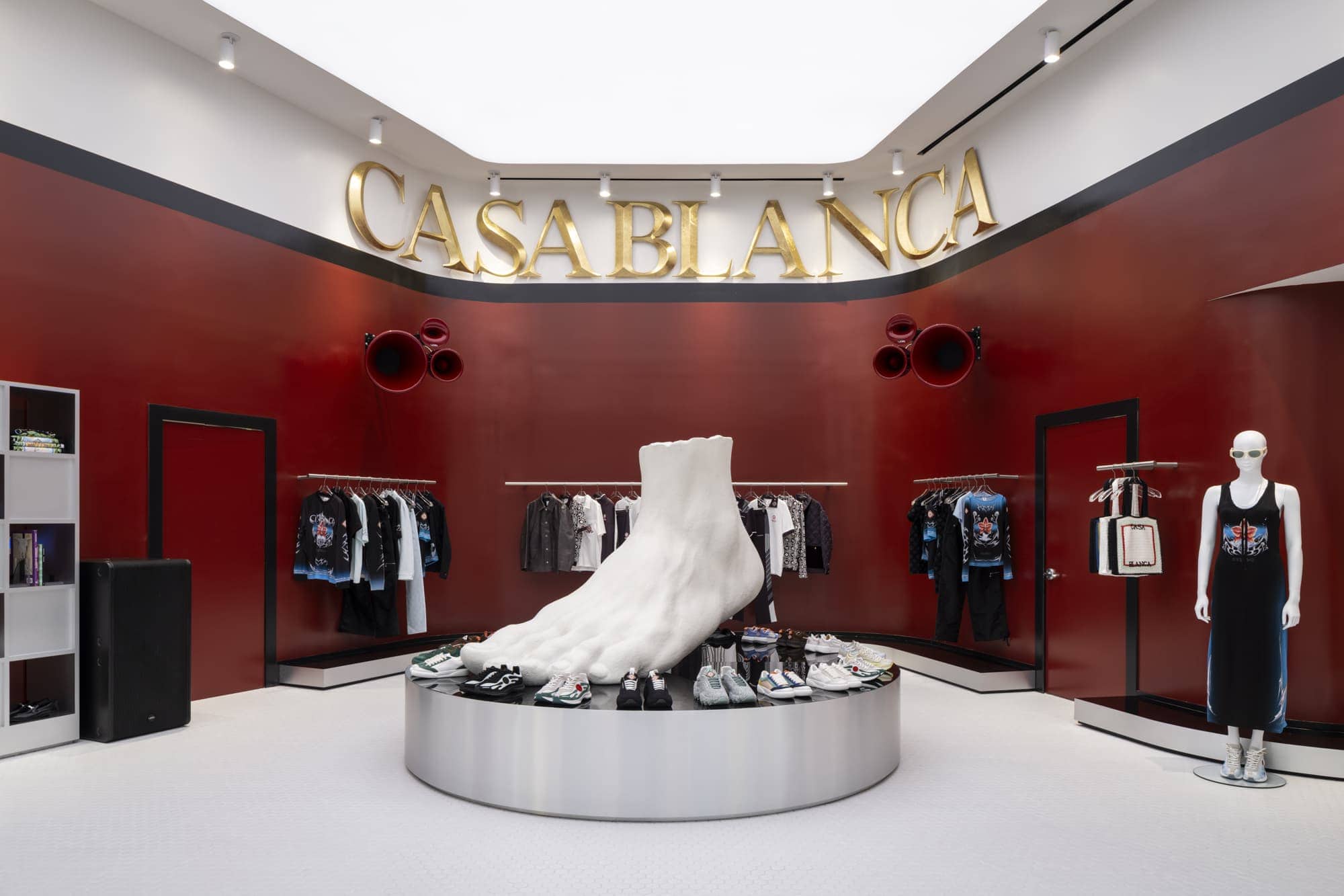 Inside, a bespoke Void sound system underscores music as a defining part of the brand’s identity. A sculpted foot nods to the themes of movement and sport, while a striking red wall, curated antique furnishings, and clean brushed-metal details express Casablanca’s blend of craftsmanship and modern refinement. The space’s grand openness transitions into more intimate lounges, offering a seamless experience that feels both cinematic and personal.