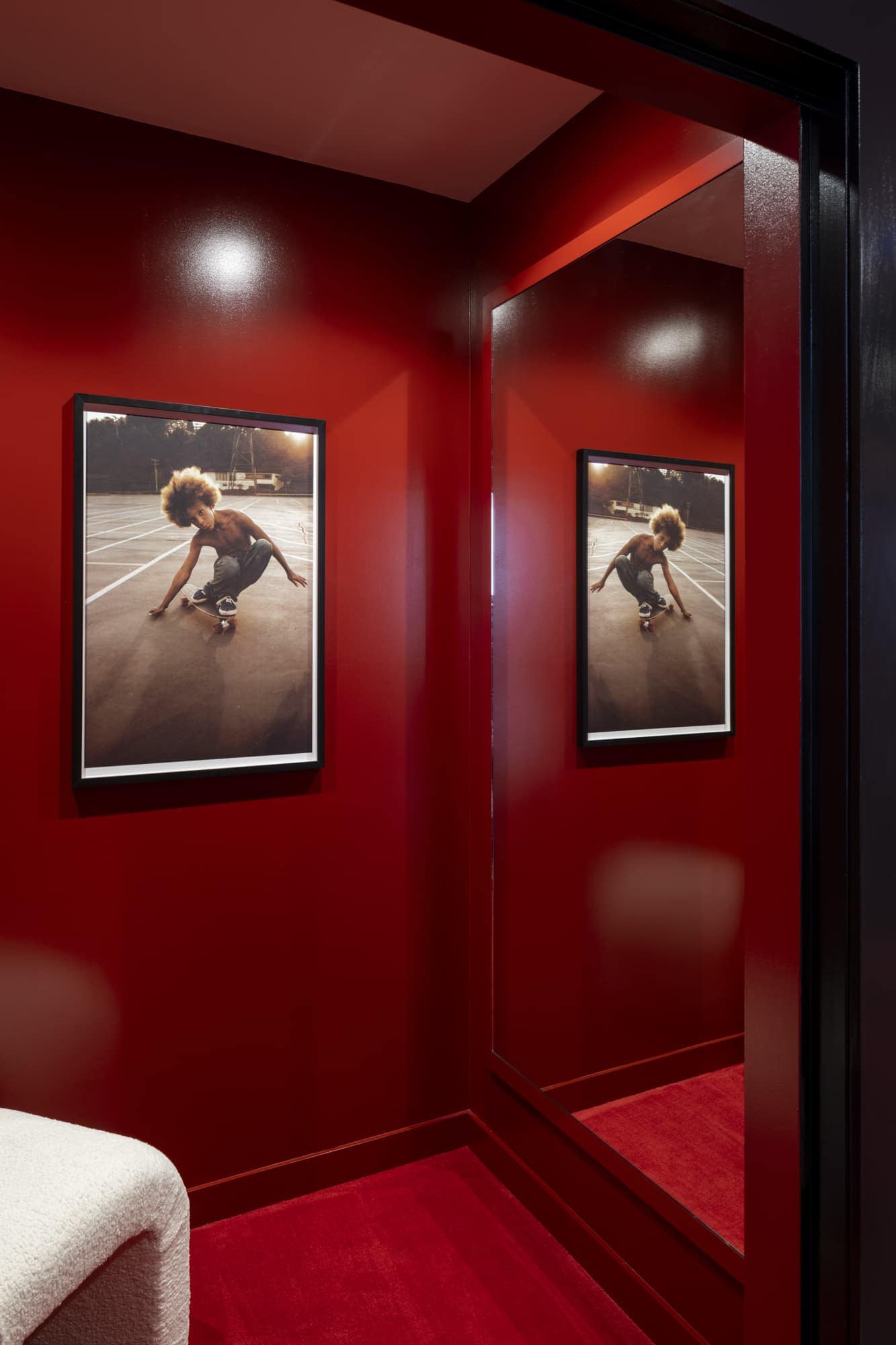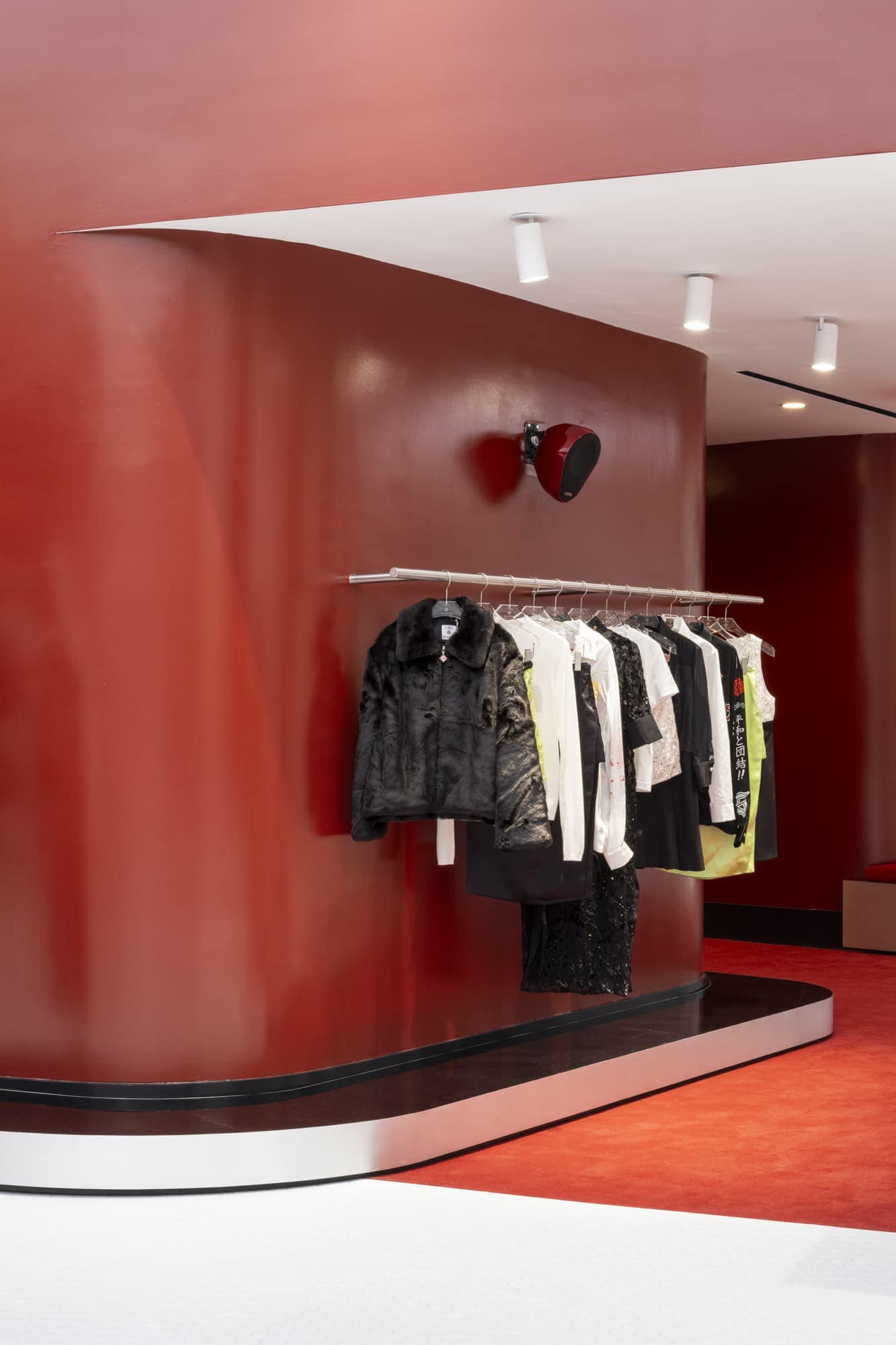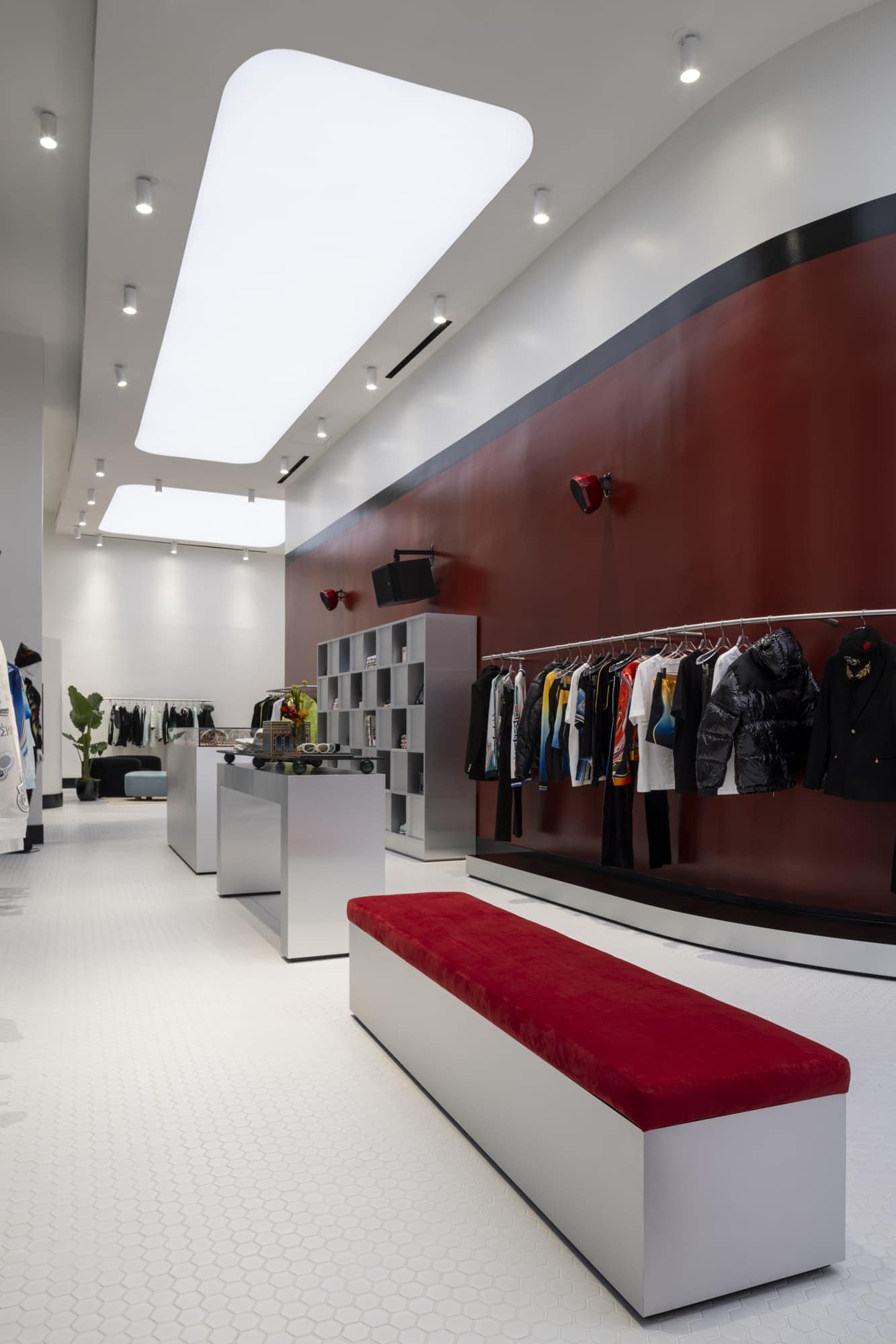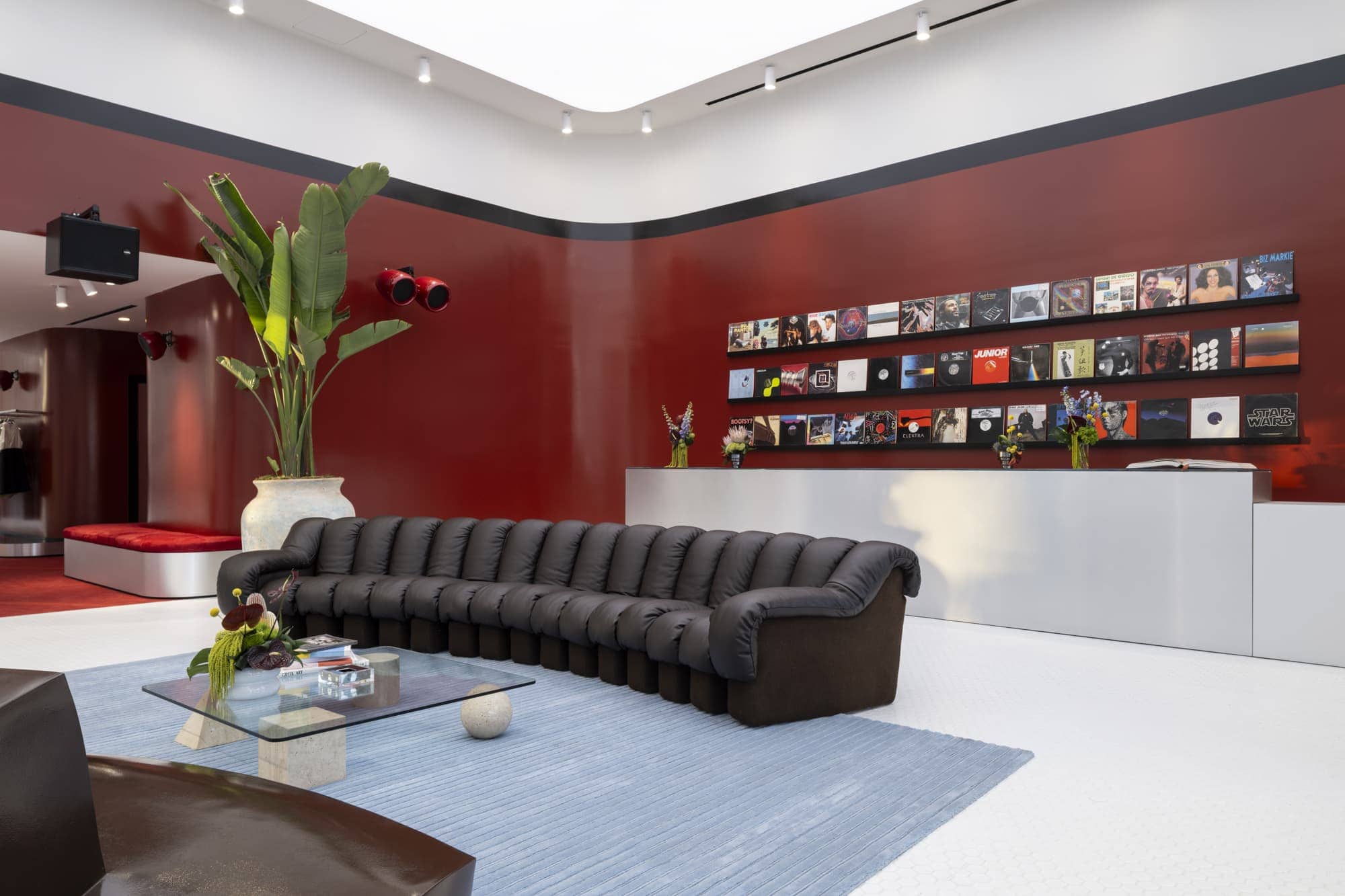 Inside, a bespoke Void sound system underscores music as a defining part of the brand’s identity. A sculpted foot nods to the themes of movement and sport, while a striking red wall, curated antique furnishings, and clean brushed-metal details express Casablanca’s blend of craftsmanship and modern refinement. The space’s grand openness transitions into more intimate lounges, offering a seamless experience that feels both cinematic and personal.