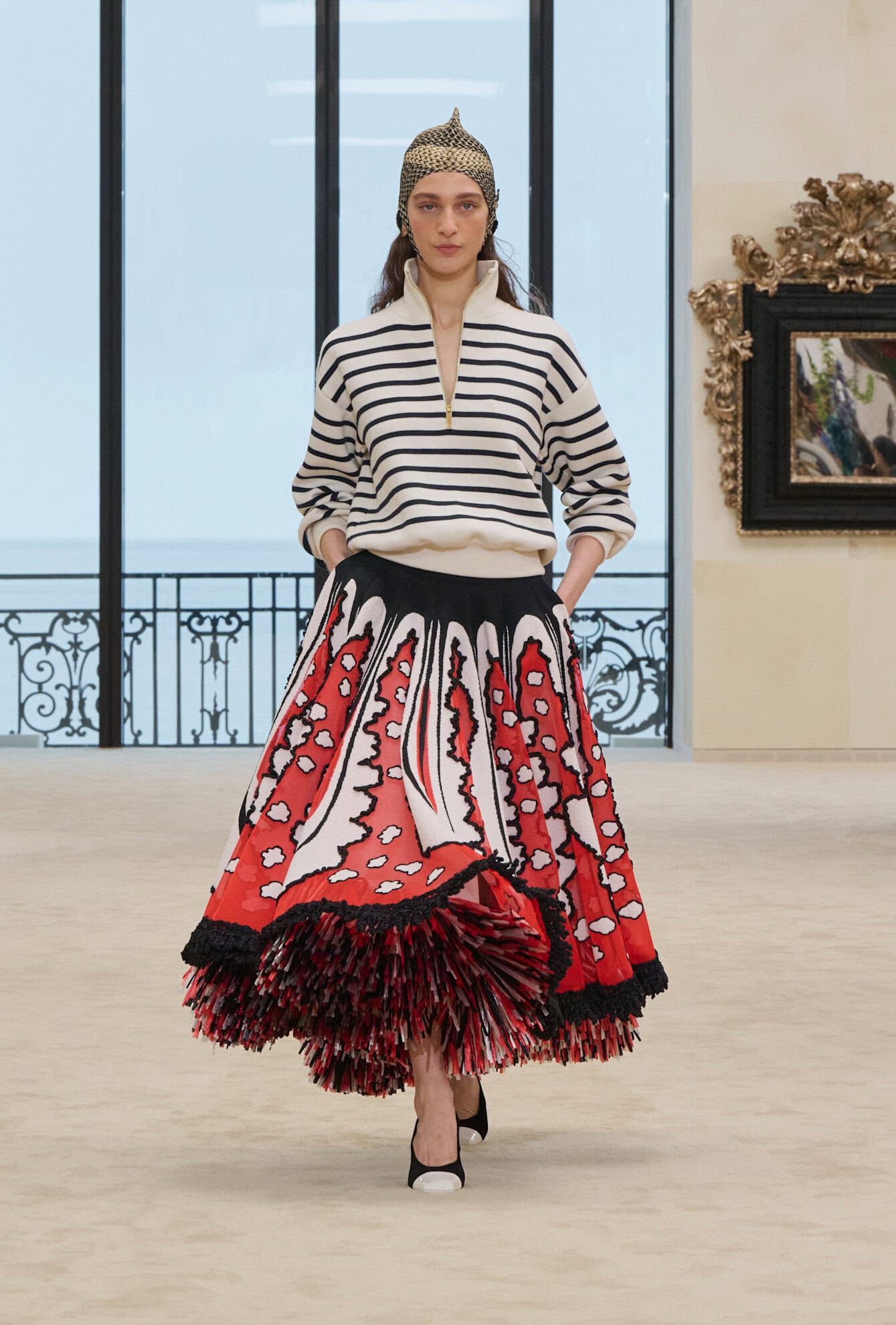 And then, just as the collection settled into that ease, it shifted. A crocheted red dress that moved like air caught in thread. Black ruffles layered to the point of near abstraction. Graphic prints and seaside gestures that occasionally edged toward the literal—souvenir dressing flirting, briefly, with illustration. Blazy allows these moments of play, though never entirely loses control of them.