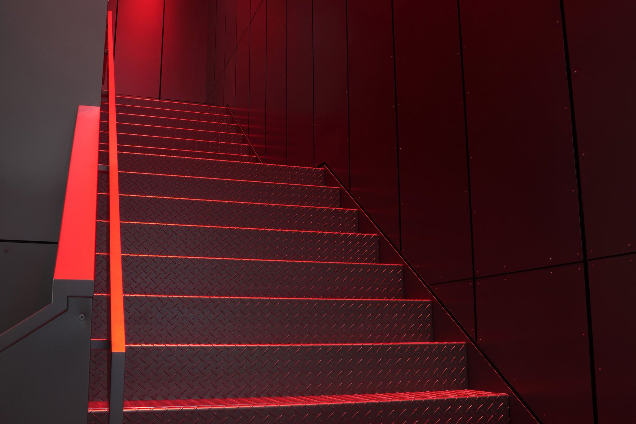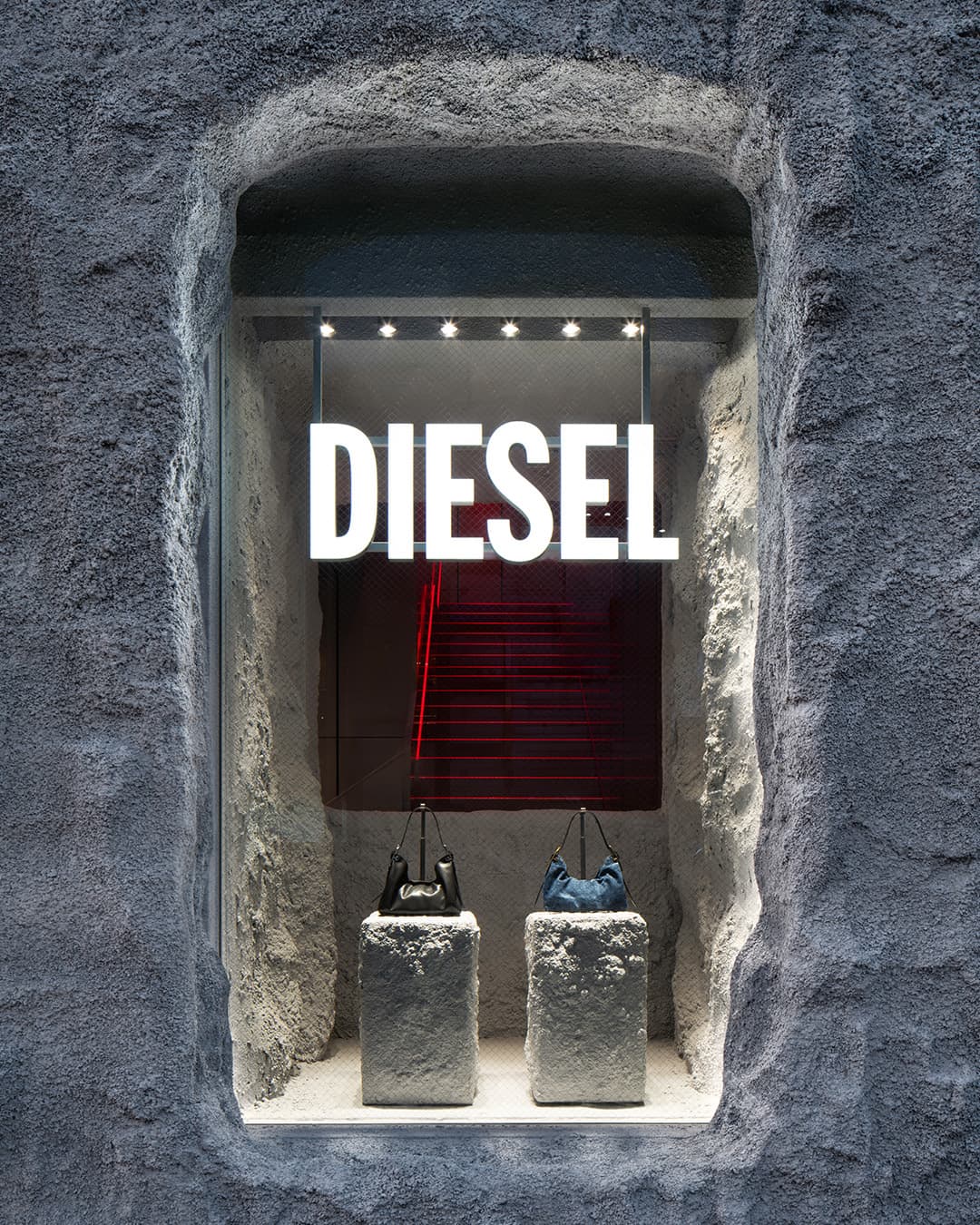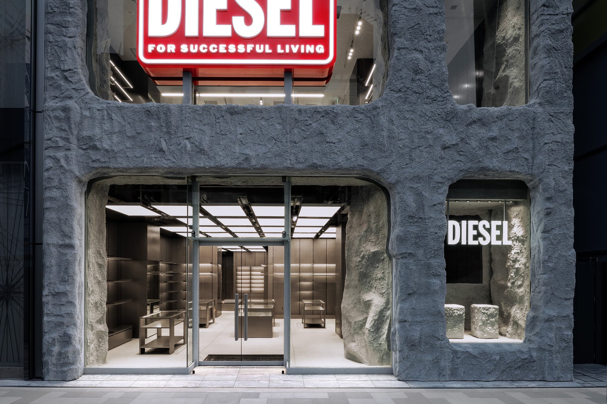 The exterior is defined by a popcorn concrete façade featuring an oversized Diesel Biscotto logo, creating a high-impact architectural marker within the Shinsaibashi area. Inside, the store continues the industrial language through metal-clad walls, a monochromatic palette, and a red-lit staircase that connects the two levels. A red Biscotto logo visible through the second-floor windows adds a graphic focal point against the store’s more restrained material backdrop.