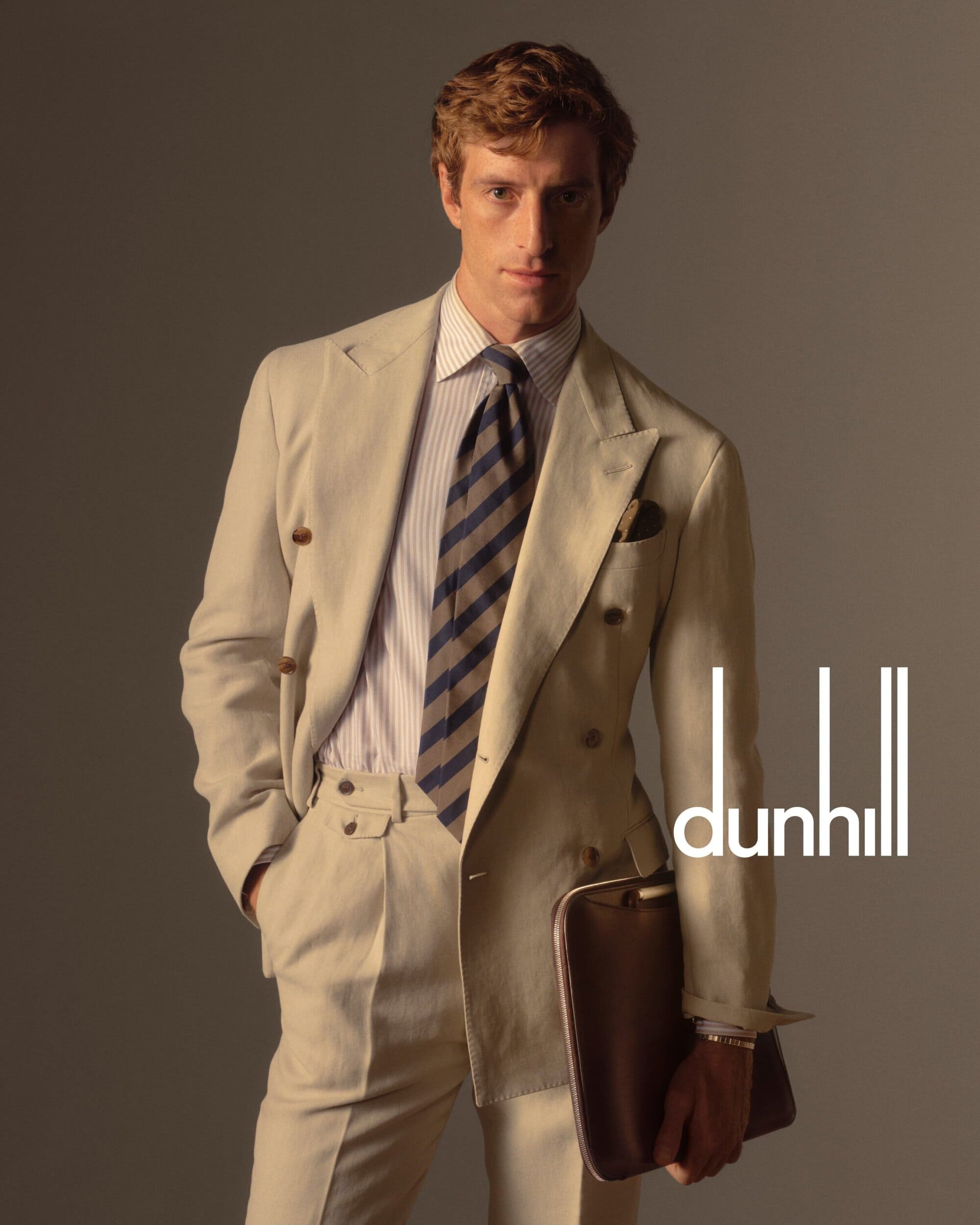 That said, dunhill’s command of mood remains impressive. Pastel linens evoke garden parties and Wimbledon afternoons without tipping into nostalgia, while eveningwear—midnight navy hopsack, voile shirts, hand screen-printed accessories from Macclesfield—extends the idea of elegance undone. Leather goods, particularly the Alfred collection, ground the campaign in the house’s engineering legacy. The hand-burnished patina calf and lighter-inspired hardware quietly reinforce dunhill’s long-held philosophy: usefulness, beauty, and longevity in equal measure.