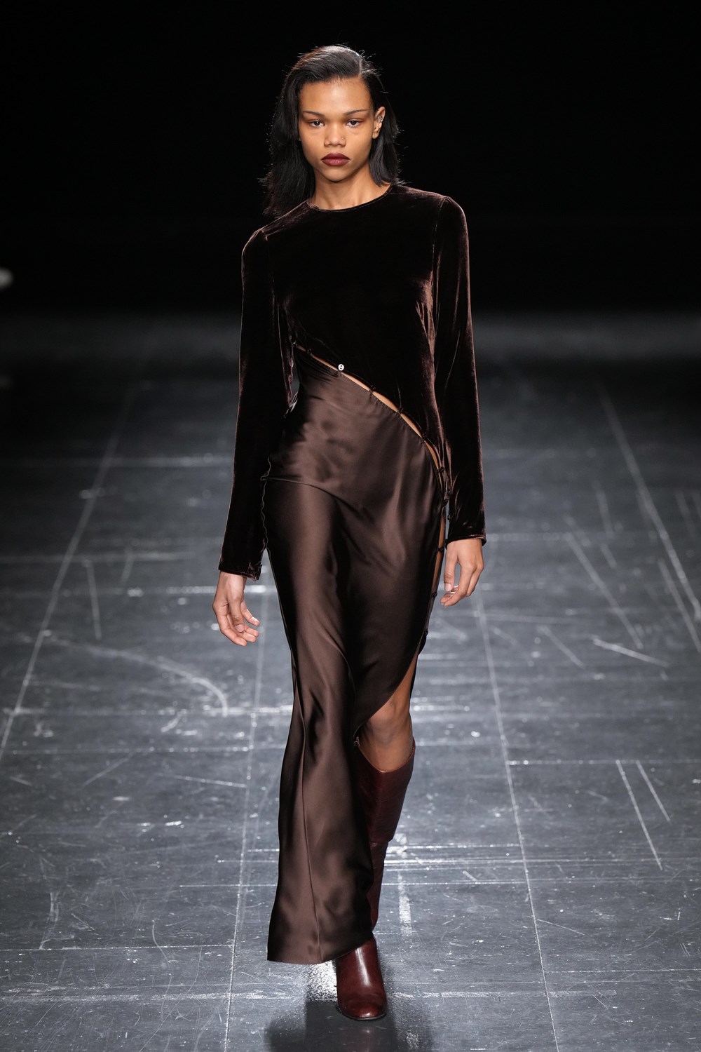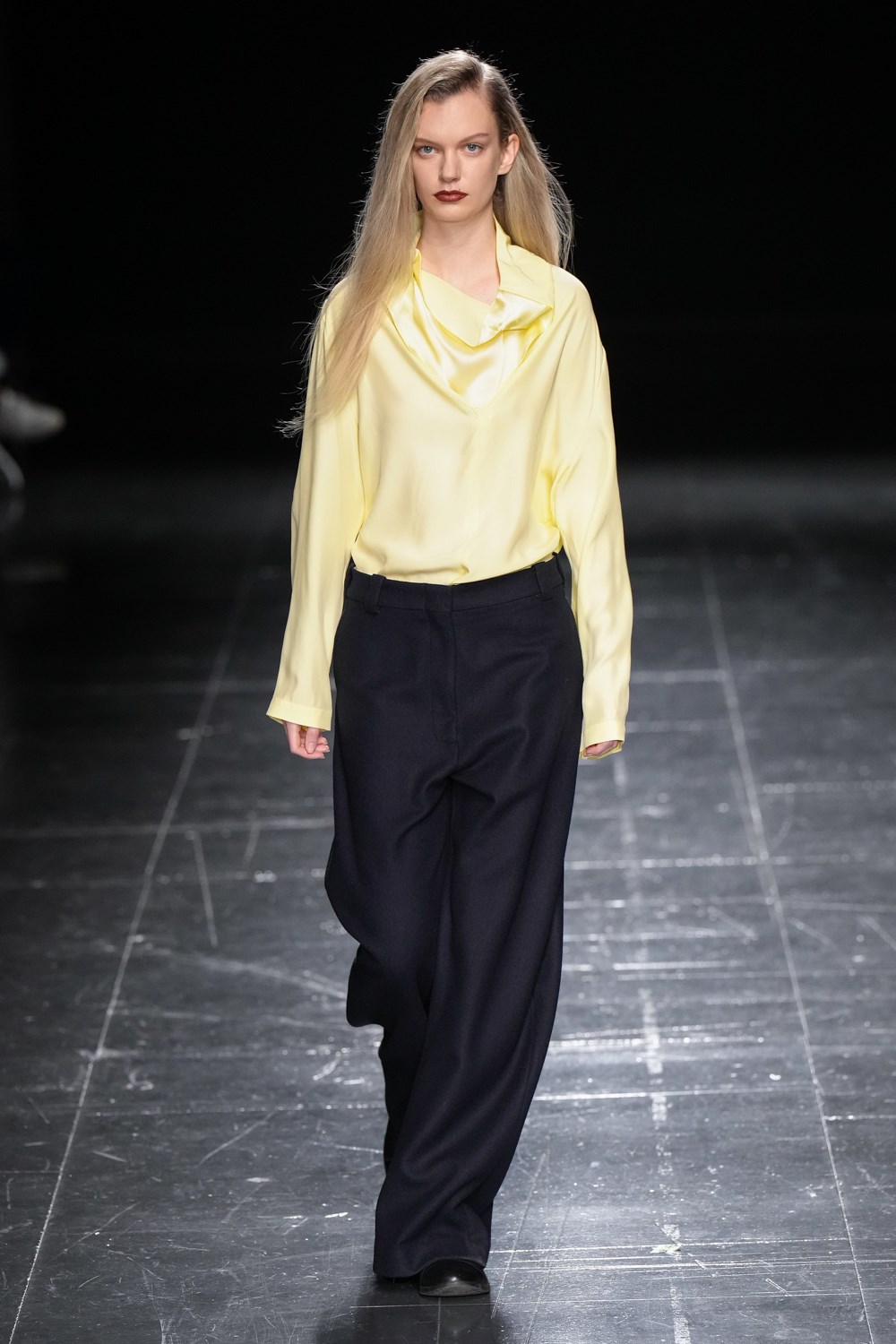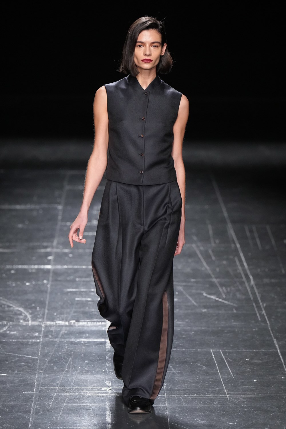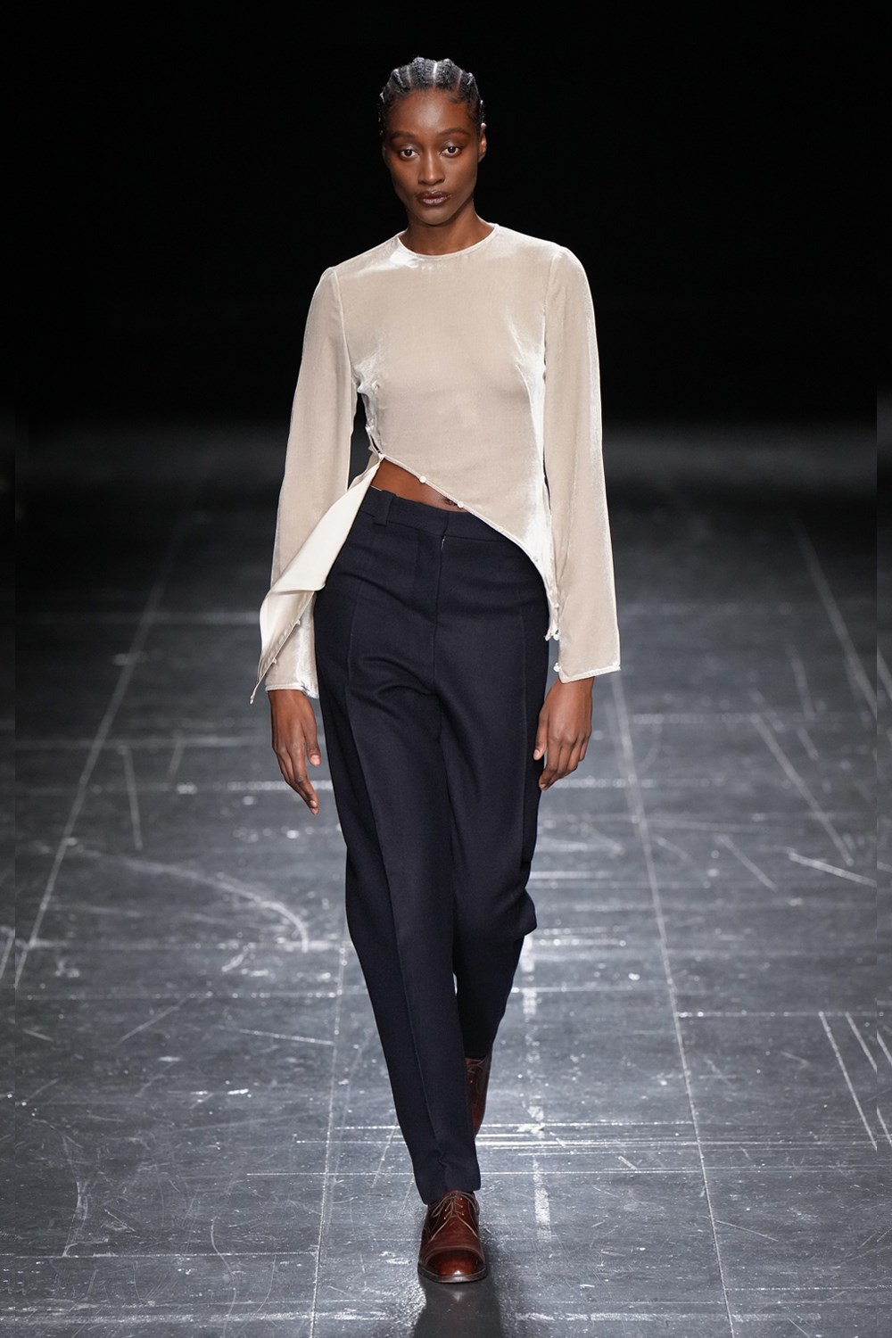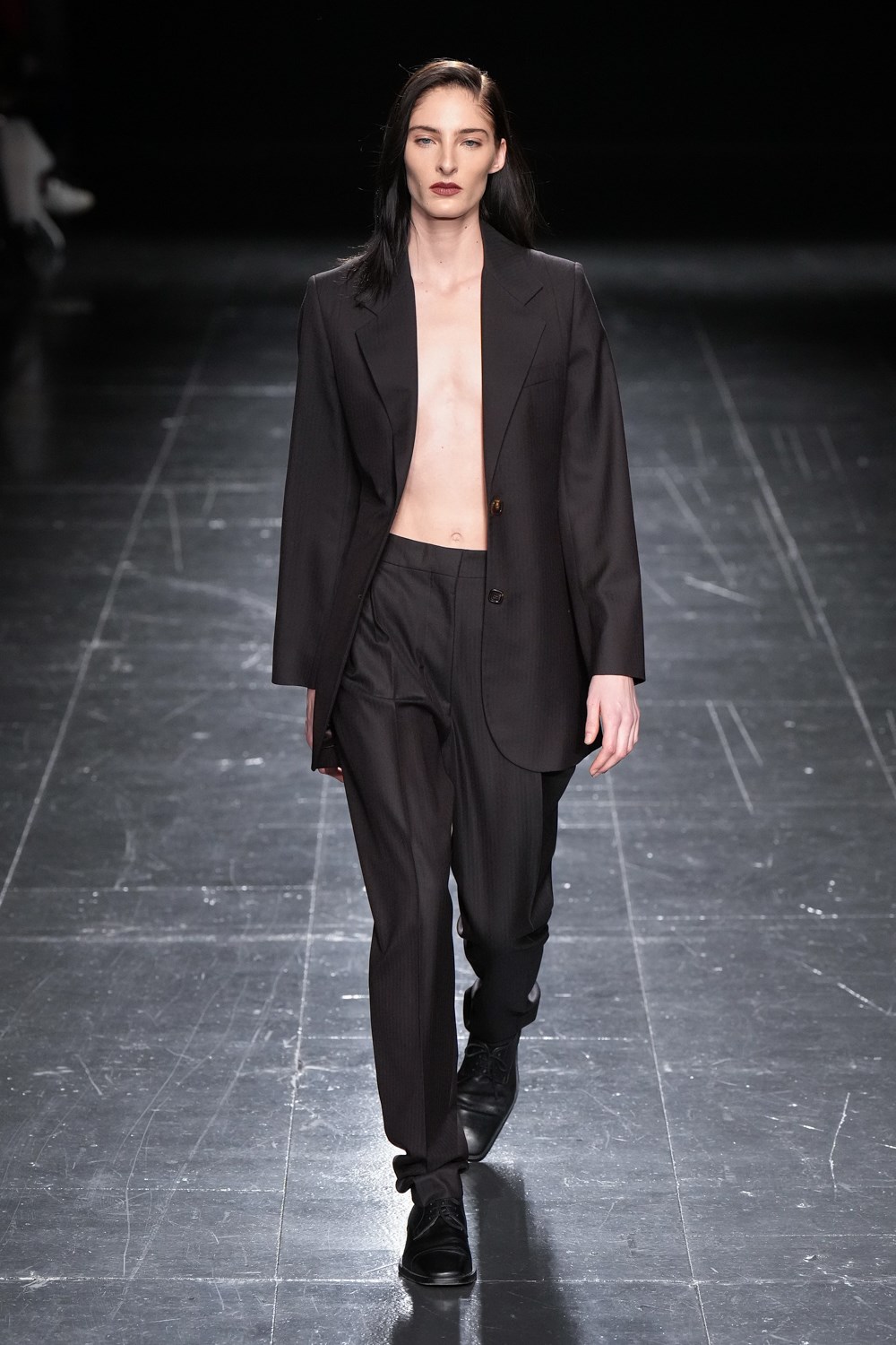 A firm favourite with the street style set, the “Grandpa” trousers in chocolate brown were shown with a matching blazer, sans top – a possible reference to the designers’ desire to strip back “office-based workwear” in her show notes – demonstrating the timeless sex appeal of masculine tailoring when translated on the female form.