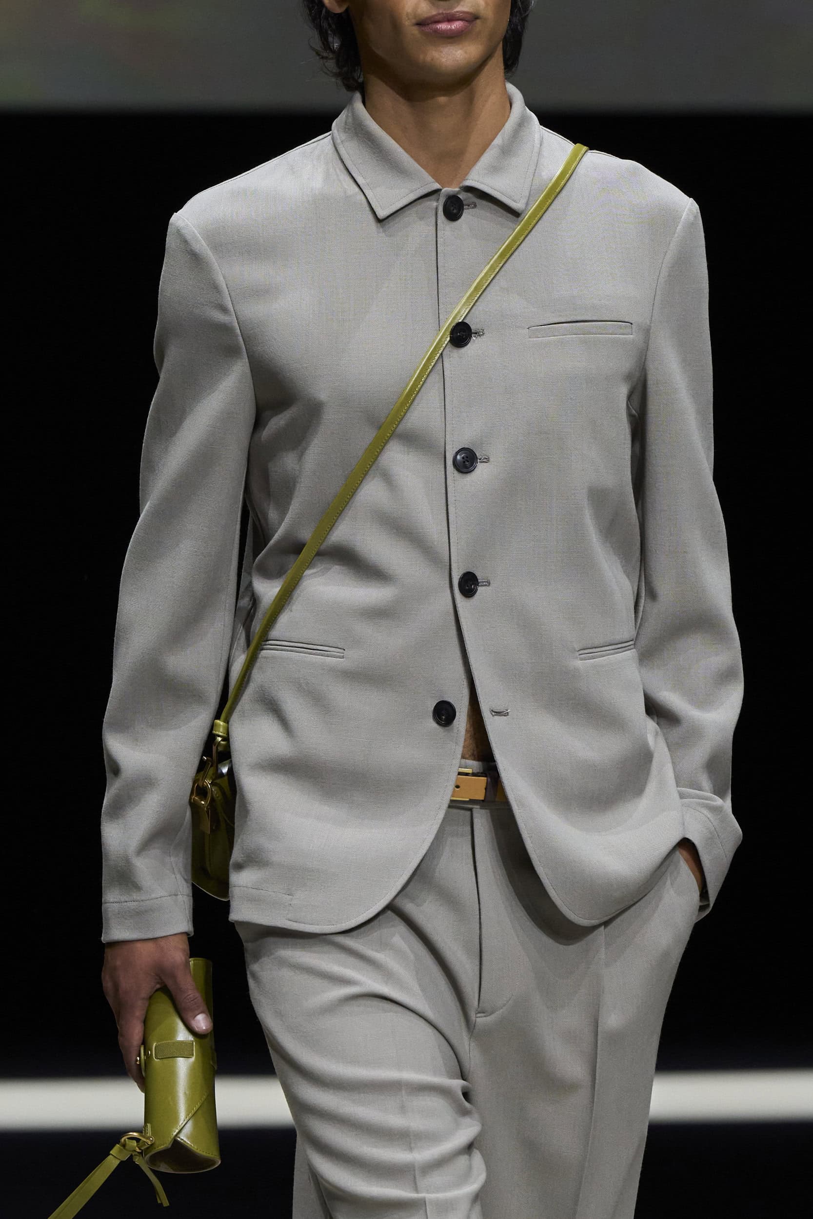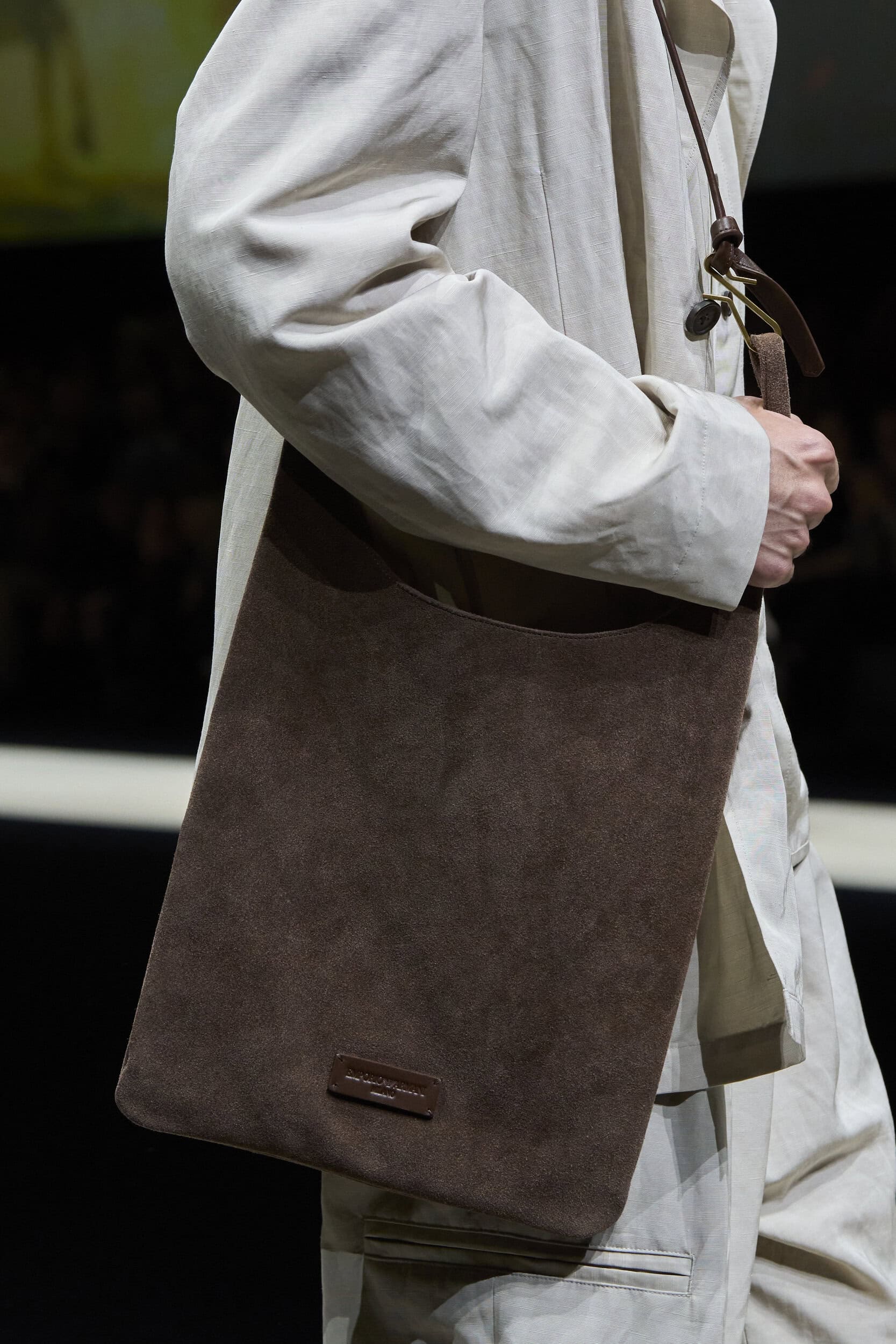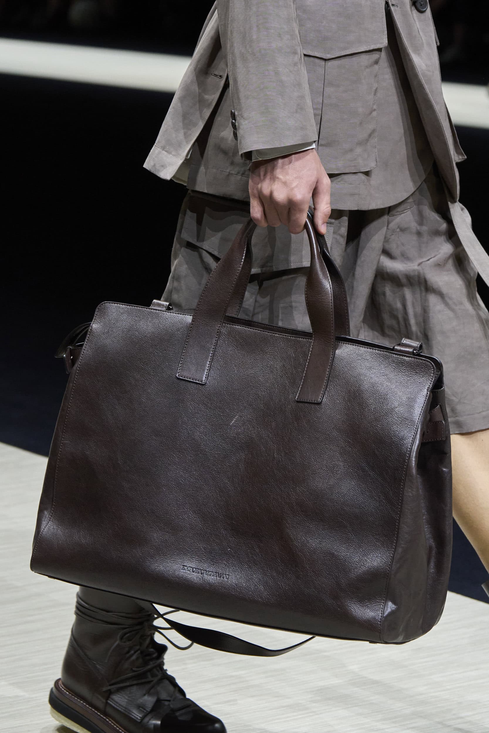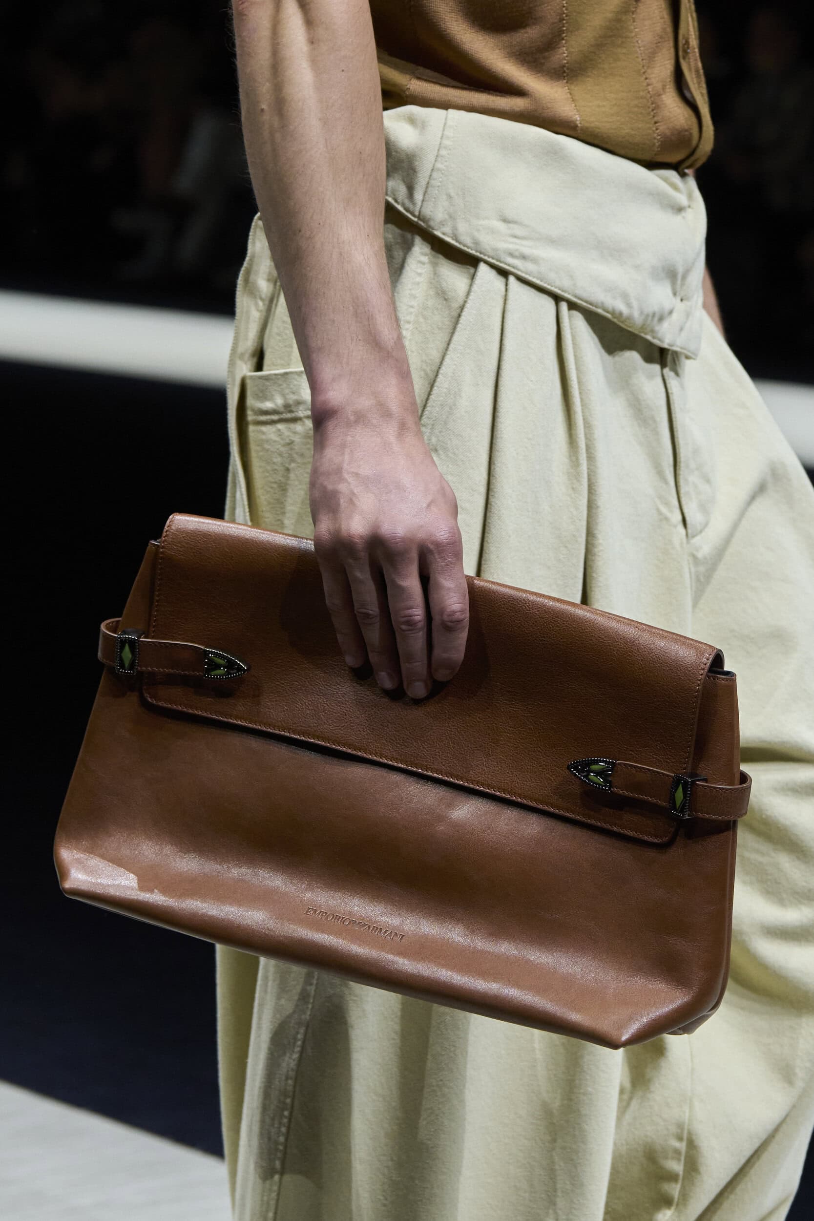 Get an exclusive look at Emporio Armani‘s innovative Spring 2025 men’s fashion show accessories featuring footwear, handbags, eyewear, and more from the runways of Milan Men’s Fashion Week, held in June 2024.