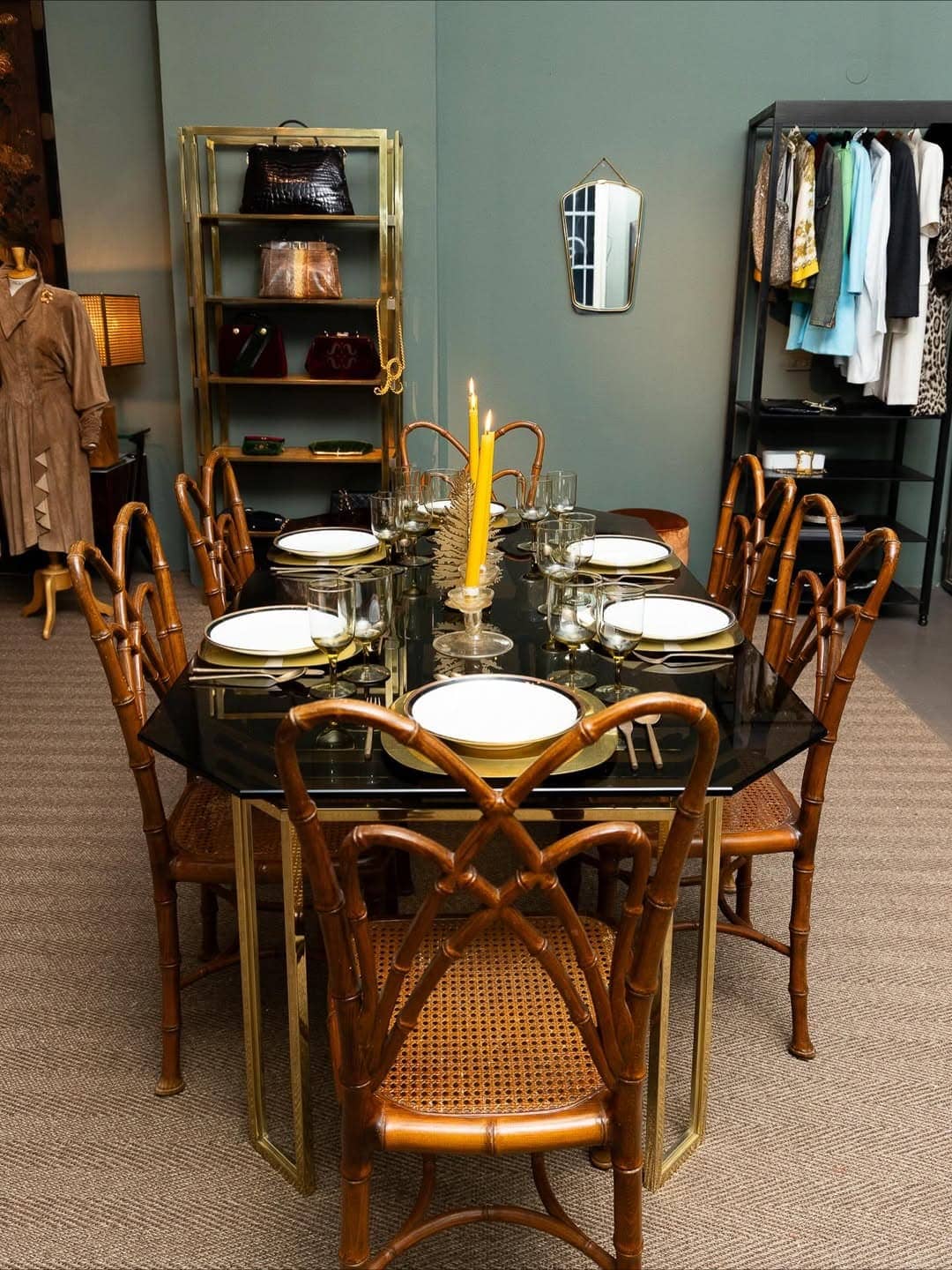 Fashion and tableware selections pay homage to the Fendi family’s storied past. Vintage Roberta di Camerino bags, 1980s suede pieces designed by Karl Lagerfeld for Fendi, and Kenneth Jay Lane jewelry mingle with Richard Ginori and Limoges porcelain on floor-to-ceiling shelving. The curation deliberately resists uniformity, favoring contrast and texture over one-note styling.