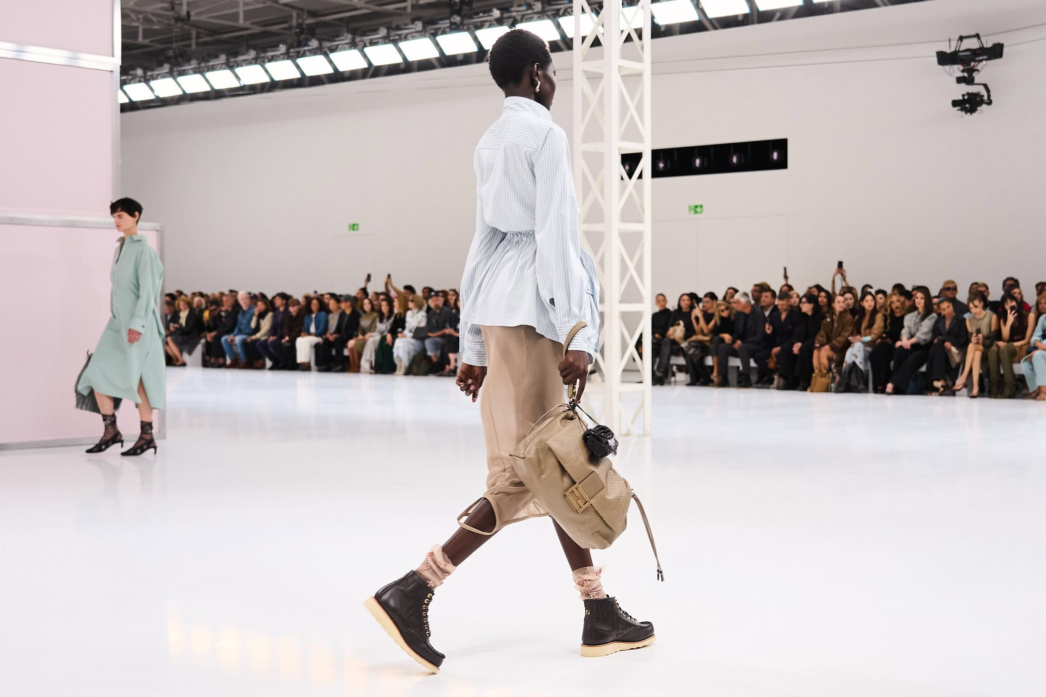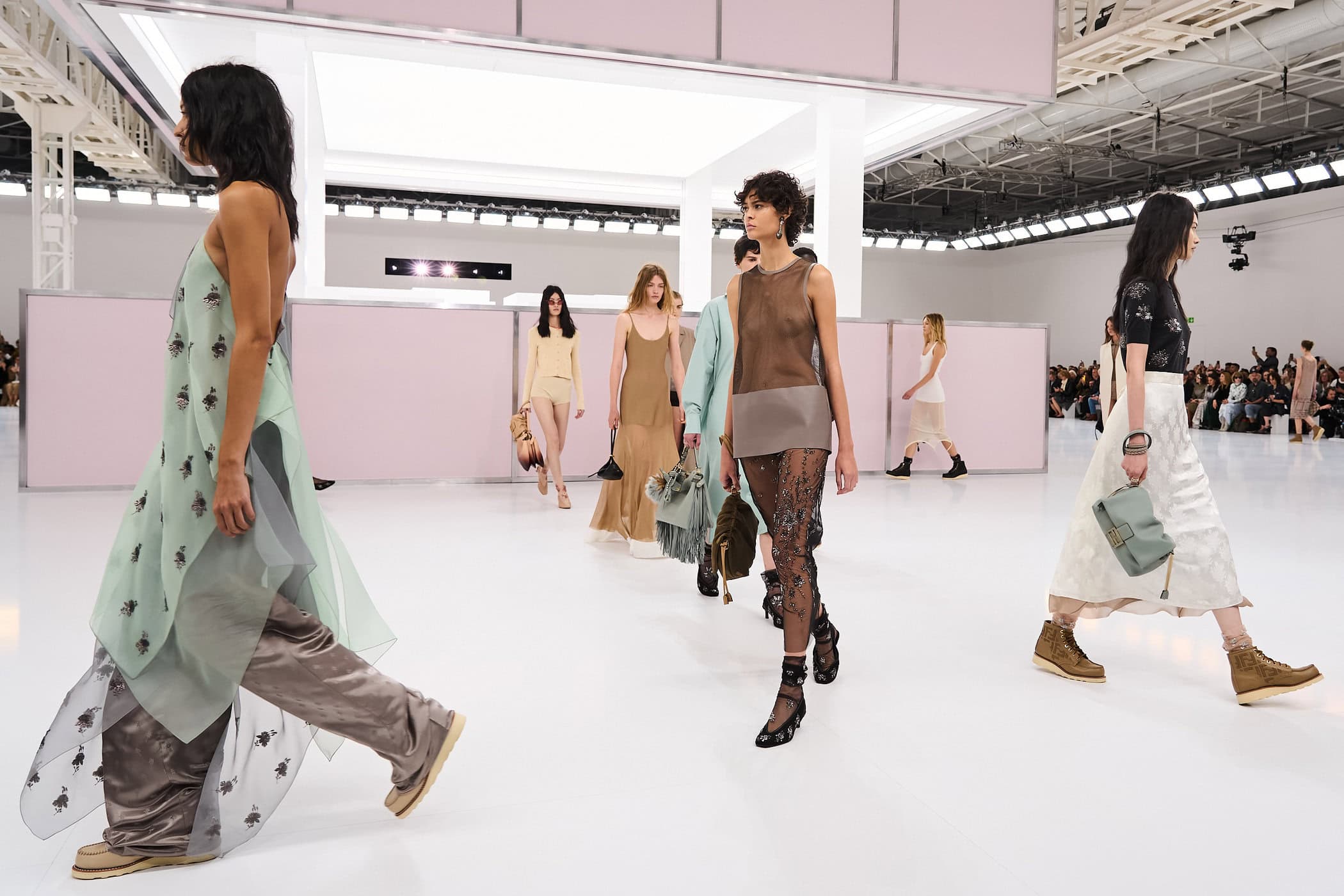 Discover the immersive atmosphere and striking staging of Fendi‘s Spring 2025 fashion show at Milan Fashion Week, creating an unforgettable mood this season.
