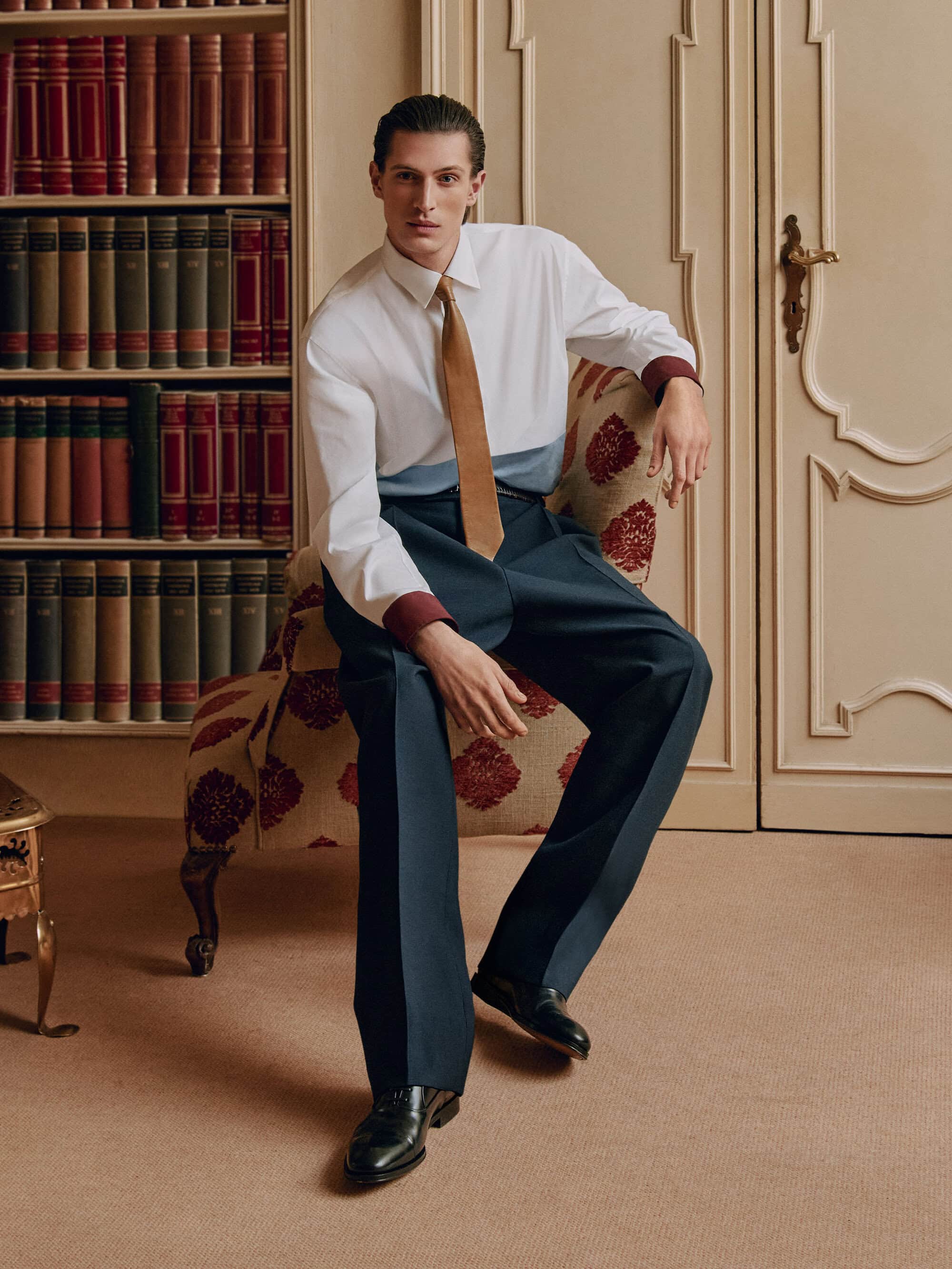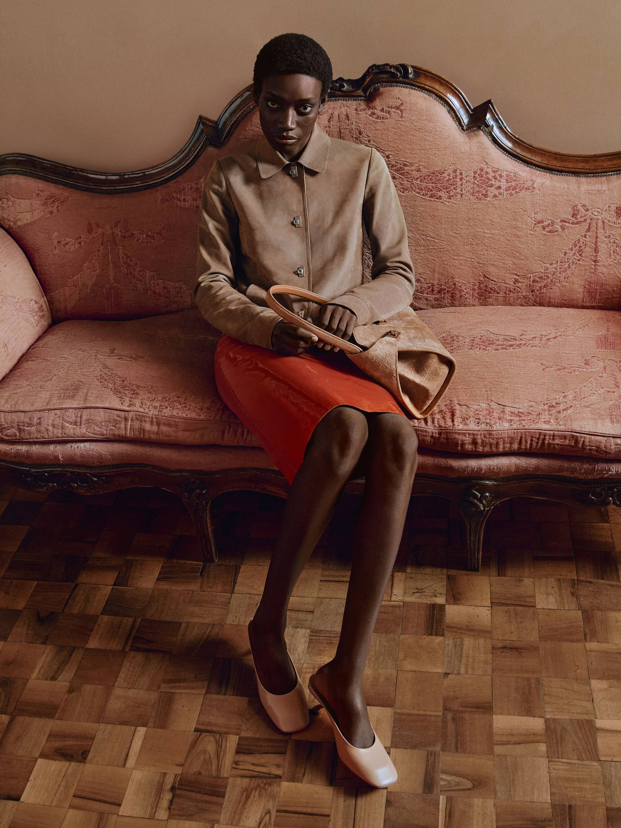 The collection integrates into this domestic theater with quiet confidence. The woven Hug bag rests within reach, never forced into focus but always present. The sculptural S-heel mules punctuate the frame with a knowing elegance, while silk prints catch the ambient light as if responding to the room’s shifting emotional temperature. Craft, here, is not announced—it’s absorbed, part of the language rather than the headline. It’s a sophisticated move, and one that aligns seamlessly with Ferragamo’s legacy of understatement.
