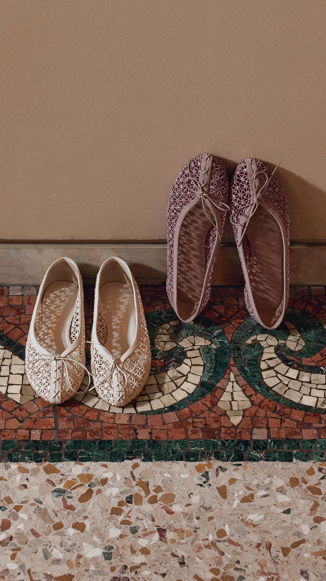 Central to the women’s offer is the Vara bow, one of Ferragamo’s most recognizable house codes since 1978. The detail appears across metallic slingback sandals, ballerinas, satin pumps embellished with degradé crystal applications, and macramé lace low-heel pumps and flats in softer neutral tones. The approach underscores a continued strategy across luxury accessories: recognizable iconography made relevant through refreshed fabrication rather than wholesale reinvention.