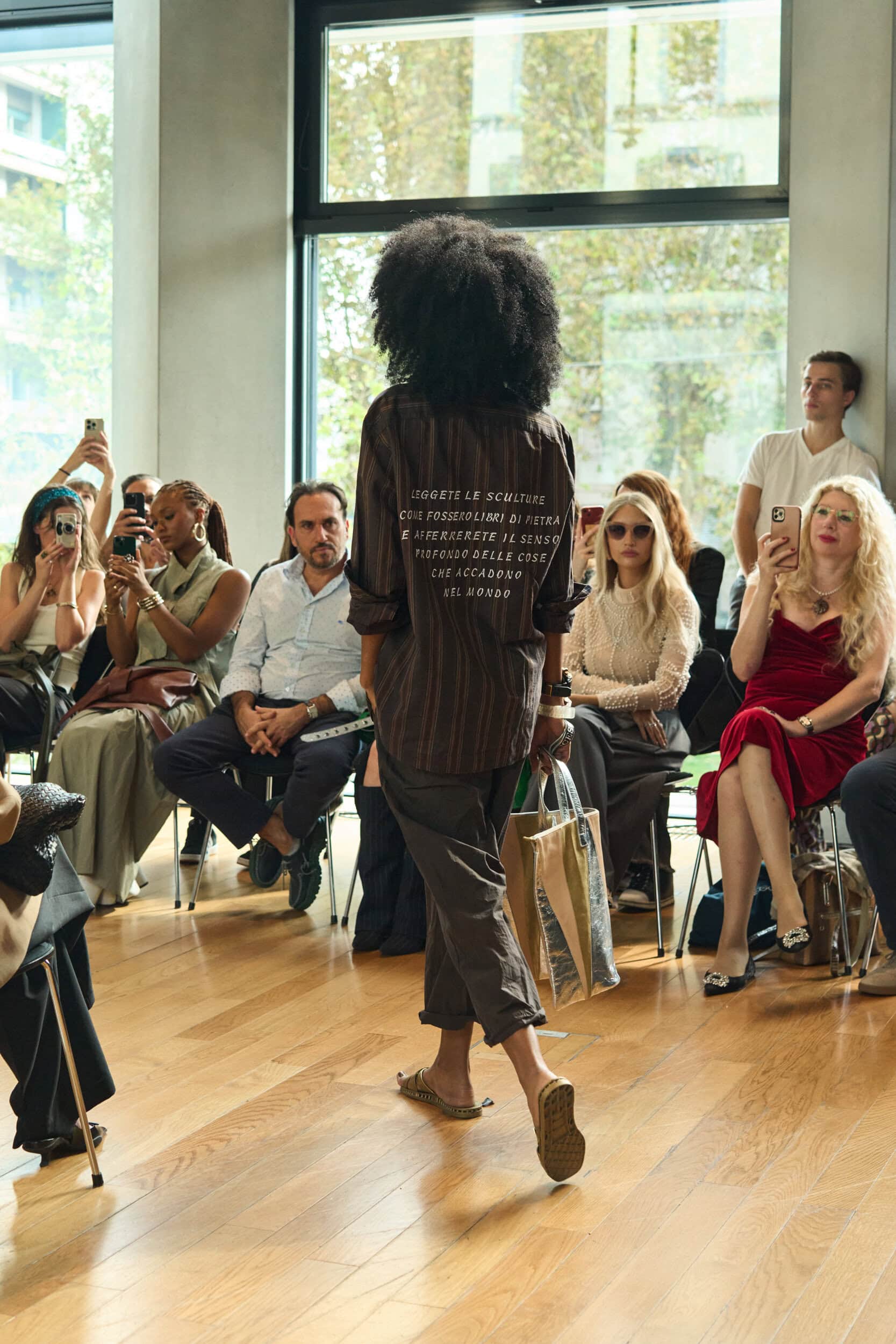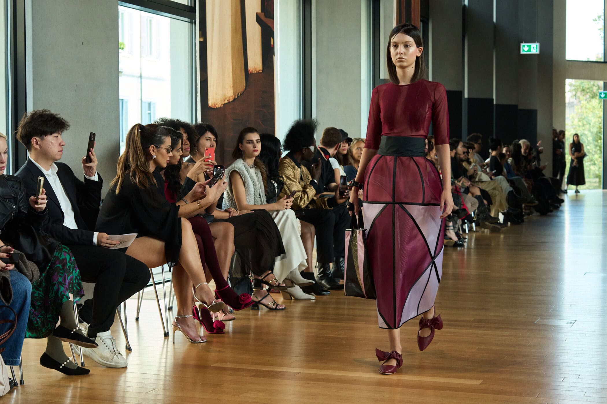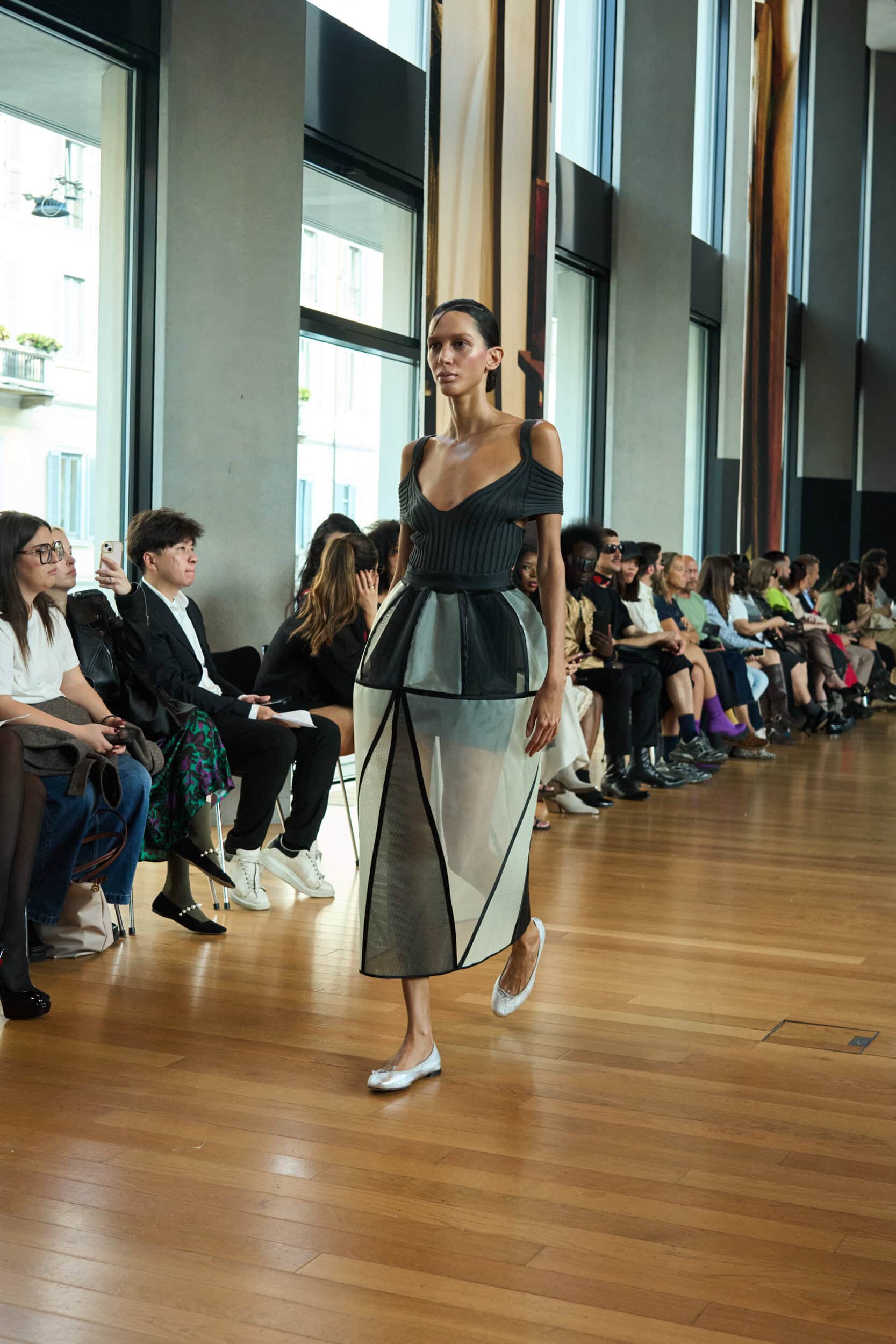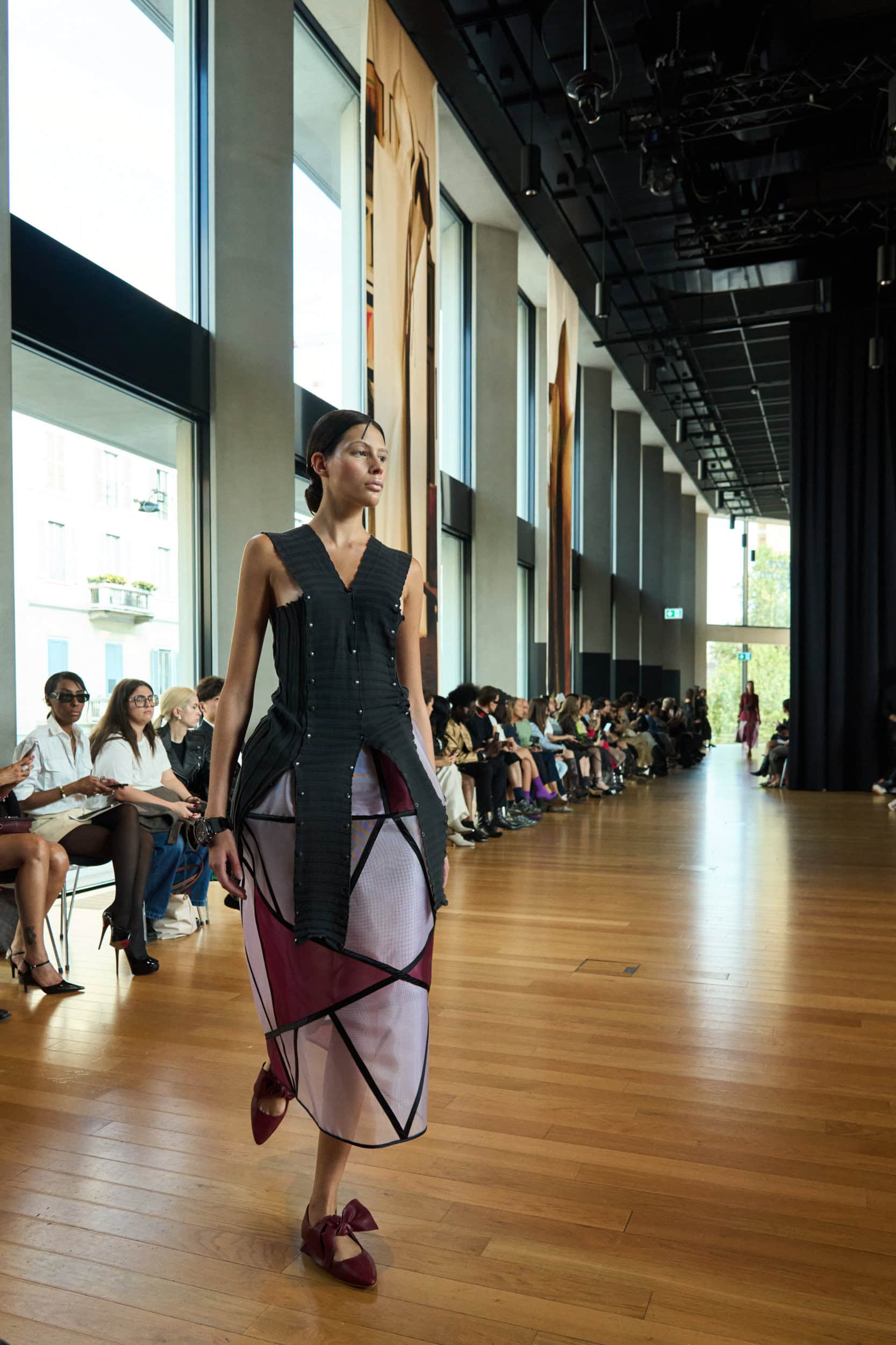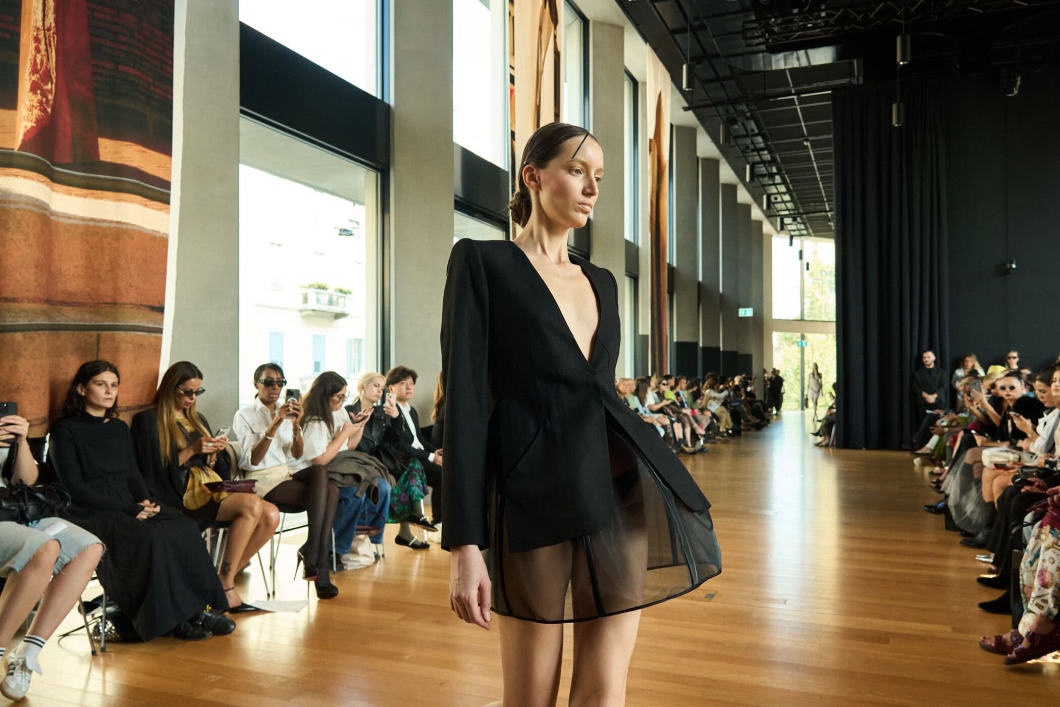 Discover the immersive atmosphere and striking staging of Francesca Liberatore‘s Spring 2025 fashion show at Milan Fashion Week, creating an unforgettable mood this season.