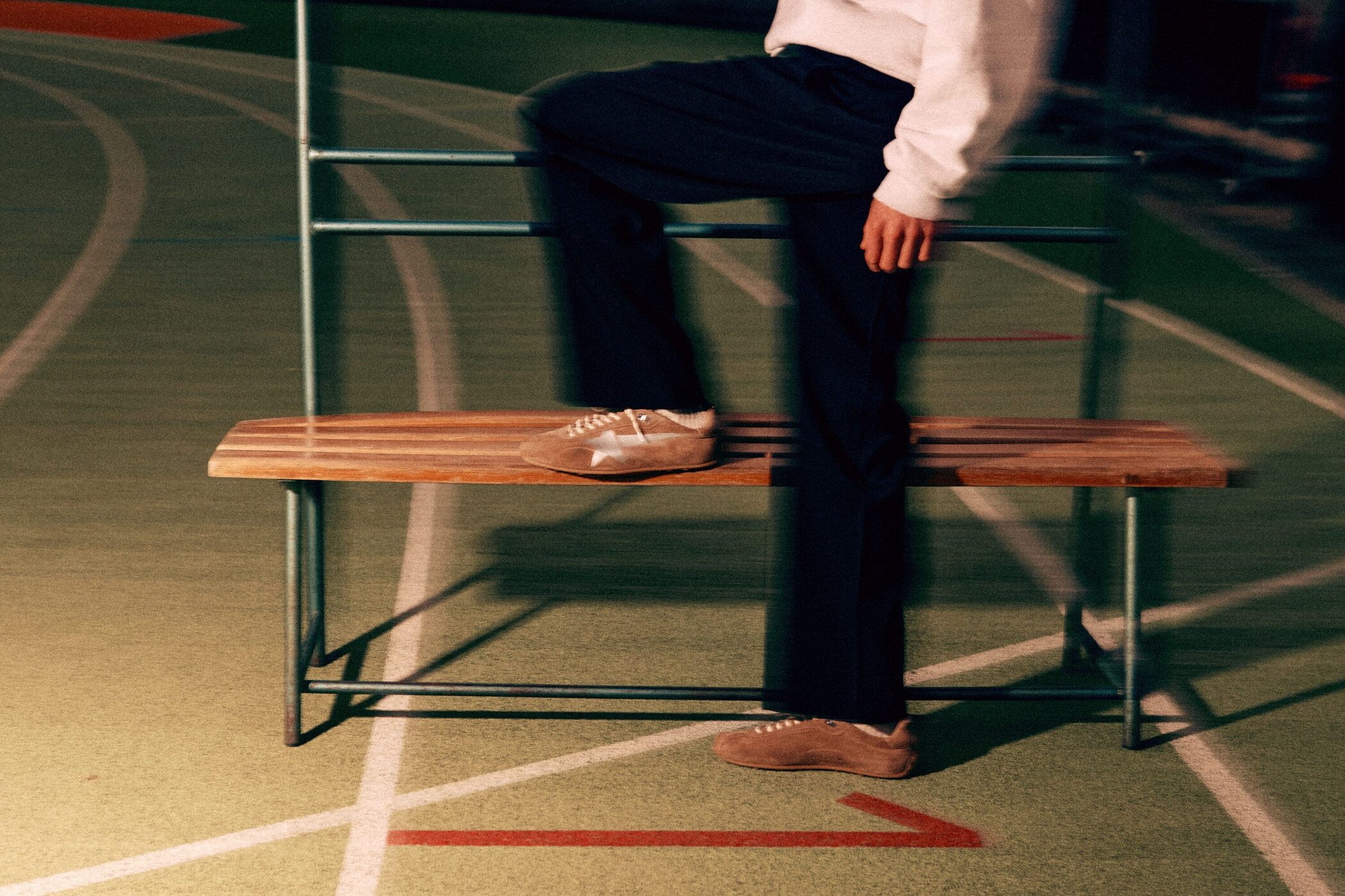 Visually, the campaign departs from Golden Goose’s typical sun-faded, lifestyle-oriented imagery, instead situating the models on a running track under low, artificial lighting. The atmosphere is deliberately unsettled—motion blur, grain, and off-kilter framing create a sense of instability that mirrors the idea of constant forward movement. This shift toward a more cinematic, almost nocturnal energy introduces a tension that feels more aligned with performance than leisure, though it occasionally borders on stylization for its own sake.