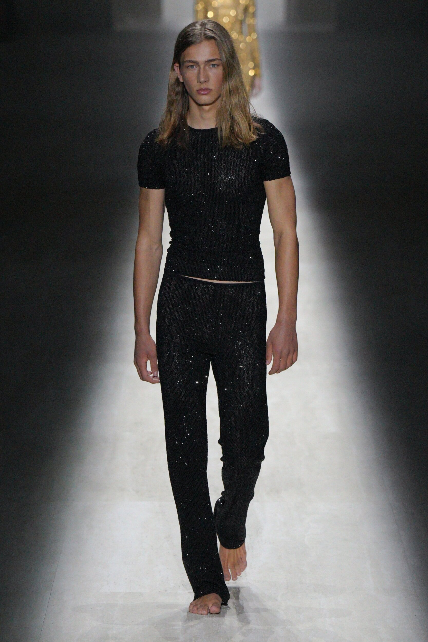 On first look the most statement-making looks appear most suitable for after dark and after parties, but across the 80+ looks there were also ‘multiple modes of dressing.’ Exploring the possibilities of ‘new garment types’ felt like a reframing (rather than inaccessible innovation). Shrink-to-fit jackets were worn as tops, trackdresses formed of – you guessed it – tracksuits and dresses, sequin sets will make lounge wear an infinitely dressier proposition for ‘party boys’, and one of his favoured design tropes i.e. the legging-cum-trouser has found a new home.