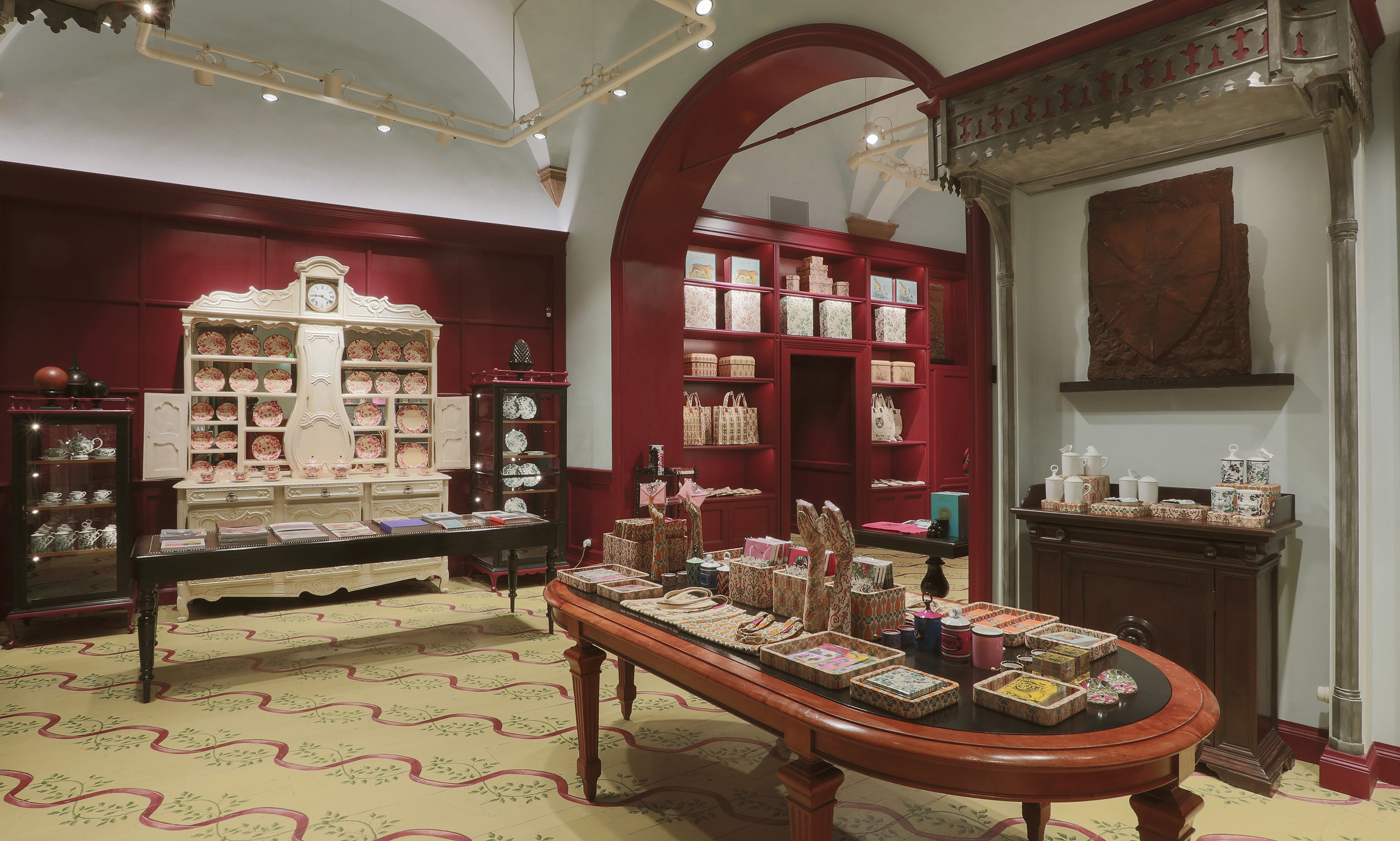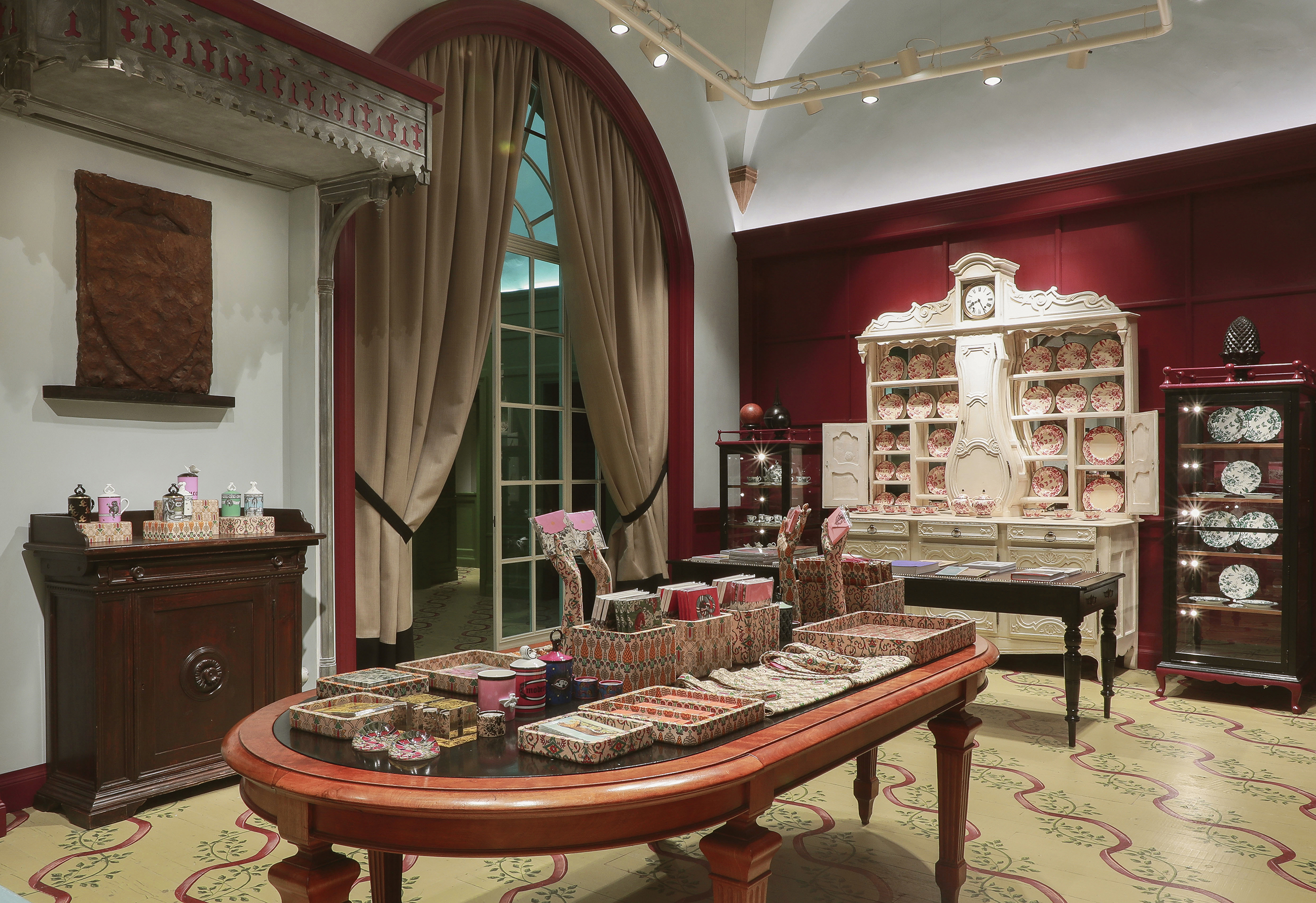The retail space has been designed to respect and celebrate the original architecture of the palazzo. The room that houses ready-to-wear, accessories, and décor features a color scheme that combines burnt yellow and red to pick out the architectural forms of arched doorways and windows and the floor is made of hand-aged marble tiles.