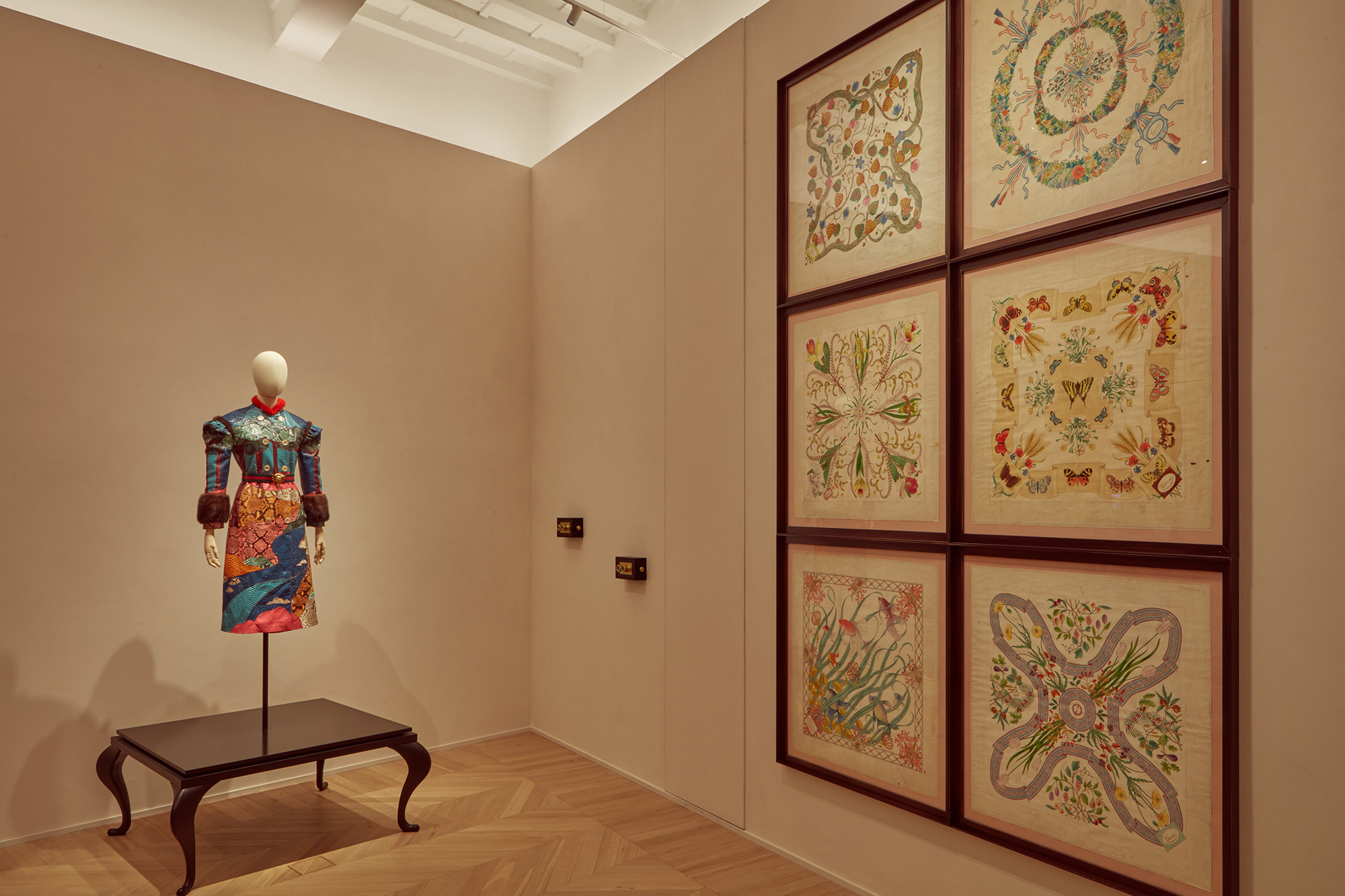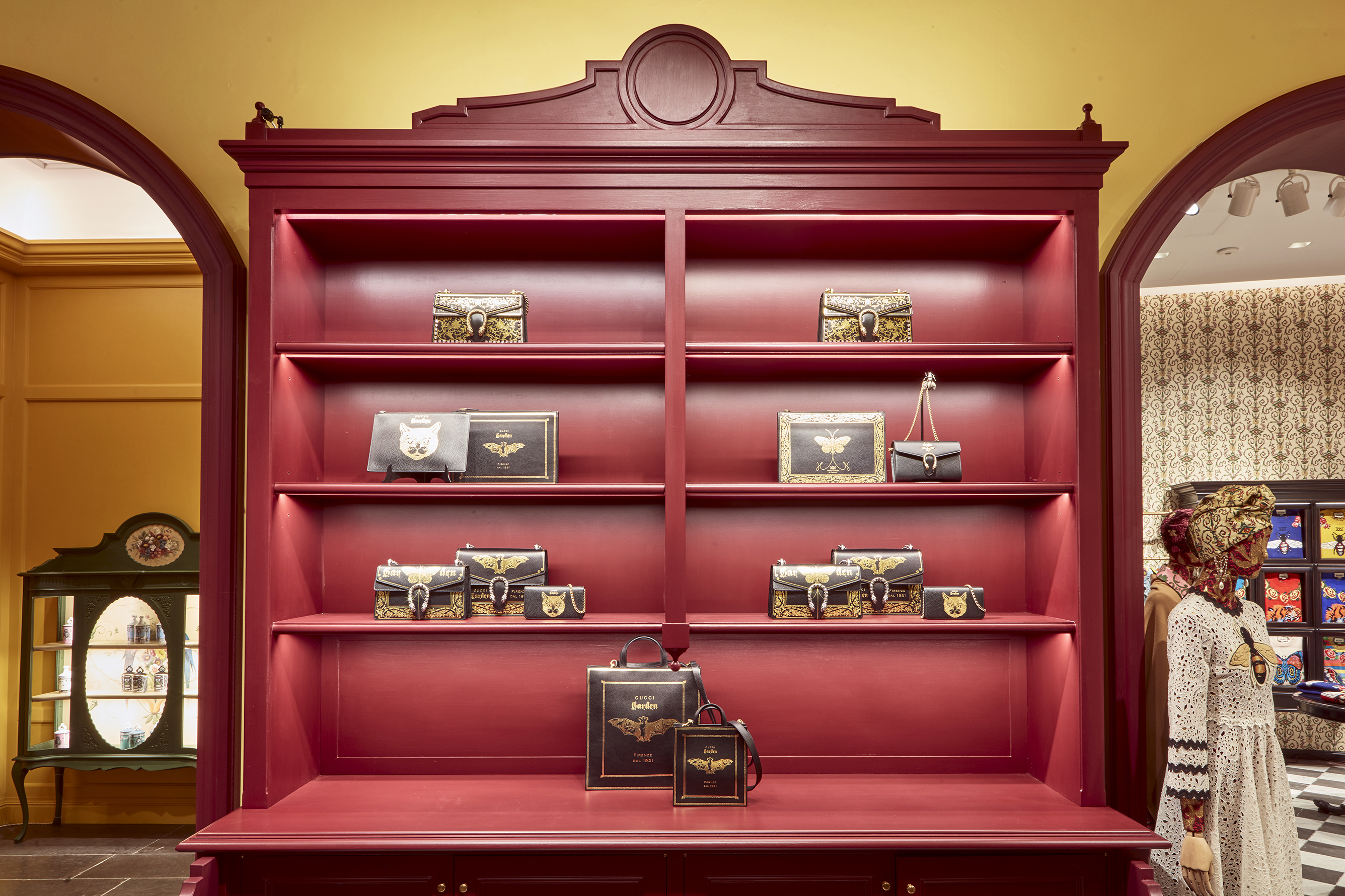 The Gucci Garden is set out over two floors and features clothing, accessories, video installations, artworks, documents, and artifacts all organized by separate themes. Contemporary pieces are juxtaposed with vintage items and artists Jayde Fish, Trevor Andrew, and Coco Capitán have been invited to decorate walls. Their work sits alongside Gucci fabric wallpaper and a nineteenth-century equestrian oil portrait by Domenico Induno.