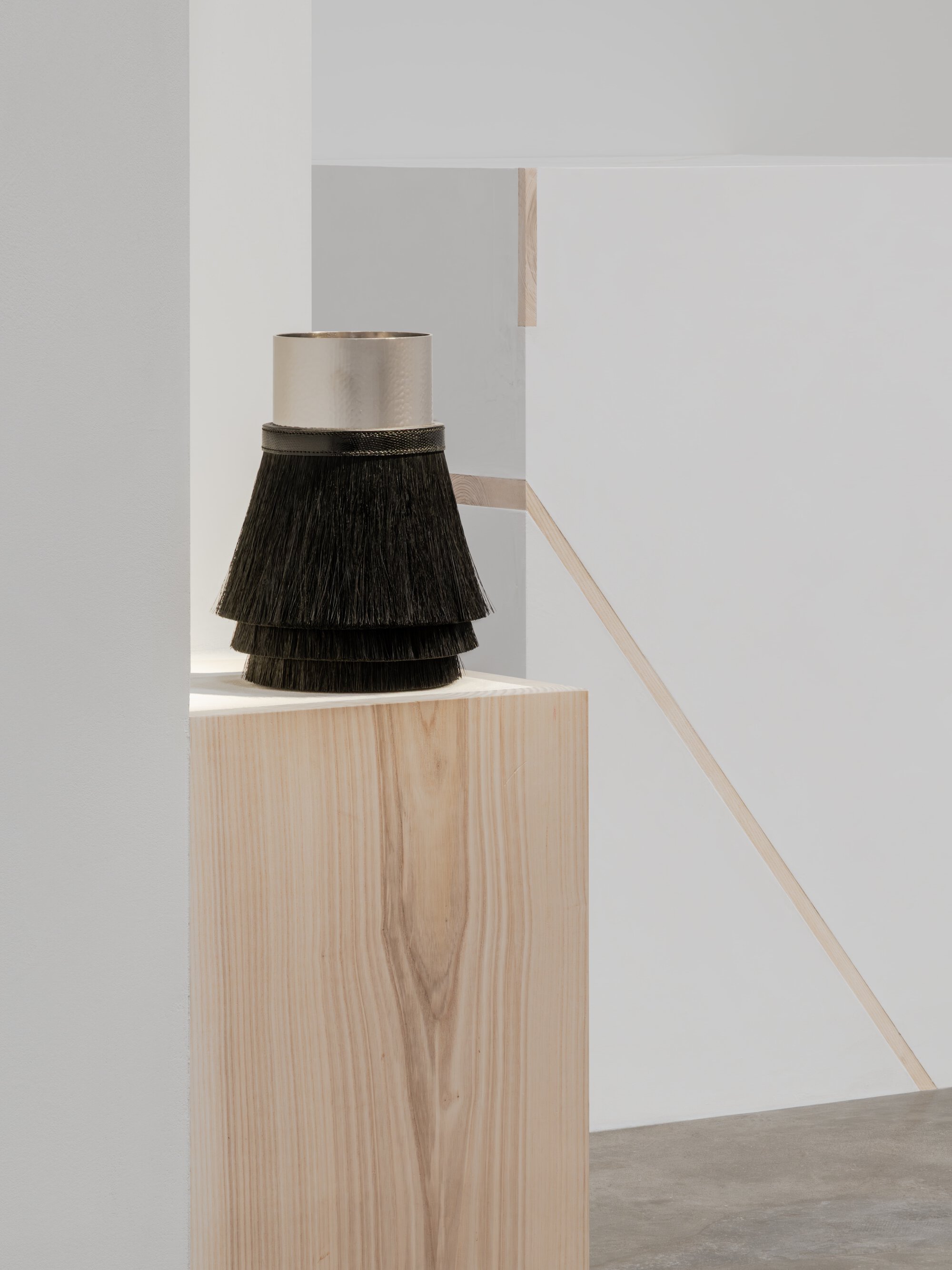 At the center of the object offering is Palladion d’Hermès, a new line of home pieces in hammered metal combined with leather, horsehair, or wood. The collection draws on the figure of Pallas Athena and frames the pieces as contemporary protective objects, with Hermès emphasizing the visual texture created by the silversmith’s hammer and the tension between reflective metal surfaces and warmer natural materials. The line includes a vase sheathed in black horsehair and calfskin, a jug with a cassia wood handle, a leather-clad cylindrical vase that nods to the house’s equestrian heritage, and a centrepiece finished with two-tone leather lacing.