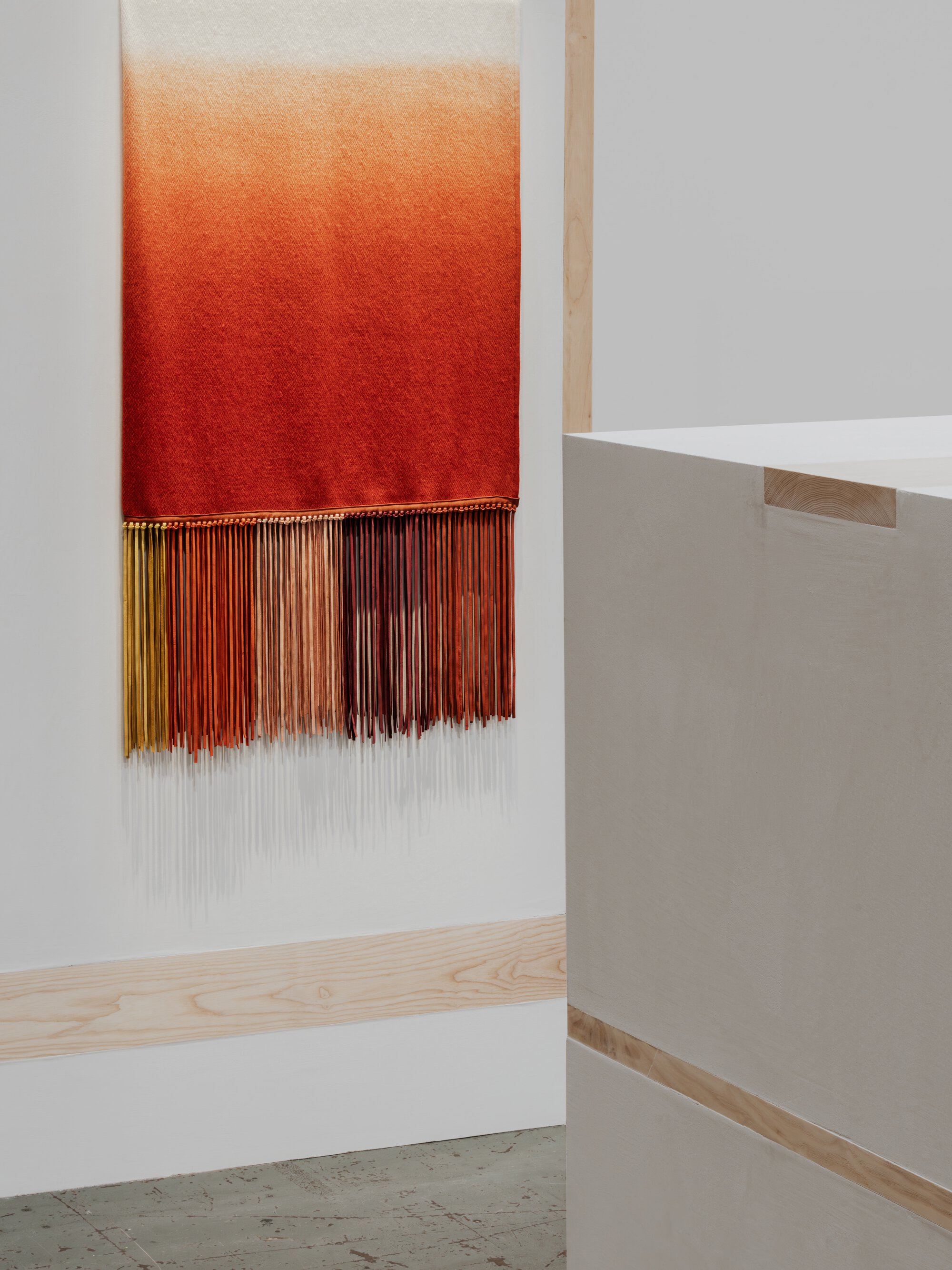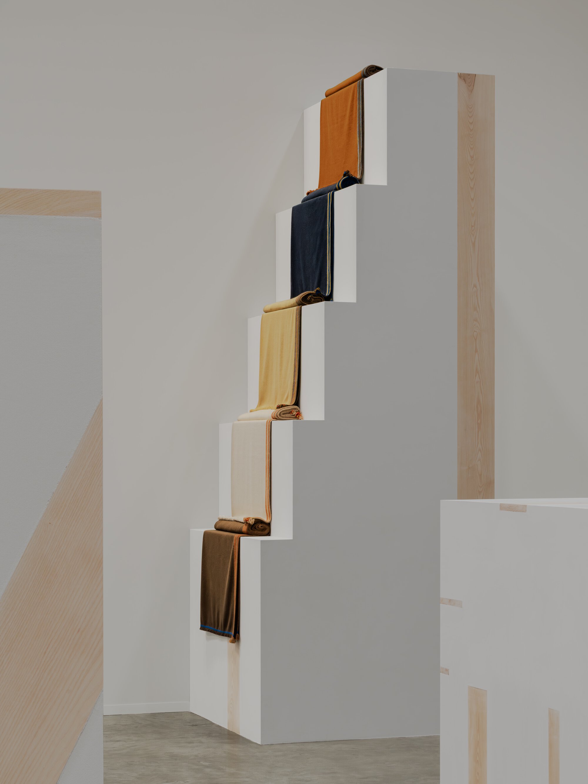 Alongside the metal objects, Hermès presented a textile group that places craft process at the forefront. The house describes the category as an ongoing site of experimentation, with hand-woven cashmere throws produced in Nepal and finished through resist-dyeing, embroidery stitching, ribbed webbing, and intricate panel construction. The Clamp & Dye throw uses four joined panels to build a geometric composition, while H Letter, designed by Hyunjee Jung, applies the traditional Korean art of bojagi to linen voile and cashmere, requiring hundreds of hours of work and revealing a discreet oversized H within its structure. Other pieces include Sangles Sellier, edged with ribbed webbing inspired by equestrian straps, and Aventure, a hand-dyed cashmere throw finished with long velvet lambskin fringing in sunset-like tonal gradients.
