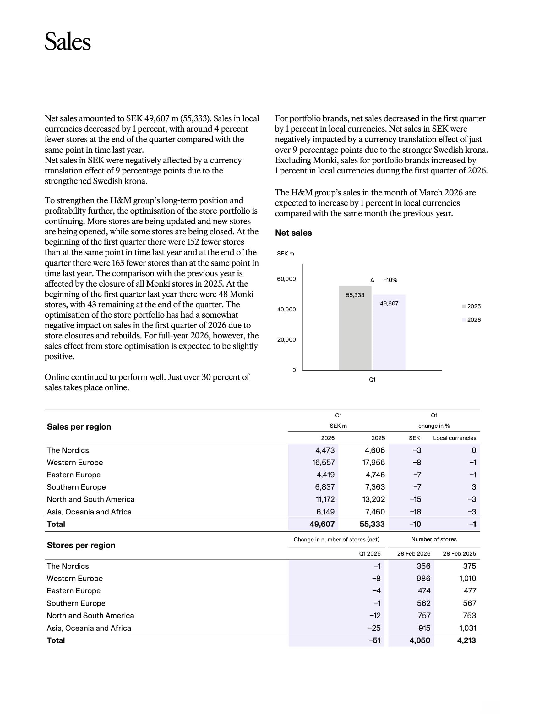 Sales for the three months to February 28 fell 1 percent in local currencies, with performance weighed down by a reduced store base. The group operated 163 fewer locations compared to the same period last year—approximately a 4 percent reduction—following a wave of closures that included the full exit of Monki’s physical retail footprint.