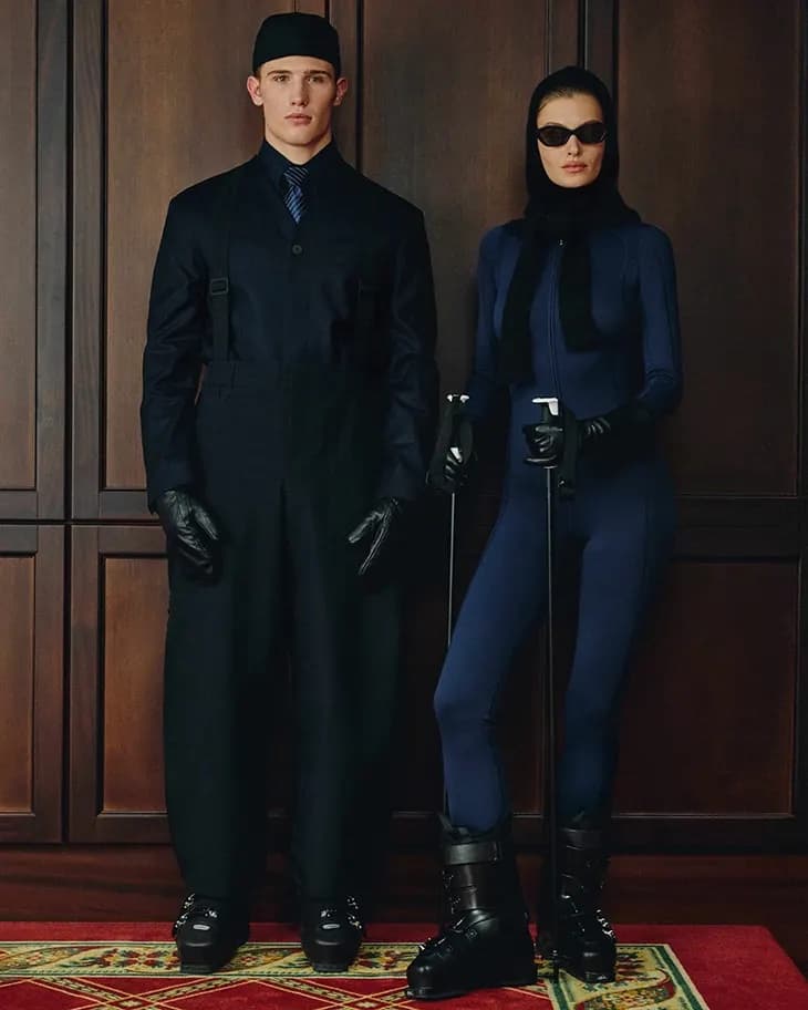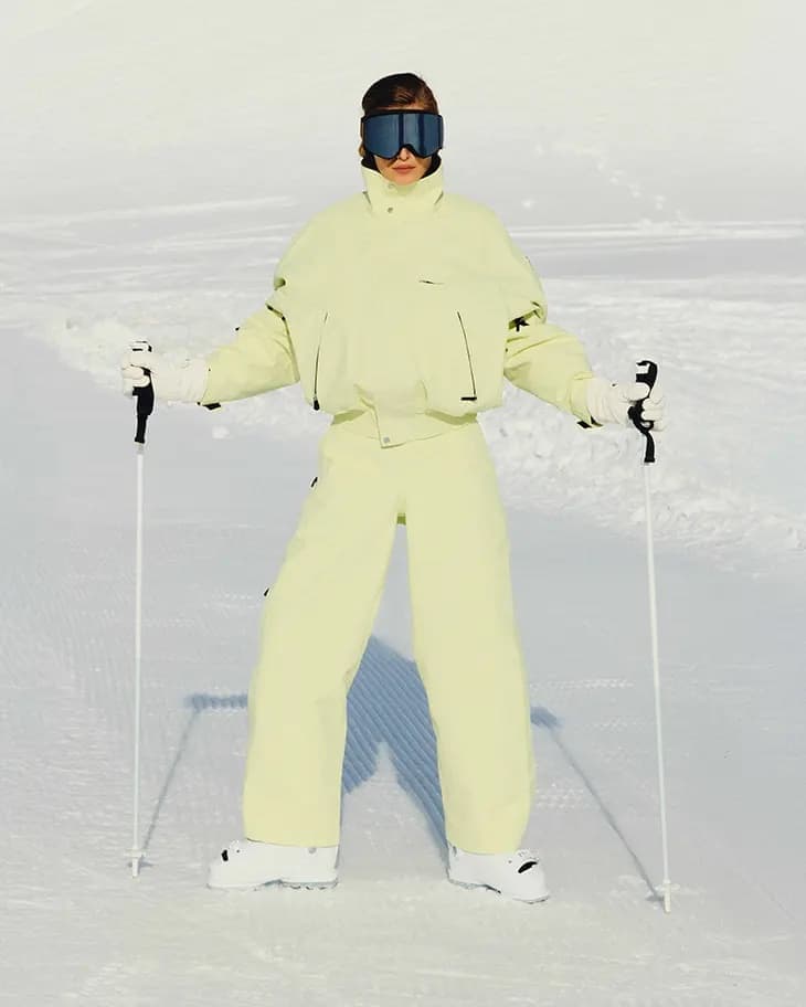 Beyond apparel, Jacquemus has teamed up with French specialist brand Lacroix to create a matching pair of skis and mask, adding a sporty extension to the collection’s aesthetic. Drawing inspiration from vintage ’80s ski styles, the collaboration infuses retro references with modern minimalism, reflecting the designer’s personal fascination with skiing and his broader interest in reinterpreting heritage sportswear. This marks a fresh chapter for Jacquemus, whose winter pop-ups in Courchevel have already cemented the brand’s affinity for alpine settings, now translating the Provençal flair of his signature collections to the slopes.