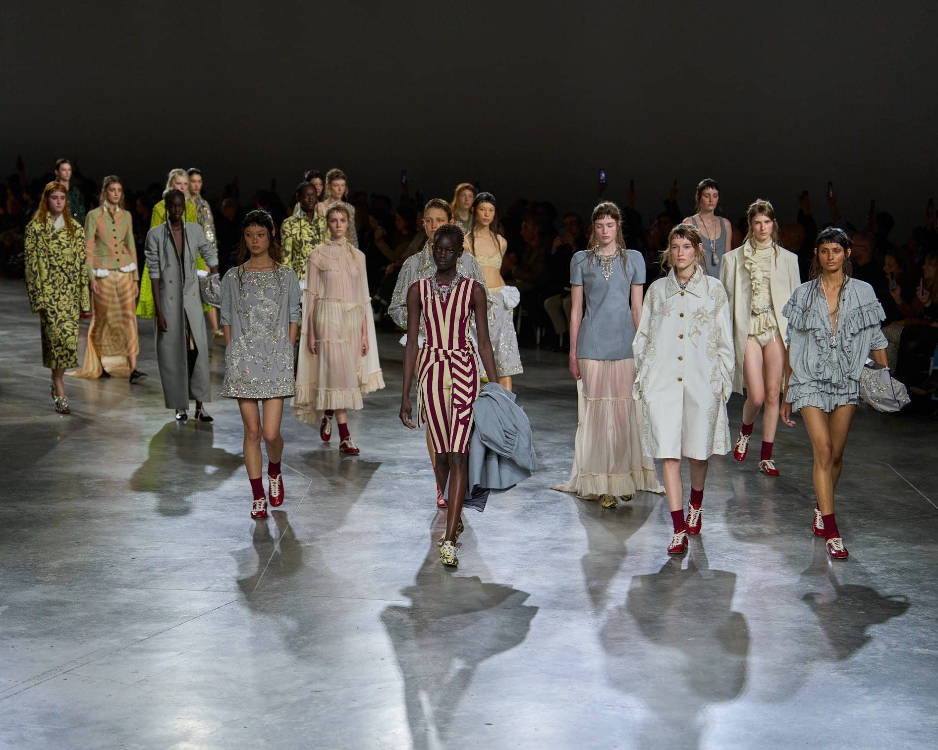 His jewelry echoed the same shimmer. “For me, the Dries woman is a woman who loves objects, likes to collect things,” he told me, explaining how rhinestones, shoelaces, and small rings were assembled like keepsakes. “Things you want to keep close to you.”