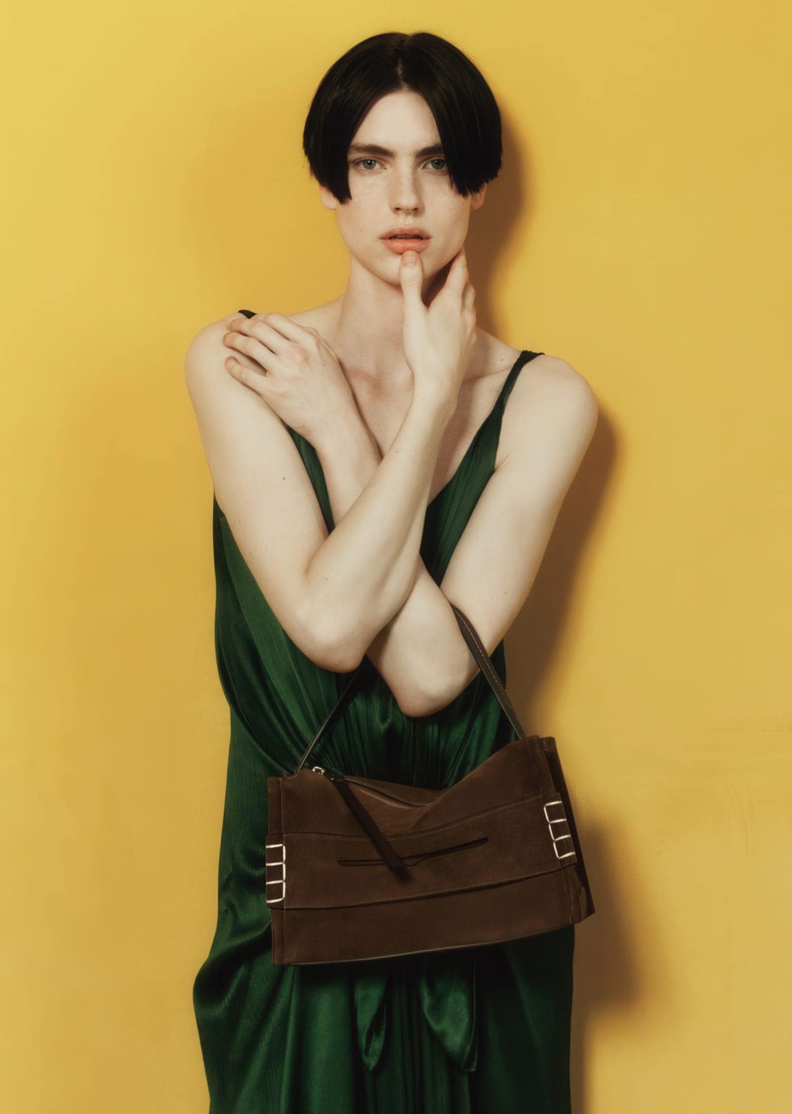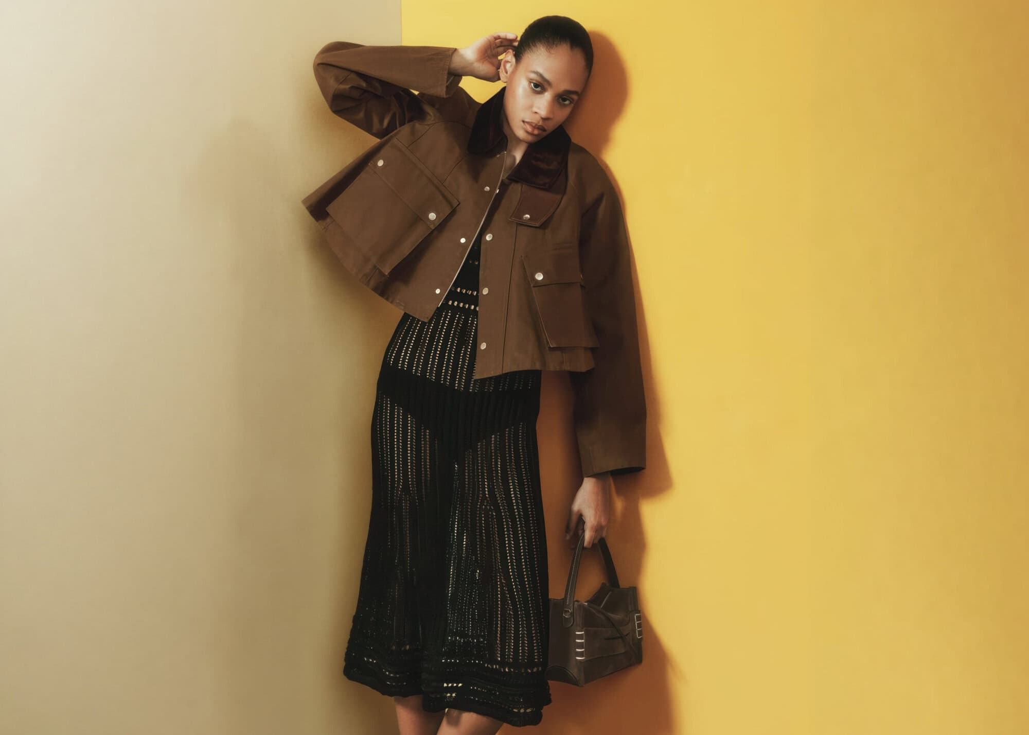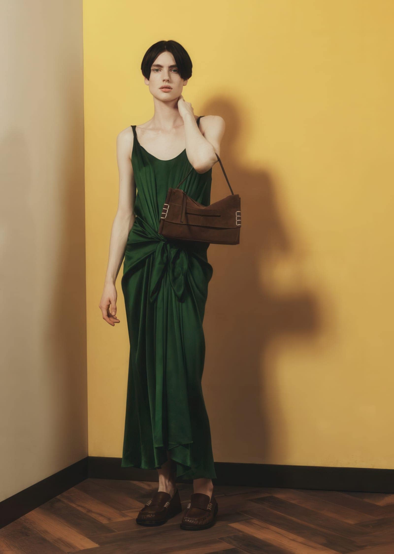 Set against saturated golden backdrops and softly draped curtains, the campaign trades narrative complexity for visual precision. The staging is minimal but deliberate: polished wood floors, clean corners, and controlled lighting create an environment that feels both domestic and abstract. Within this space, the models—Bai, Charlie Jones, and Chloe Paredes—move with a quiet restraint, their poses elongated and introspective, allowing the products to anchor each frame without slipping into overt commerciality.