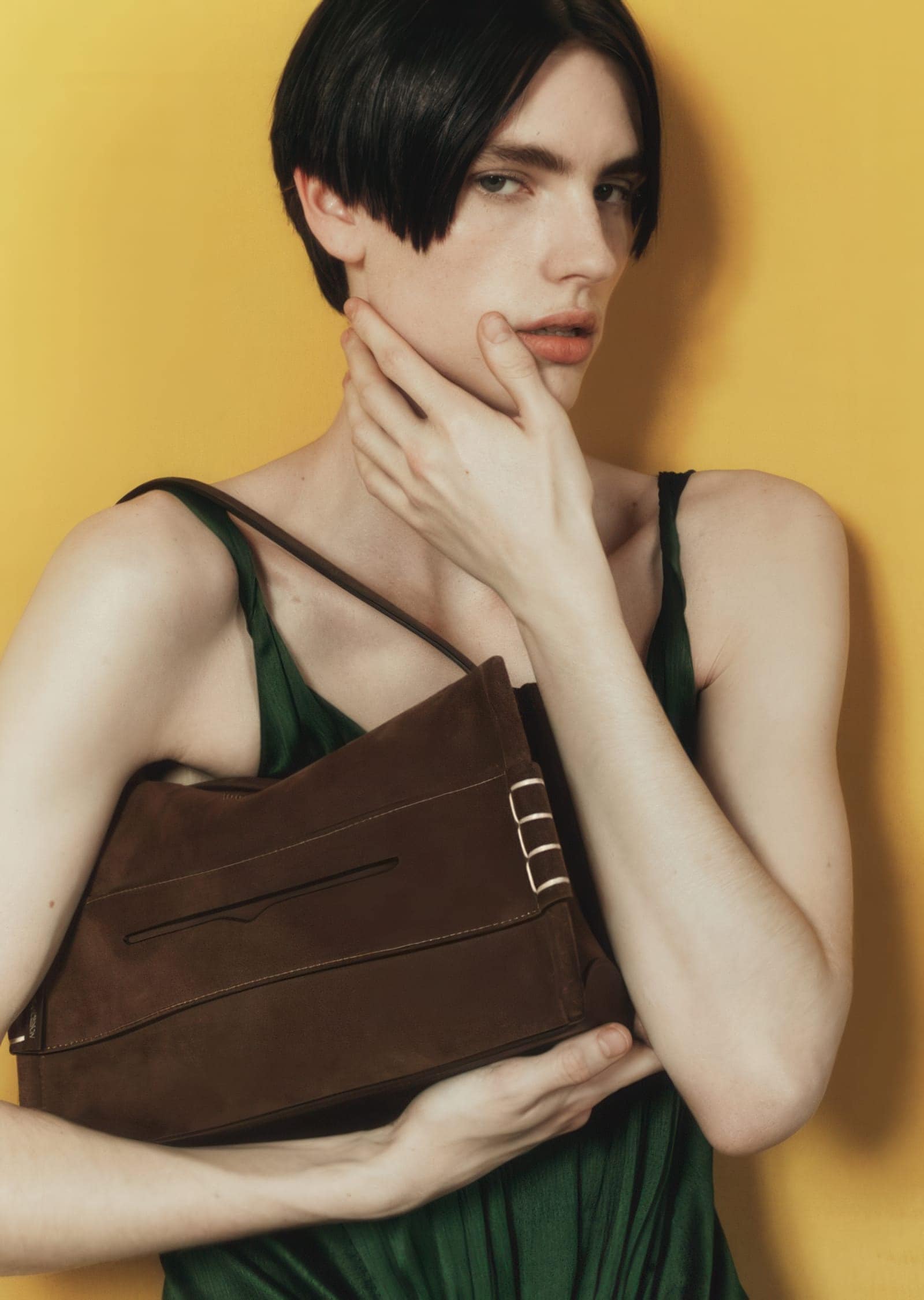 Kaski’s photography leans into softness rather than sharpness, lending the images a slightly diffused, almost nostalgic quality. This choice tempers the boldness of the color palette, preventing the campaign from tipping into excess. At the same time, the chromatic intensity—mustard yellows, deep greens, warm browns—injects a subtle tension, balancing warmth with a controlled artificiality that feels distinctly JW Anderson.