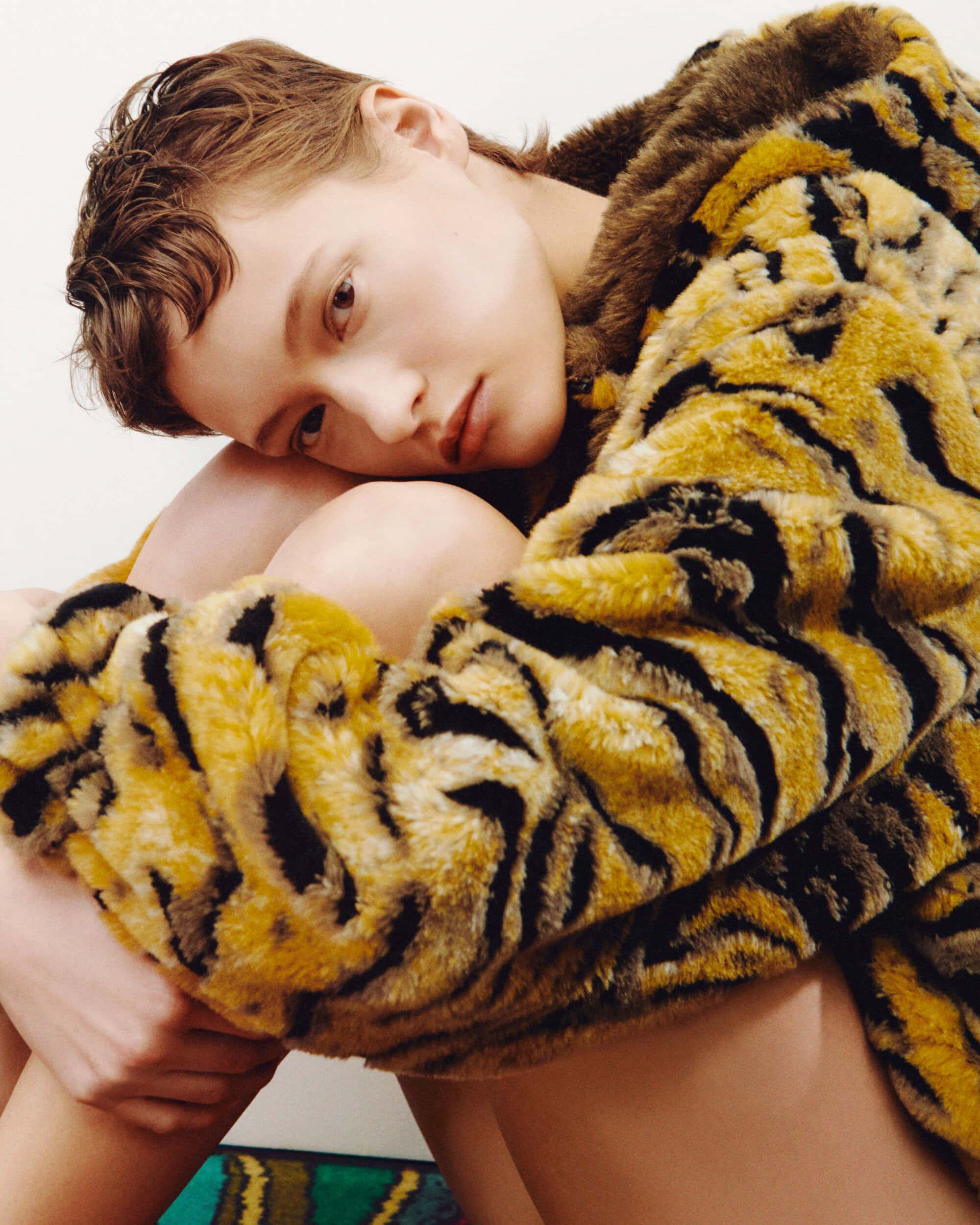 The collection’s graphic language threads itself through these quiet scenes. The Kenzo Tiger — revived from the Fall 1998 archives — prowls across jacquards and prints with renewed sharpness, while a trompe-l’œil artwork from a 1972 knit injects a note of play into knitwear and outerwear. Military references from the Fall 1978 collection add structure and purpose: Brandenburg details, metal buttons, and generous pockets give the looks a utilitarian cadence that counters the softness of the tailoring. It is in these contrasts — discipline and decadence, reduction and ornament — that the campaign finds its narrative.