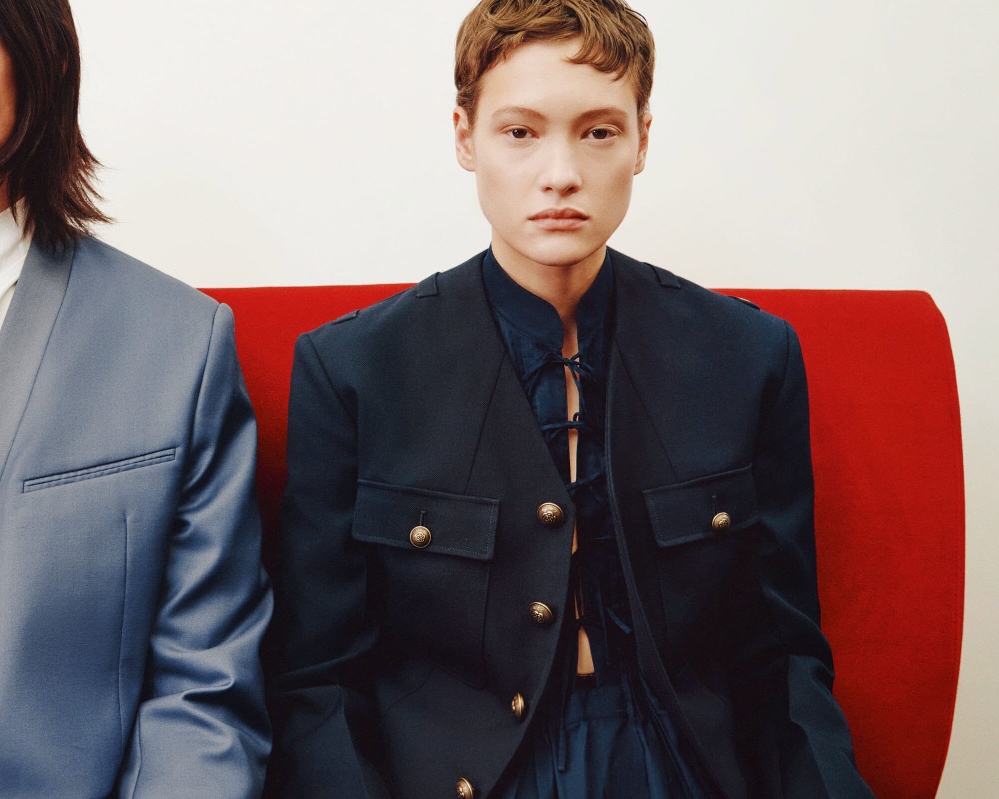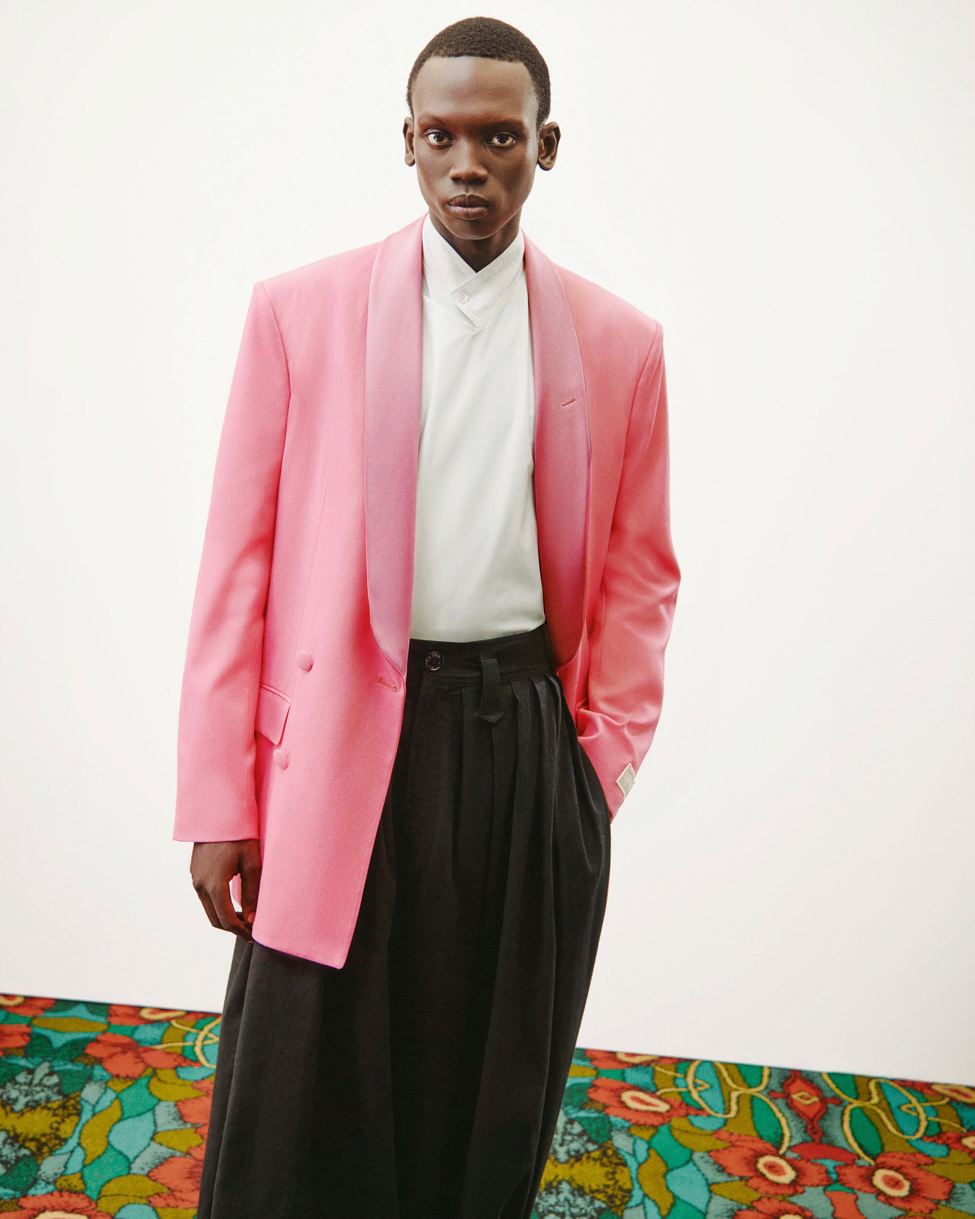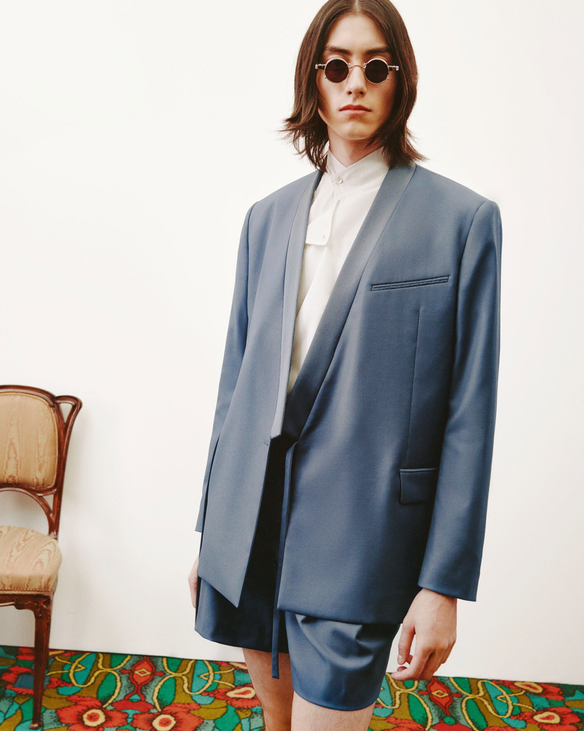 Brun’s imagery leans into clarity and composition, reducing gesture to simple, deliberate poses and emphasizing the gravity of tailoring against the pale plane of the inserted white wall. The stillness heightens the anticipation. Opulence lingers in the periphery — mirrors, ornament, history — but the clothes occupy the foreground with confident restraint. In this setting, Nigo’s reinterpretation of Kenzo Takada’s kimono-inflected tailoring reads as both homage and evolution, especially in the satin and velvet shawl lapels that glide across menswear and womenswear silhouettes. The mood is disciplined, cinematic, almost studio-like, yet the undercurrent of nightlife remains — the sense that the city is waiting just beyond the frame.