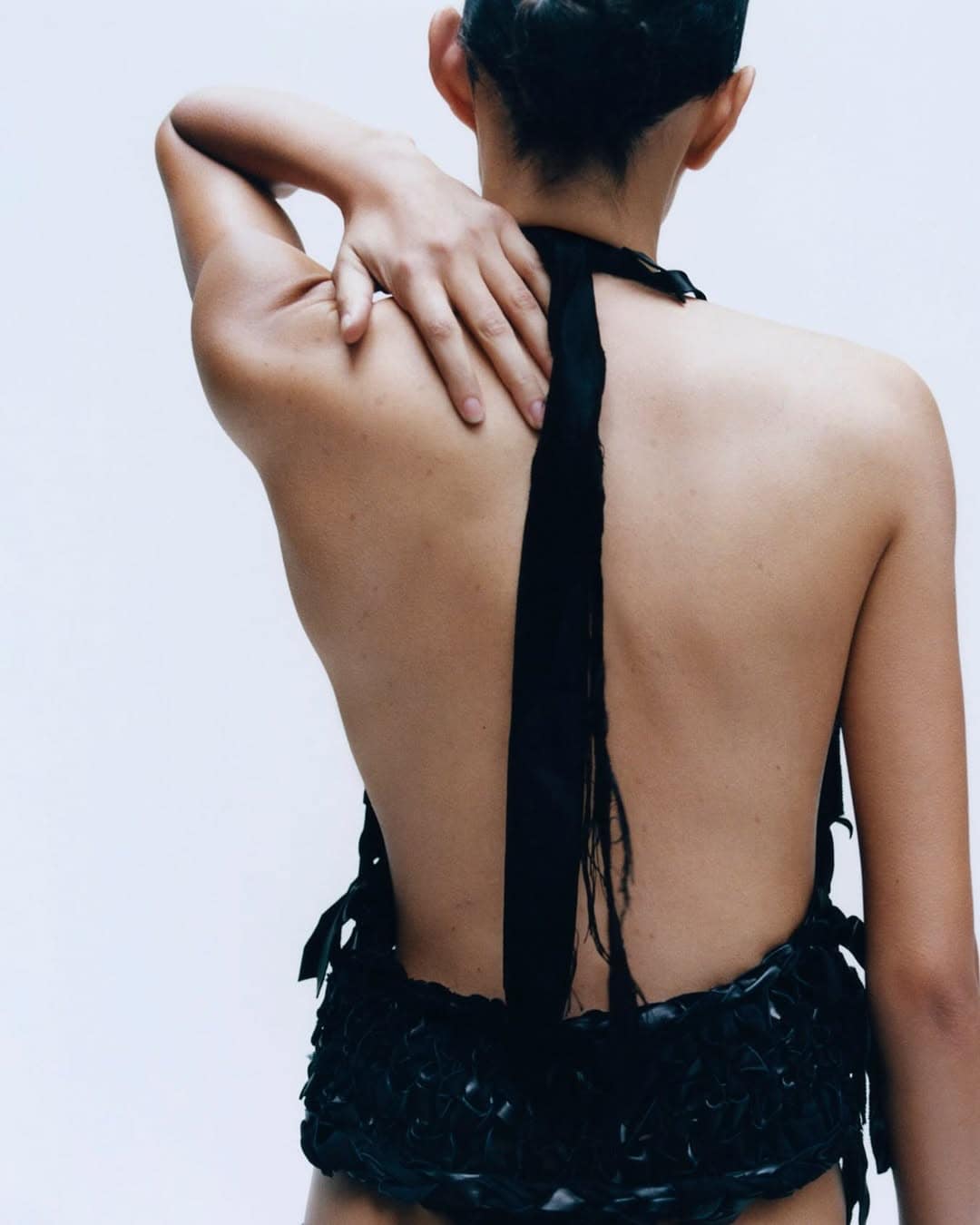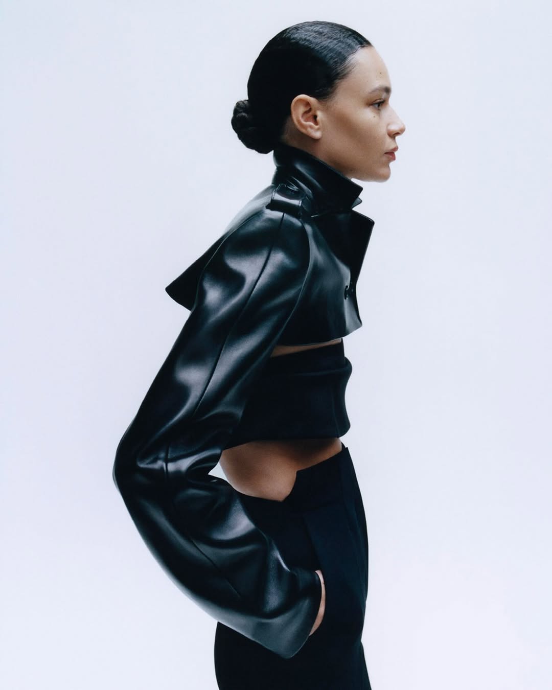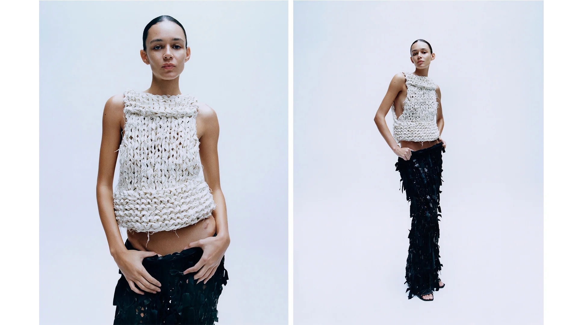 Set against a stark, almost clinical backdrop, the campaign strips away context to focus entirely on form, surface, and silhouette. Walton moves through the frame with quiet control, her presence oscillating between strength and softness. A sculptural black leather jacket, cropped with architectural precision, introduces a sharp, almost confrontational structure, while sheer hosiery and elongated lines temper the severity with fragility. Elsewhere, texture takes precedence: a loosely woven ivory knit feels raw and tactile, in contrast to a fluid, feathered black skirt that absorbs and diffuses light. The interplay between matte and sheen, weight and air, reinforces the campaign’s underlying tension—hardness softened, softness given edge.