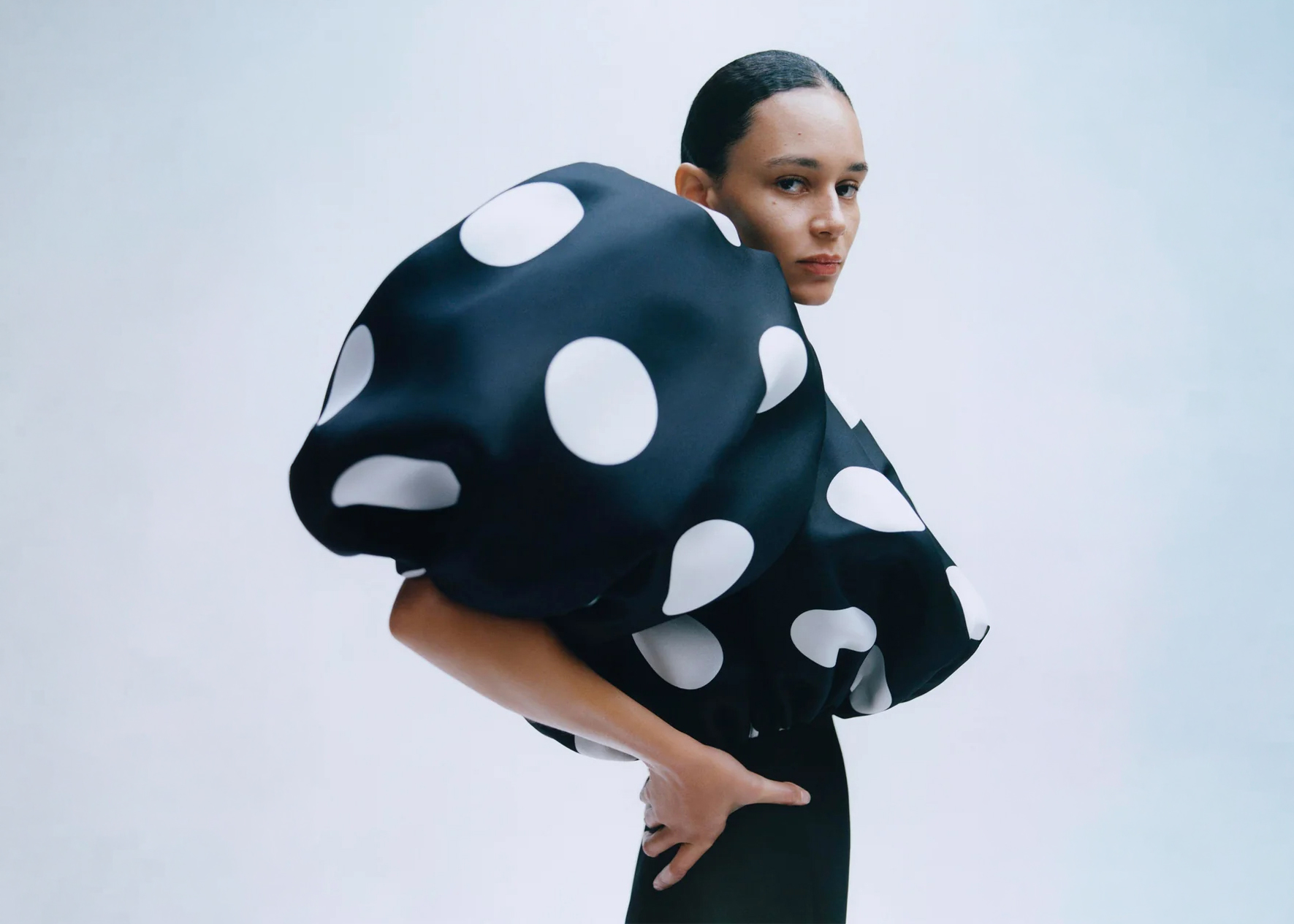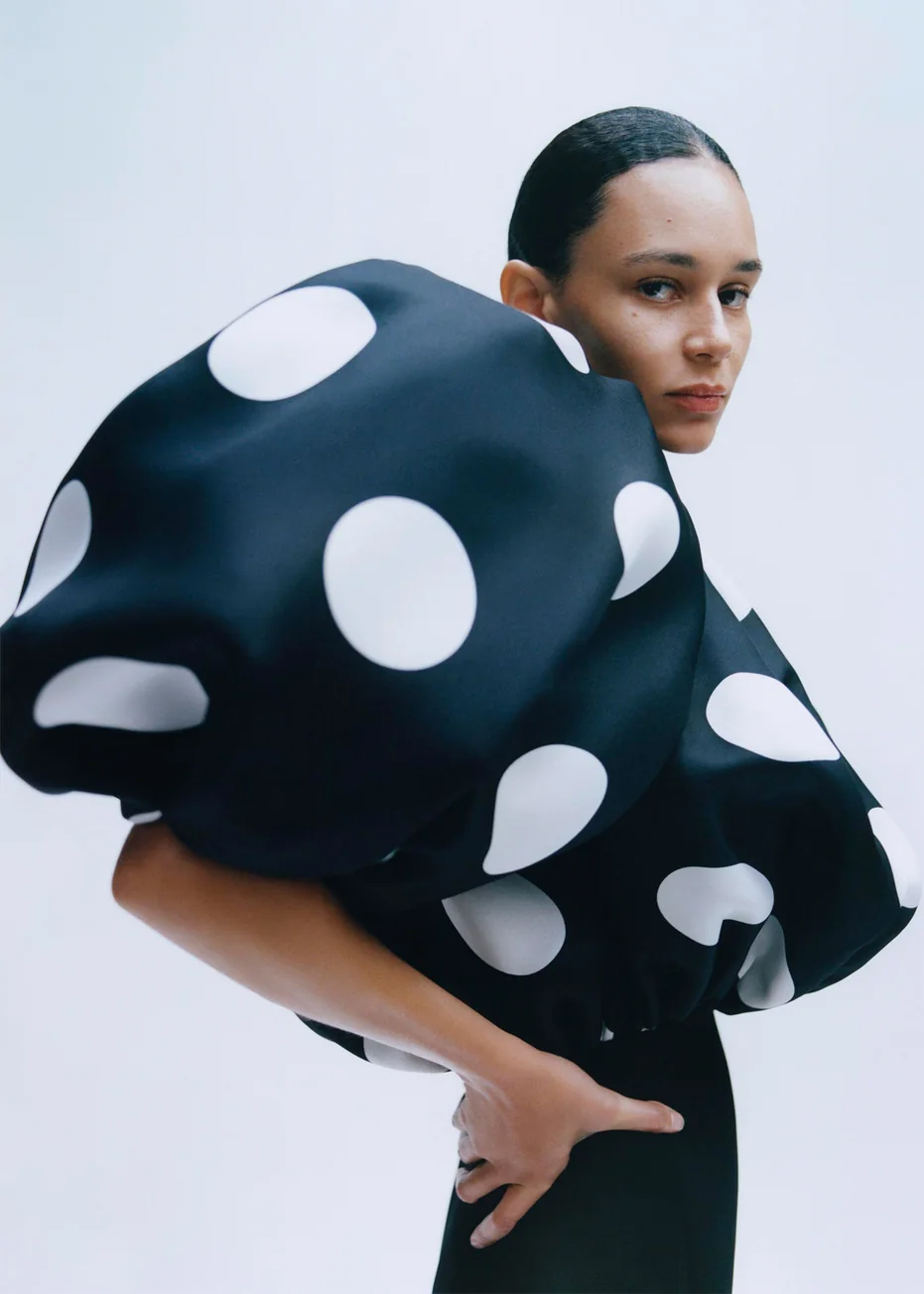 Khaite’s exploration of “new noir” emerges not through overt darkness, but through subtle psychological charge. The oversized polka-dot form, cocooning yet ambiguous, introduces a surreal interruption—an object that blurs the boundary between garment and sculpture. It’s one of the few moments where the campaign steps outside its controlled language, hinting at a more experimental instinct beneath the brand’s typically disciplined aesthetic.