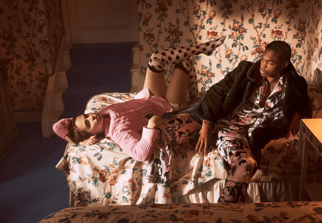 This comes through in the corresponding campaign, photographed by Alice Hawkins, that depicts a crew of friends finding ways to dress up and entertain themselves. Among the key groupings: a reworked Liberty motif in olive green applied to smocked shirt dresses and woven button-front tops; workwear coats in versatile Moleskine; and classic cardigans and jumpers – some in fisherman knit, others placed with jacquard graphics – in soft shades of blush, sea foam and powder blue. Often, the pieces are layered nonchalantly to create ensembles that convey cozy cool. An additional statement print features collaged vintage black and white photos that pay homage to Harajuku youth culture from the 1970s. On a jacket trimmed with faux fur, the effect is bold and original.
