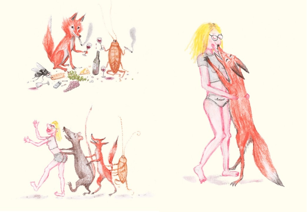 Naturally, at this house, the Kitsuné Fox plays host. Look no further than the season’s illustrations by New York artist, Aurel Schmidt, whose meticulous drawings are at once amusing and twisted in nature. Here, she depicts our Iconic Fox carousing with various surprise guests including a cockroach and a rat. These lively scenes appear on core jersey pieces and as an all-over print on pajama-style separates, sending the message that even household pests like to party.