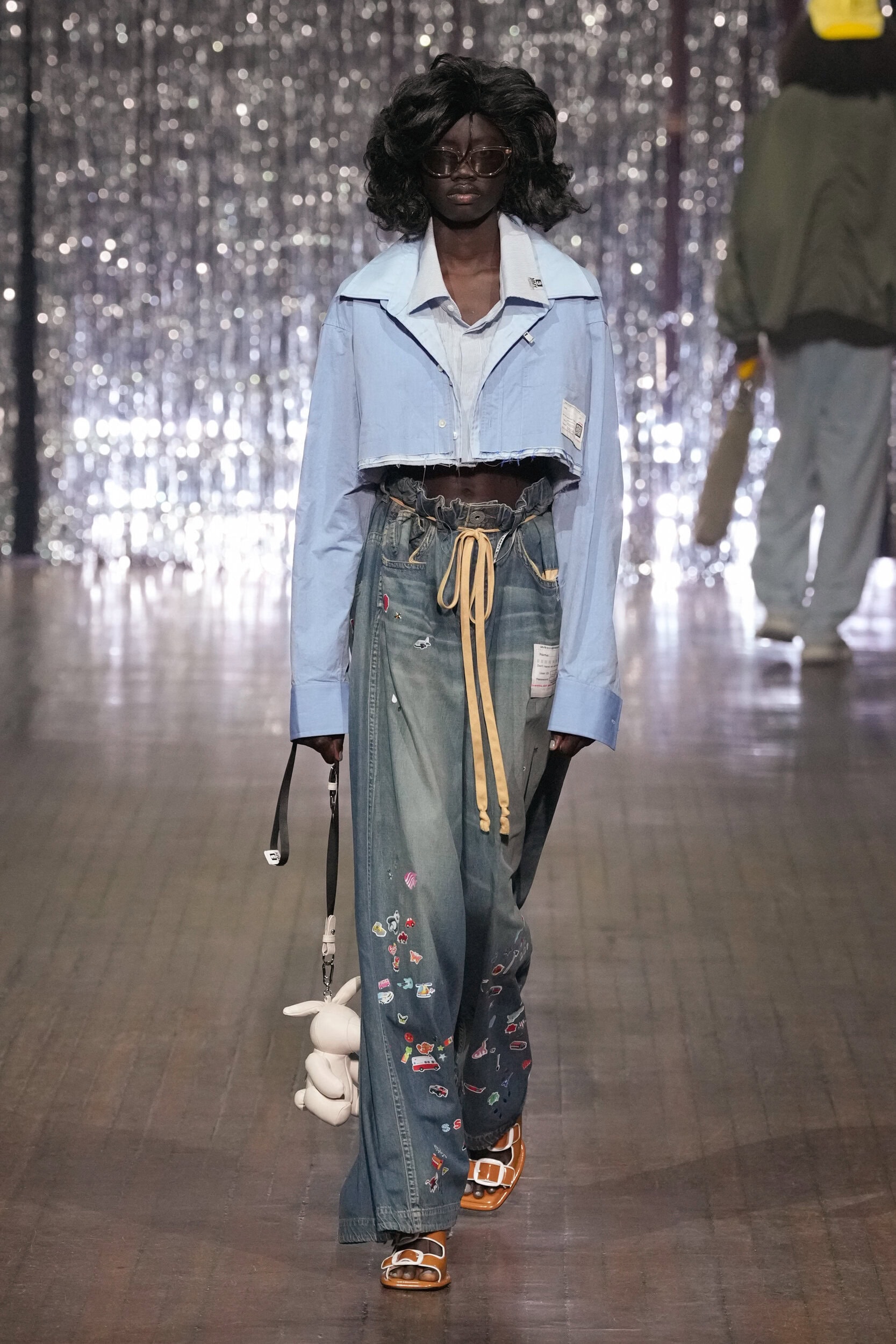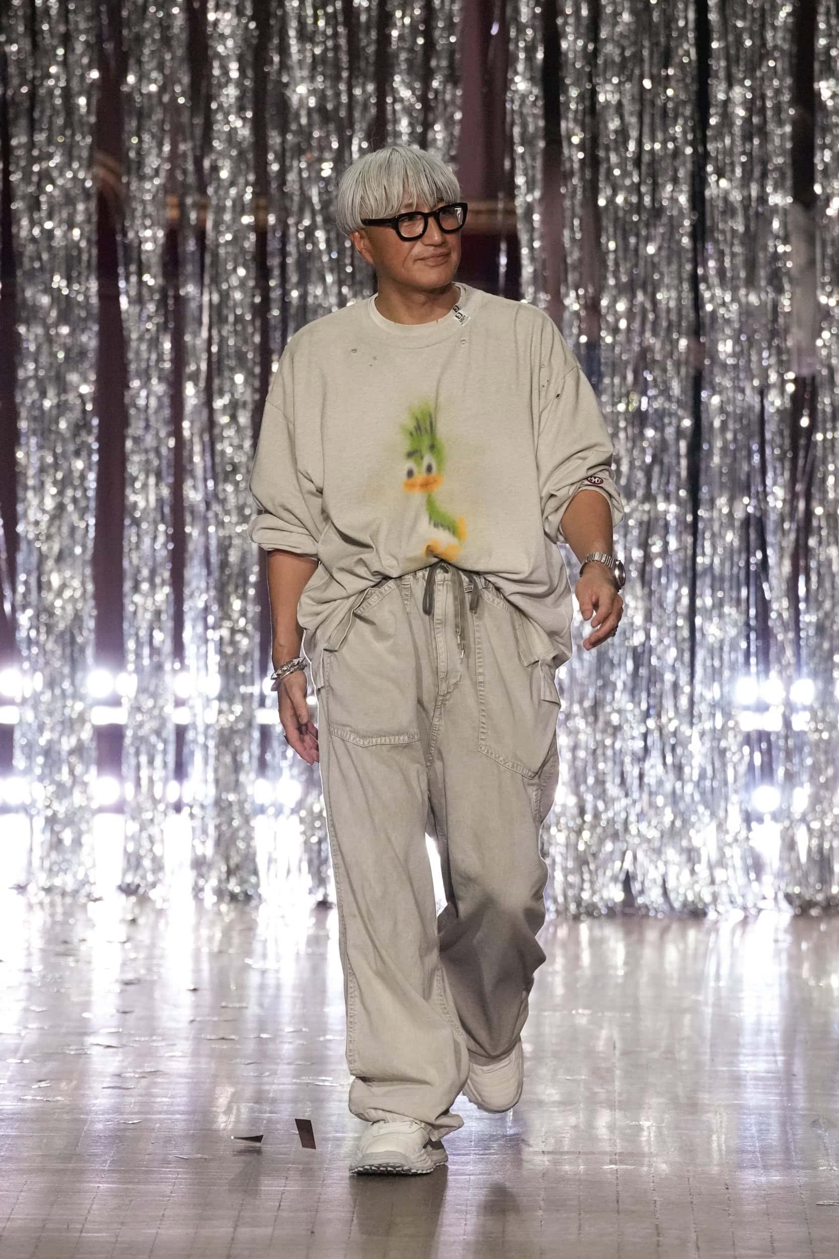 In this collection, Yasuhiro focused on the details at the rear of his designs, making them impossible to capture fully in photographs typically seen on the runway. Oversize proportions took a backseat as baggy jeans and jogging pants were sewn onto matching Bermuda shorts. Shirts were repurposed as dresses and capes, while denim and sportswear pieces featured childlike sticker motifs and distressed knitwear.