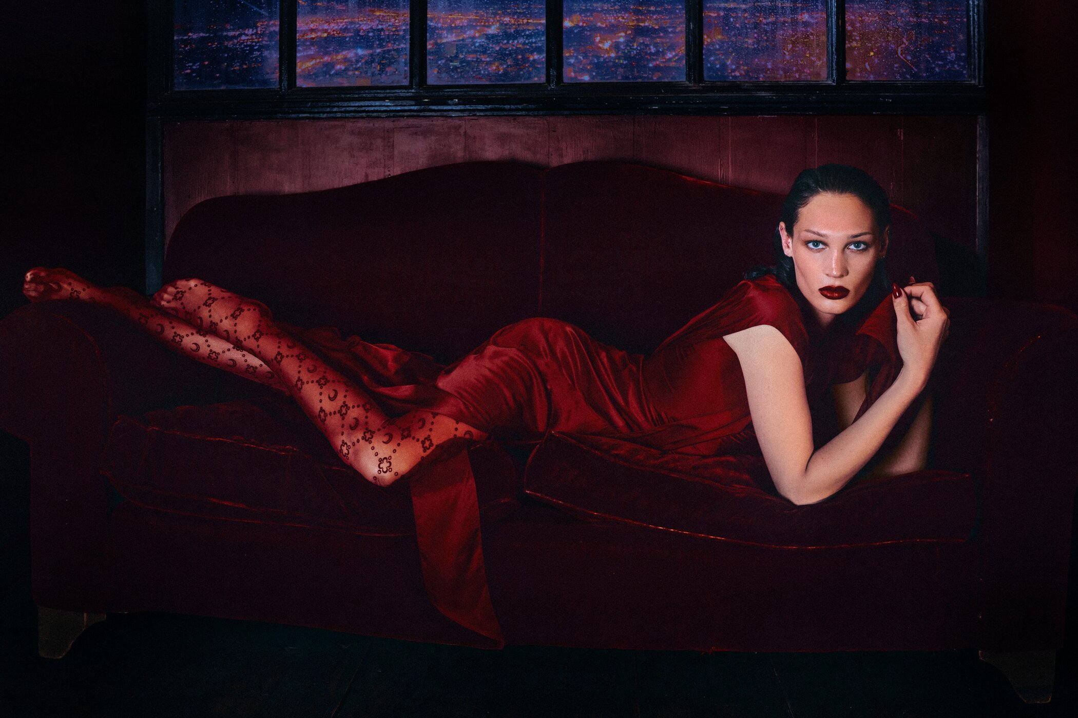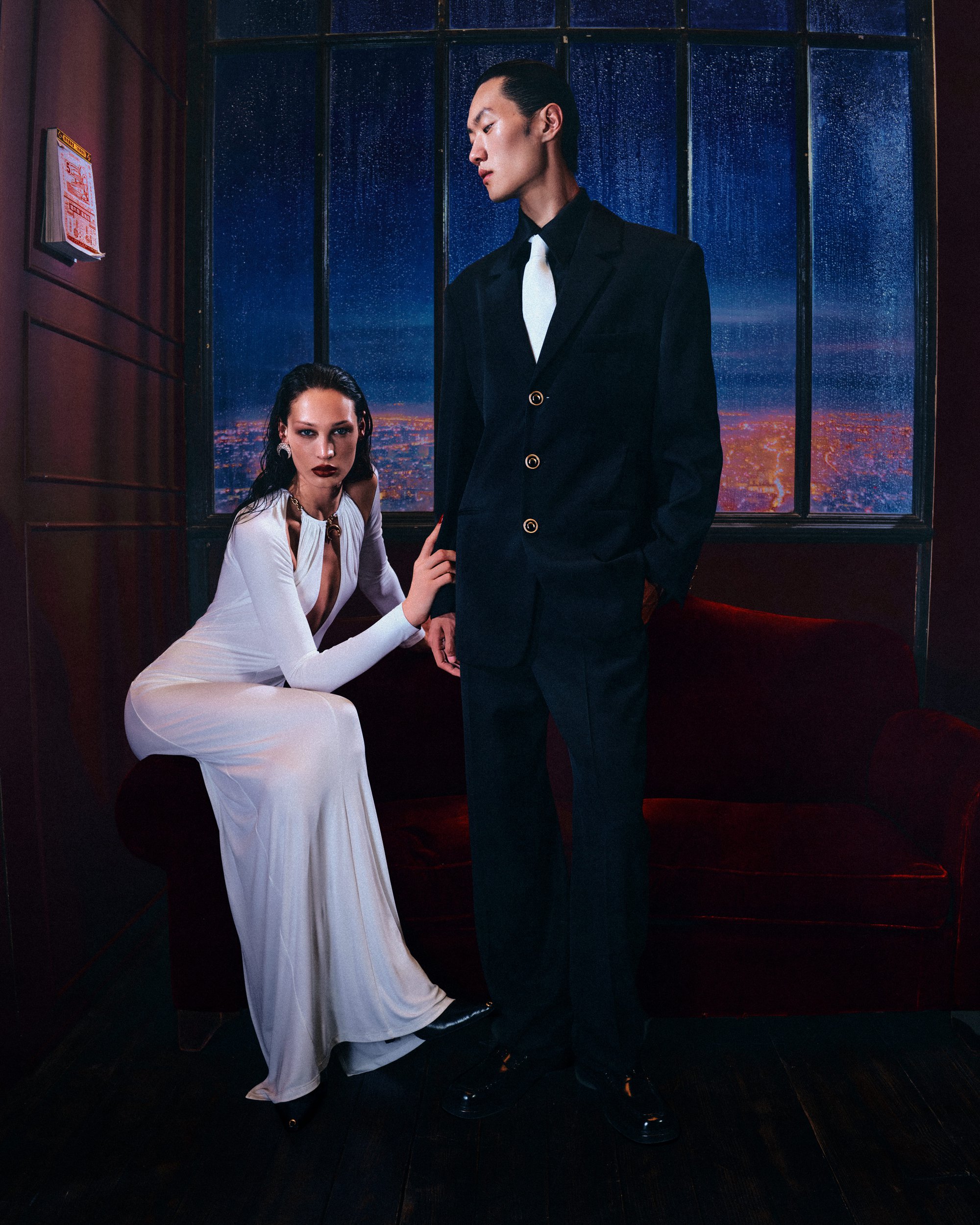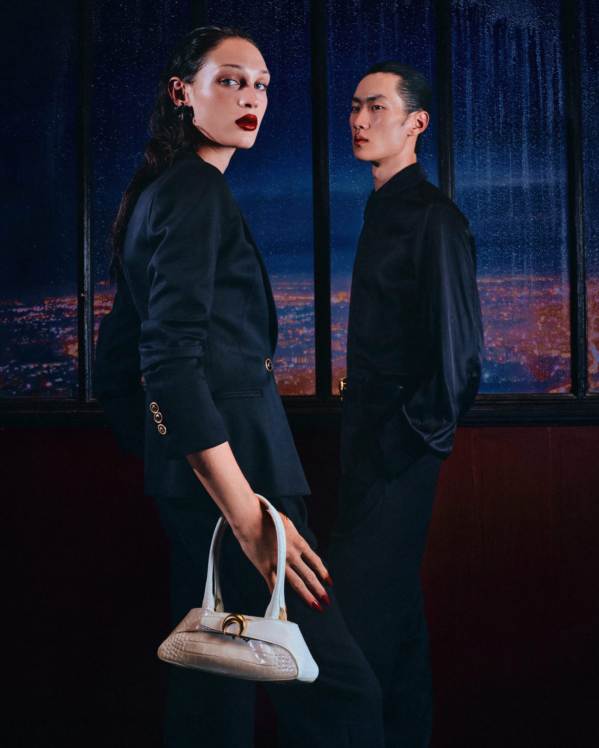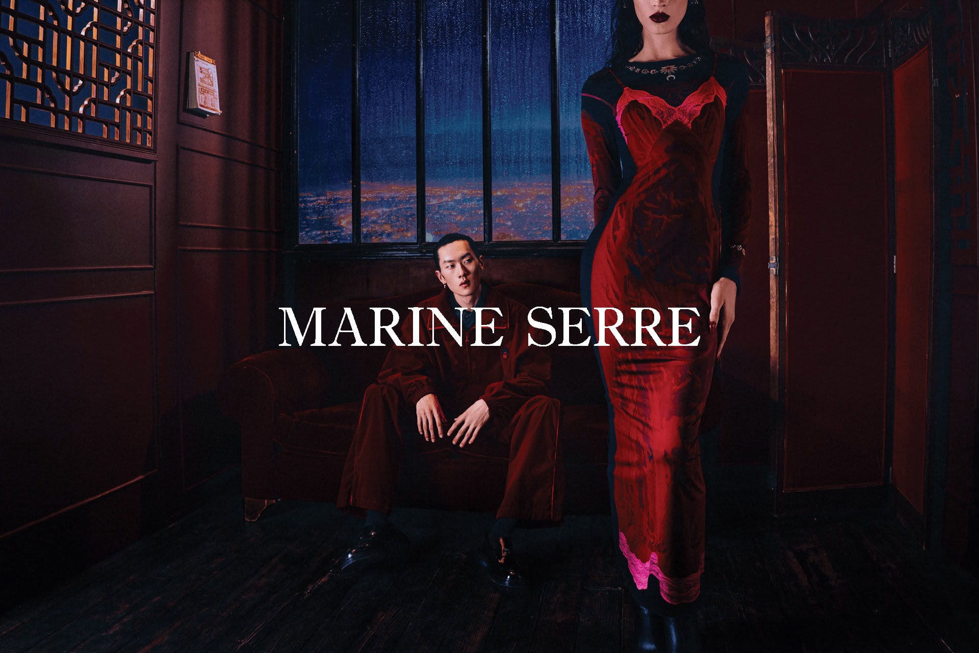The third act, set in Shanghai, distills this spirit with hypnotic precision. Framed in velvet reds and navy shadows, the imagery recalls Wong Kar Wai’s cinematic grammar—restrained, tactile, and charged with unspoken tension. The dialogue here is corporeal: a hand tracing a seam, a glance caught between reflection and desire. The silhouettes—sharp shoulders, cinched waists, sculptural tailoring—appear less worn than inhabited, as if the clothing were extensions of thought. Burgundy and scarlet tones pulse against the darkness, creating a chiaroscuro that feels at once nostalgic and futuristic. Serre transforms fashion into performance, a choreography of emotion translated through structure.
